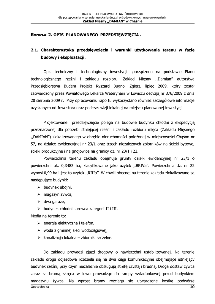 RAPORT ODDZIAŁYWANIA NA ŚRODOWISKO dla postępowania w sprawie uzyskania decyzji o środowiskowych uwarunkowaniach Zakład Mięsny ,,DAMIAN” w Chąśnie ROZDZIAŁ 2. OPIS PLANOWANEGO PRZEDSIĘWZIĘCIA . 2.1. Charakterystyka przedsięwzięcia i warunki użytkowania terenu w fazie budowy i eksploatacji. Opis techniczny i technologiczny inwestycji sporządzono na podstawie Planu technologicznego rzeźni i zakładu rozbioru. Zakład Mięsny ,,Damian” autorstwa Przedsiębiorstwa Budem Projekt Ryszard Bugno, Zgierz, lipiec 2009, który został zatwierdzony przez Powiatowego Lekarza Weterynarii w Łowiczu decyzją nr 376/2009 z dnia 20 sierpnia 2009 r. Przy opracowaniu raportu wykorzystano również szczegółowe informacje uzyskanych od Inwestora oraz podczas wizji lokalnej na miejscu planowanej inwestycji. Projektowane przedsięwzięcie polega na budowie budynku chłodni z ekspedycją przeznaczonej dla potrzeb istniejącej rzeźni i zakładu rozbioru mięsa (Zakładu Mięsnego ,,DAMIAN”) zlokalizowanego w obrębie nieruchomości położonej w miejscowości Chąśno nr 57, na działce ewidencyjnej nr 23/1 oraz trzech niezależnych zbiorników na ścieki bytowe, ścieki produkcyjne i na gnojowicę na granicy dz. nr 23/1 i 22. Powierzchnia terenu zakładu obejmuje grunty działki ewidencyjnej nr 23/1 o powierzchni ok. 0,3482 ha, klasyfikowane jako użytek ,,BRIVa”. Powierzchnia dz. nr 22 wynosi 0,99 ha i jest to użytek ,,RIIIa”. W chwili obecnej na terenie zakładu zlokalizowane są następujące budynki: budynek ubojni, magazyn żywca, dwa garaże, budynek chłodni surowca kategorii II i III. Media na terenie to: energia elektryczna i telefon, woda z gminnej sieci wodociągowej, kanalizacja lokalna – zbiorniki szczelne. Do zakładu prowadzi zjazd drogowy o nawierzchni ustabilizowanej. Na terenie zakładu droga dojazdowa rozdziela się na dwa ciągi komunikacyjne obejmujące istniejący budynek rzeźni, przy czym niezależnie obsługują strefę czystą i brudną. Droga dostaw żywca zaraz za bramą skręca w lewo prowadząc do rampy wyładunkowej przed budynkiem magazynu Geotechnika żywca. Na wprost bramy rozciąga się utwardzone kostką podwórze 10 RAPORT ODDZIAŁYWANIA NA ŚRODOWISKO dla postępowania w sprawie uzyskania decyzji o środowiskowych uwarunkowaniach Zakład Mięsny ,,DAMIAN” w Chąśnie ogólnodostępne, stanowiące wjazd na parking oraz dalej do strefy czystej i stanowisk ekspedycji. Podwórze stanowi jednocześnie niezbędny dojazd do zbiorników szczelnych dla wozów asenizacyjnych. Na tylnim dziedzińcu mieści się stanowisko mycia środków transportu żywca i sprzętu zewnętrznego. Również po tej stronie budynku głównego, z chłodzonego magazynu, odbierane są odpady produkcyjne stanowiące surowiec kat. II i III. Obsługa klientów oraz transport wyrobów poza teren Zakładu odbywa się od strony frontowej i bocznej, po wschodniej stronie budynku głównego (strefa czysta). Nawierzchnie dróg wewnętrznych są utwardzone i skanalizowane. Teren Zakładu jest wydzielony ogrodzeniem oraz zabezpieczony przed wtargnięciem zwierząt oraz osób niepowołanych wraz ze zdalnie sterowaną bramą wjazdową. Obecne zagospodarowanie terenu Zakładu na mapie sytuacyjno-wysokościowej w skali 1:1000 przedstawia rysunek nr 1 oraz panoramy terenu zakładu rysunek nr 2. Projektowany budynek chłodni o powierzchni ok. 70 m2 dobudowany zostanie do wschodniej ściany budynku masarni. W jego obrębie zostanie wydzielone pomieszczenie chłodni (na ok. 96 półtusz, tj. 3,7 tony), jeliciarnia oraz pomieszczenie ekspedycji. W ramach modernizacji Zakładu wykonane zostaną również trzy niezależne zbiorniki na ścieki: bytowe, ścieki produkcyjne i na gnojowicę. Zagospodarowanie terenu Zakładu po zakończeniu procesu inwestycyjnego na mapie sytuacyjno-wysokościowej w skali 1:500 przedstawia rysunek nr 3. W Zakładzie będą znajdować się: pomieszczenia do przechowywania żywca wieprzowego, z których jedno, w razie konieczności będzie pełnić funkcję izolatki, stanowisko badania przedubojowego, korytarz przepędowy, boks oszałamiania, pomieszczenia ubojowe podzielone na strefy: brudną i czystą, pomieszczenia do przechowywania na wisząco półtusz wieprzowych (wyposażone w urządzenia chłodnicze) z wydzielonym, zamykanym torem kolejki jako strefy mięsa czasowo zajętego, pomieszczenia do przechowywania na wisząco oraz w pojemnikach ośrodków wieprzowych (wyposażone w urządzenia chłodnicze), pomieszczenia do ekspedycji towaru na kolejkach lub w pojemnikach, wyposażone w Geotechnika 11 RAPORT ODDZIAŁYWANIA NA ŚRODOWISKO dla postępowania w sprawie uzyskania decyzji o środowiskowych uwarunkowaniach Zakład Mięsny ,,DAMIAN” w Chąśnie fartuchowy dok przeładunkowy, magazyn surowców kat. II i III wyposażony w urządzenia chłodnicze, myjnia haków przy śluzie wejściowej w strefę brudną, myjnia pojemników i sprzętu ruchomego, wydzielony magazyn pojemników czystych, pomieszczenie porządkowe – magazynek środków myjących i odkażających oraz przygotowywanie roztworów dezynfekcyjnych, szatnie przepustowe dla personelu wewnętrznego, pomieszczenia socjalne dla personelu zewnętrznego, pomieszczenie dla lekarza weterynarii, rozdzielczy system kanalizacji sanitarnej, technologicznej i gnojowicowej, stanowisko mycia samochodów dostawczych (strefa brudna). Pojemność podstawowych pomieszczeń magazynowych wyniesie: magazyn żywca wieprzowego maksymalnie 50 sztuk, magazyn-chłodnia półtusz wieprzowych (na wisząco) 92 półtusze, tj. 5,6 ton, magazyn podrobów (ośrodki na wisząco) 0,8 tony, magazyn podrobów (w pojemnikach) 0,9 tony, magazyn wyrobów gotowych-mięso w pojemnikach 122 półtusze, tj. 5,1 tony, magazyn – chłodnia półtusz wieprzowych (na wisząco) 122 półtusze, tj. 5,1 tony. Rozkład pomieszczeń w zakładzie wraz ze schematem projektowanego systemu kanalizacji przedstawia rysunek nr 4. Podstawowe ciągi technologi