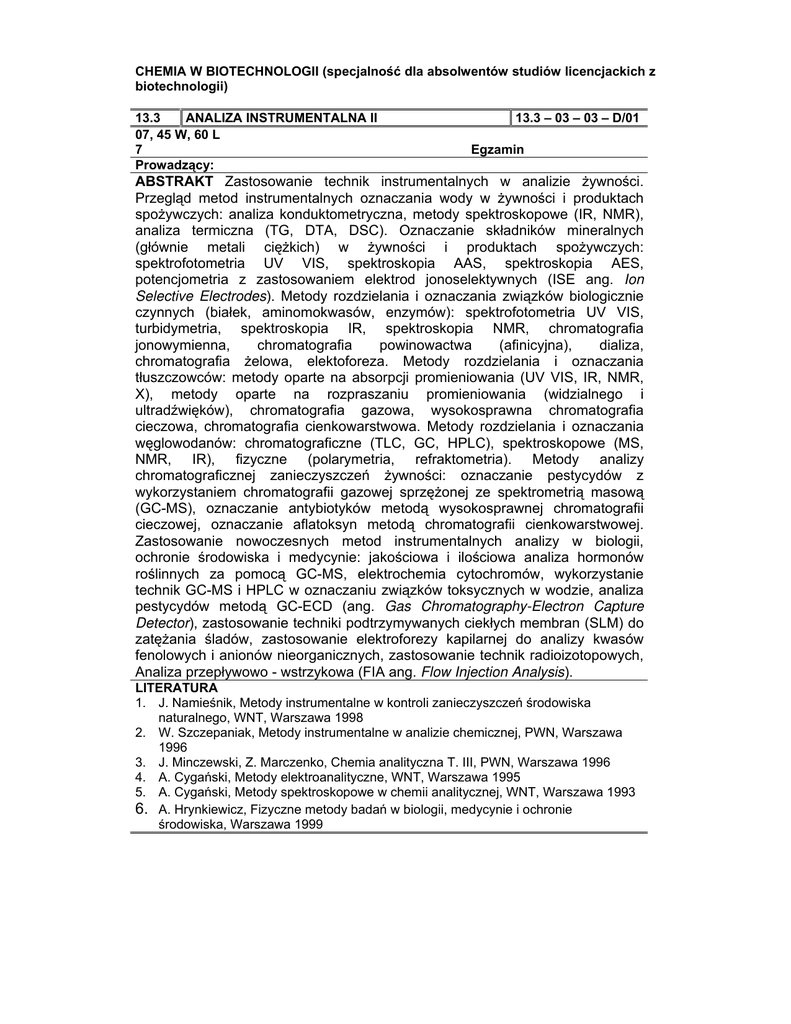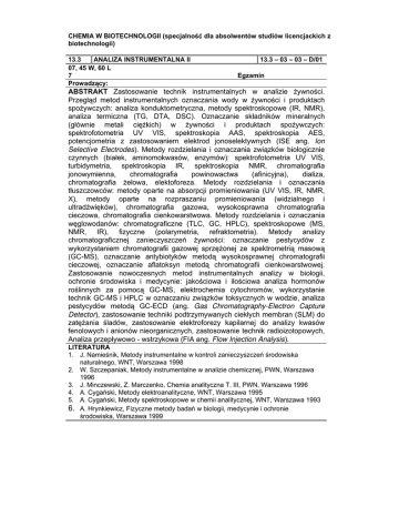 CHEMIA W BIOTECHNOLOGII (specjalnoW5 dla absolwentów studiów licencjackich z biotechnologii) 13.3 ANALIZA INSTRUMENTALNA II 07, 45 W, 60 L 7 Prowadz>cy: 13.3 – 03 – 03 – D/01 Egzamin ABSTRAKT Zastosowanie technik instrumentalnych w analizie cywnoWci. Przegl>d metod instrumentalnych oznaczania wody w cywnoWci i produktach spocywczych: analiza konduktometryczna, metody spektroskopowe (IR, NMR), analiza termiczna (TG, DTA, DSC). Oznaczanie skŽadników mineralnych (gŽównie metali ciCckich) w cywnoWci i produktach spocywczych: spektrofotometria UV VIS, spektroskopia AAS, spektroskopia AES, potencjometria z zastosowaniem elektrod jonoselektywnych (ISE ang. Ion Selective Electrodes). Metody rozdzielania i oznaczania zwi>zków biologicznie czynnych (biaŽek, aminomokwasów, enzymów): spektrofotometria UV VIS, turbidymetria, spektroskopia IR, spektroskopia NMR, chromatografia jonowymienna, chromatografia powinowactwa (afinicyjna), dializa, chromatografia celowa, elektoforeza. Metody rozdzielania i oznaczania tŽuszczowców: metody oparte na absorpcji promieniowania (UV VIS, IR, NMR, X), metody oparte na rozpraszaniu promieniowania (widzialnego i ultradawiCków), chromatografia gazowa, wysokosprawna chromatografia cieczowa, chromatografia cienkowarstwowa. Metody rozdzielania i oznaczania wCglowodanów: chromatograficzne (TLC, GC, HPLC), spektroskopowe (MS, NMR, IR), fizyczne (polarymetria, refraktometria). Metody analizy chromatograficznej zanieczyszczeM cywnoWci: oznaczanie pestycydów z wykorzystaniem chromatografii gazowej sprzCconej ze spektrometri> masow> (GC-MS), oznaczanie antybiotyków metod> wysokosprawnej chromatografii cieczowej, oznaczanie aflatoksyn metod> chromatografii cienkowarstwowej. Zastosowanie nowoczesnych metod instrumentalnych analizy w biologii, ochronie Wrodowiska i medycynie: jakoWciowa i iloWciowa analiza hormonów roWlinnych za pomoc> GC-MS, elektrochemia cytochromów, wykorzystanie technik GC-MS i HPLC w oznaczaniu zwi>zków toksycznych w wodzie, analiza pestycydów metod> GC-ECD (ang. Gas Chromatography-Electron Capture Detector), zastosowanie techniki podtrzymywanych ciekŽych membran (SLM) do zatCcania Wladów, zastosowanie elektroforezy kapilarnej do analizy kwasów fenolowych i anionów nieorganicznych, zastosowanie technik radioizotopowych, Analiza przepŽywowo - wstrzykowa (FIA ang. Flow Injection Analysis). LITERATURA 1. J. NamieWnik, Metody instrumentalne w kontroli zanieczyszczeM Wrodowiska naturalnego, WNT, Warszawa 1998 2. W. Szczepaniak, Metody instrumentalne w analizie chemicznej, PWN, Warszawa 1996 3. J. Minczewski, Z. Marczenko, Chemia analityczna T. III, PWN, Warszawa 1996 4. A. CygaMski, Metody elektroanalityczne, WNT, Warszawa 1995 5. A. CygaMski, Metody spektroskopowe w chemii analitycznej, WNT, Warszawa 1993 6. A. Hrynkiewicz, Fizyczne metody badaM w biologii, medycynie i ochronie Wrodowiska, Warszawa 1999 13.3 CHEMIA FIZYCZNA II 07, 45 W, 30 K, 45 L 9 Prowadz>cy: 13.3 – 03 – 03 – D/02 Egzamin ABSTRAKT AktywnoW5 1-ego rodzaju, dyfuzja, ciWnienie osmotyczne, rozpuszczalnoW5, ad i absorpcja, ukŽady koloidowe, fizykochemia koloidów. Cz>steczkowoW5 etapu a rzCdowoW5, typy reaktorów a metody prowadzenia reakcji, definicje szybkoWci reakcji nieod-wracalnych i odwracalnych, kompleks aktywny a zalecnoW5 temperaturowa szybkoWci reakcji, reakcje jednonocz>steczkowe, wybuchowe, reakcje w ukŽadach wielofazowych. Kataliza jedno-fazowa i kontaktowa, izotermy adsorpcji., mechanizmy dziaŽania. Przewodnictwo wŽaWciwe i równowacnikowe, dysocjacja elektrolityczna a moc elektrolitu, wŽasnoWci granicy faz, rócnica potencjaŽów dwóch faz. Ogniwa galawaniczne, póŽogniwa, potencjaŽ elektrod, termodynamika ogniw galwanicznych, ogniwa jako cródŽa pr>du. Kinetyka elektrochemiczna, wydzielanie metalu, polarografia, pasywacja metali i korozja. LITERATURA 1. K. GumiMski, WykŽady z chemii fizycznej, PWN, Warszawa 2. G. M. Barrow, Chemia Fizyczna, PWN, Warszawa 1973 3. K. PigoM i Z. Ruziewicz, Chemia Fizyczna, PWN, Warszawa 1980 4. A. Tomassi i inni, Chemia Fizyczna, PWN, Warszawa 5. Z. Kisza, Chemia Fizyczna dla biologów, PWN, Warszawa 13.3 CHEMIA POLIMERÓW 10, 30 W, 15 K 4 Prowadz>cy: 13.3 – 03 – 03 – D/03 Egzamin ABSTRAKT Podstawowe pojCcia w chemii polimerów (polimer, polimery naturalne, polimery syntetyczne). Klasyfikacja polimerów (polimery karboŽaMcuchowe, polimery heteroŽaMcuchowe, poliolefiny, polimery winylowe, poliestry, poliamidy). Polimeryzacja i polikondensacja. Polimeryzacja rodnikowa (przebieg polimeryzacji rodnikowej, inicjowanie bezpoWrednie i poWrednie, inhibitory). Polimeryzacja jonowa (ogólna charakterystyka, polimeryzacja kationowa i anionowa). Polimeryzacja kondensacyjna (heteropolikondensacja, homopolikondensacja, zapocz>tkowanie i wzrost ŽaMcucha). Kopolimeryzacja. GŽówne metody syntezy polimerów. ReaktywnoW5 zwi>zków wielkocz>steczkowych. LITERATURA 1. J. W. Nicholson, Chemia polimerów, WNT, Warszawa 1996 13.3 CHEMIA ORGANICZNA II 7, 15 W, 30 K 3 Prowadz>cy: 13.3 – 03 – 03 – D/04 Egzamin ABSTRAKT Mechanizmy wybranych reakcji organicznych; Kinetyczne i stereochemiczne aspekty reakcji SN2, SN1, SN2’, E1, E2. Aspekty syntetyczne. Reaktywne ukŽady przejWciowe; karbokationy, karboaniony, wolne rodniki, karbeny i nitreny. Podstawy chemii heteroatomów; organiczne pochodne kwasów piCcio i trójwartoWciowego fosforu, wybrane pochodne siarko, seleno i krzemoorganicze, syntezy i wykorzystanie w syntezie organicznej. Wybrane problemy chemii metaloorganicznej; odczynniki magnezo, lito i cynkoorganiczne, podstawy chemii i wykorzystanie w syntezie organicznej. Niekonwencjonalne metody syntezy organicznej; reakcje w PTC oraz pod wpŽywem naWwietlania mikrofalowego i ultradawiCkowego, reakcje przebiegaj>ce pod wpŽywem wysokich ciWnieM i w cieczach jonowych oraz na podŽocu staŽym. Synteza asymetryczna; pojCcia podstawowe: stechiometryczne i katalityczne wersje reakcji syntezy asymetrycznej. LITERATURA 1. 