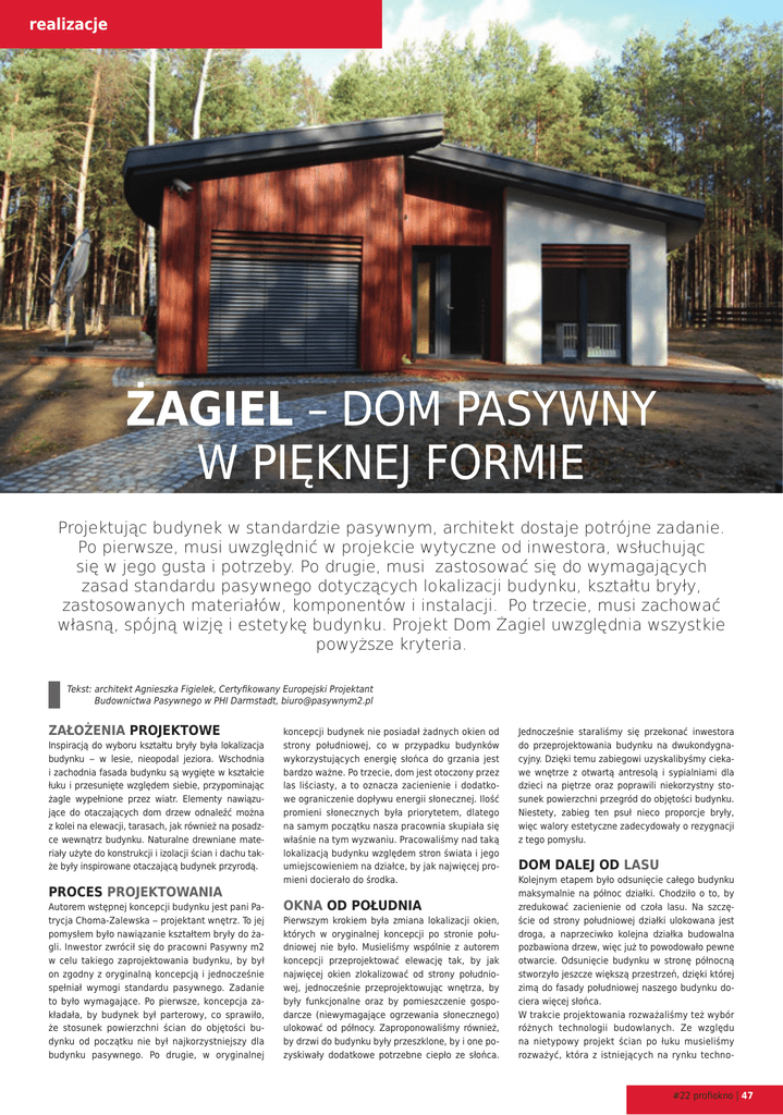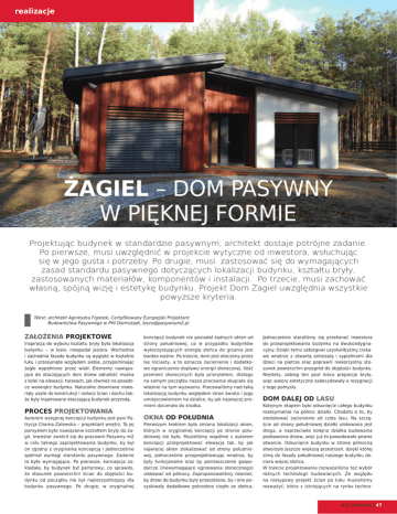 realizacje ŻAGIEL – DOM PASYWNY W PIĘKNEJ FORMIE Projektując budynek w standardzie pasywnym, architekt dostaje potrójne zadanie. Po pierwsze, musi uwzględnić w projekcie wytyczne od inwestora, wsłuchując się w jego gusta i potrzeby. Po drugie, musi zastosować się do wymagających zasad standardu pasywnego dotyczących lokalizacji budynku, kształtu bryły, zastosowanych materiałów, komponentów i instalacji. Po trzecie, musi zachować własną, spójną wizję i estetykę budynku. Projekt Dom Żagiel uwzględnia wszystkie powyższe kryteria. Tekst: a rchitekt Agnieszka Figielek, Certyfikowany Europejski Projektant Budownictwa Pasywnego w PHI Darmstadt, [email protected] ZAŁOŻENIA PROJEKTOWE Inspiracją do wyboru kształtu bryły była lokalizacja budynku ‒ w lesie, nieopodal jeziora. Wschodnia i zachodnia fasada budynku są wygięte w kształcie łuku i przesunięte względem siebie, przypominając żagle wypełnione przez wiatr. Elementy nawiązujące do otaczających dom drzew odnaleźć można z kolei na elewacji, tarasach, jak również na posadzce wewnątrz budynku. Naturalne drewniane materiały użyte do konstrukcji i izolacji ścian i dachu także były inspirowane otaczającą budynek przyrodą. PROCES PROJEKTOWANIA Autorem wstępnej koncepcji budynku jest pani Patrycja Choma-Zalewska ‒ projektant wnętrz. To jej pomysłem było nawiązanie kształtem bryły do żagli. Inwestor zwrócił się do pracowni Pasywny m2 w celu takiego zaprojektowania budynku, by był on zgodny z oryginalną koncepcją i jednocześnie spełniał wymogi standardu pasywnego. Zadanie to było wymagające. Po pierwsze, koncepcja zakładała, by budynek był parterowy, co sprawiło, że stosunek powierzchni ścian do objętości budynku od początku nie był najkorzystniejszy dla budynku pasywnego. Po drugie, w oryginalnej koncepcji budynek nie posiadał żadnych okien od strony południowej, co w przypadku budynków wykorzystujących energię słońca do grzania jest bardzo ważne. Po trzecie, dom jest otoczony przez las liściasty, a to oznacza zacienienie i dodatkowe ograniczenie dopływu energii słonecznej. Ilość promieni słonecznych była priorytetem, dlatego na samym początku nasza pracownia skupiała się właśnie na tym wyzwaniu. Pracowaliśmy nad taką lokalizacją budynku względem stron świata i jego umiejscowieniem na działce, by jak najwięcej promieni docierało do środka. OKNA OD POŁUDNIA Pierwszym krokiem była zmiana lokalizacji okien, których w oryginalnej koncepcji po stronie południowej nie było. Musieliśmy wspólnie z autorem koncepcji przeprojektować elewację tak, by jak najwięcej okien zlokalizować od strony południowej, jednocześnie przeprojektowując wnętrza, by były funkcjonalne oraz by pomieszczenie gospodarcze (niewymagające ogrzewania słonecznego) ulokować od północy. Zaproponowaliśmy również, by drzwi do budynku były przeszklone, by i one pozyskiwały dodatkowe potrzebne ciepło ze słońca. Jednocześnie staraliśmy się przekonać inwestora do przeprojektowania budynku na dwukondygnacyjny. Dzięki temu zabiegowi uzyskalibyśmy ciekawe wnętrze z otwartą antresolą i sypialniami dla dzieci na piętrze oraz poprawili niekorzystny stosunek powierzchni przegród do objętości budynku. Niestety, zabieg ten psuł nieco proporcje bryły, więc walory estetyczne zadecydowały o rezygnacji z tego pomysłu. DOM DALEJ OD LASU Kolejnym etapem było odsunięcie całego budynku maksymalnie na północ działki. Chodziło o to, by zredukować zacienienie od czoła lasu. Na szczęście od strony południowej działki ulokowana jest droga, a naprzeciwko kolejna działka budowalna pozbawiona drzew, więc już to powodowało pewne otwarcie. Odsunięcie budynku w stronę północną stworzyło jeszcze większą przestrzeń, dzięki której zimą do fasady południowej naszego budynku dociera więcej słońca. W trakcie projektowania rozważaliśmy też wybór różnych technologii budowlanych. Ze względu na nietypowy projekt ścian po łuku musieliśmy rozważyć, która z istniejących na rynku techno- #22 profiokno | 47 W domu zastosowane są certyfikowane okna pasywne Elwiz energio passiv logii będzie najszybsza, najbardziej ekonomiczna i najprostsza do wykonania. Po przeanalizowaniu kilku opcji wybraliśmy technologię drewnianą, która dodatkowo ma taką zaletę, że jest technologią naturalną wpisującą się do leśnego otoczenia działki. KOSZTY Po zakończeniu etapu koncepcyjnego przygotowaliśmy dla inwestora zapytania ofertowe na poszczególne komponenty. Na podstawie przysłanych ofert mogliśmy oszacować całkowity koszt inwestycji zarówno dla budynku w standardzie pasywnym, jak i standardzie energooszczędnym. Choć koszt budynku przekroczył nieco założony od początku budżet, cena budynku w standardzie pasywnym i w standardzie energooszczędnym była porównywalna. W tym przypadku koszty robocizny w obydwu standardach byłyby takie same, a różnica w cenach materiałów była niewielka. Najdroższe (ale takie same w obu standardach) okazały się koszty związane z wykończeniem dachu (blacha na rąbek stojący), elewacji (drewno egzotyczne) czy samego wnętrza. Inwestorzy podjęli więc decyzję, by nie rezygnować ze standardu pasywnego, a oszczędności uzyskać poprzez zmniejszenie powierzchni użytkowej budynku. Procedura zmniejszenia budynku wymagała dodatkowej pracy projektowej. Ponownie należało wytyczyć położenie budynku na działce, ustalić miejsce okien oraz przeanalizować użyte materiały i komponenty. Dzięki temu projekt zamknął się jednak w zakładanym budżecie. TECHNOLOGIA BUDOWY Dom Żagiel posadowiony jest na płycie fundamentowej, zaizolowanej ze wszystkich stron styropianem. Grubość styropianu pod płytą to 40 cm, co daje współczynnik przenikania ciepła 48 | profiokno #22 od fundamentu U=0,081 W/m2K. Konstrukcja ścian i dachu wykonana zostanie z drewna (belka dwuteowa) wypeł