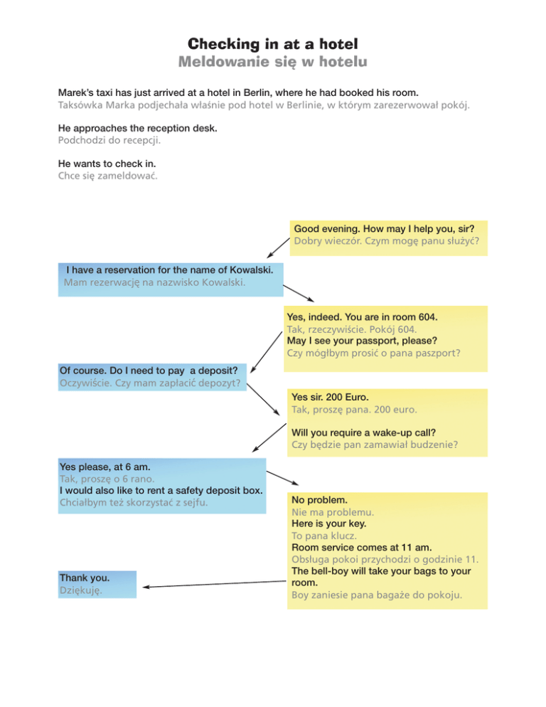 Checking in at a hotel Meldowanie się w hotelu Marek’s taxi has just arrived at a hotel in Berlin, where he had booked his room. Taksówka Marka podjechała właśnie pod hotel w Berlinie, w którym zarezerwował pokój. He approaches the reception desk. Podchodzi do recepcji. He wants to check in. Chce się zameldować. Good evening. How may I help you, sir? Dobry wieczór. Czym mogę panu służyć? I have a reservation for the name of Kowalski. Mam rezerwację na nazwisko Kowalski. Yes, indeed. You are in room 604. Tak, rzeczywiście. Pokój 604. May I see your passport, please? Czy mógłbym prosić o pana paszport? Of course. Do I need to pay a deposit? Oczywiście. Czy mam zapłacić depozyt? Yes sir. 200 Euro. Tak, proszę pana. 200 euro. Will you require a wake-up call? Czy będzie pan zamawiał budzenie? Yes please, at 6 am. Tak, proszę o 6 rano. I would also like to rent a safety deposit box. Chciałbym też skorzystać z sejfu. Thank you. Dziękuję. No problem. Nie ma problemu. Here is your key. To pana klucz. Room service comes at 11 am. Obsługa pokoi przychodzi o godzinie 11. The bell-boy will take your bags to your room. Boy zaniesie pana bagaże do pokoju. Details and Explanations Szczegóły i wyjaśnienia Tell the receptionist about your reservation or show a computer printout (if you made the reservation by internet). Powiedz recepcjoniście/stce o rezerwacji albo pokaż wydruk z komputera (jeżeli robiłeś rezerwację przez internet). The receptionist will probably photo-copy your passport or note the passport number. Recepcjonista/tka prawdopodobnie skopiuje twój paszport albo zanotuje numer paszportu. If you need to fill in a form, see unit Personal details. Jeżeli będziesz musiał wypełnić formularz, skorzystaj z części Dane osobowe. The hotel will require some form of security. The amount depends on the hotel. Hotel będzie wymagał jakiegoś zabezpieczenia. Suma zależy od hotelu. The receptionist will probably ask you if you require any of the typical hotel services. Recepcjonista/tka prawdopodobnie zapyta, czy bęziesz chciał skorzystać z typowych usług hotelowych. If you do not want anyone going into your room, hang the “do not disturb” sign Jeżeli nie chcesz, żeby ktokolwiek wchodził do twojego pokoju, zawieś znak “nie przeszkadzaj” on the outside door handle in your room. na klamce na zewnątrz. In most countries, it is a custom to tip the bell-boy. W większości krajów jest przyjęte dać napiwek boyowi. Template Szablon Good evening. How may I help you, sir? Dobry wieczór. Czym mogę panu służyć? 1. ______________________________. ______________________________. Yes, sir. 2. _______________. Tak, proszę pana. _______________. 3 Of course. Do I need to 4__________? Oczywiście. Czy mam __________? . __________________, please? Czy mógłbym prosić o______________? Yes sir. 5. ________. Tak, proszę pana. ________. Will you require 6. ____________? Czy będzie pan zamawiał ____________? Yes please, at 6am. Tak, proszę o 6 rano. 7 ._____________________________. _____________________________. Thank you. Dziękuję. Extra notes: Dodatkowe notatki: No problem. Nie ma problemu. Here is your key. To pana klucz. Room service comes at 11 am. Obsługa pokoi przychodzi o godzinie 11. The bell-boy will take your bags to your room. Boy zaniesie pana bagaże do pokoju. Options for the template Opcje do szablonu 1.Other possibilities: • Here is my reservation printout. • I would like to check in please. Inne możliwości: • To wydruk mojej rezerwacji. • Chciałbym się zameldować. 2. Other options: • Your room number is 604. • Will room 604 be fine? Inne możliwości: • Ma pan pokój numer 604. • Czy może być pokój numer 604? 3. Other options: • Could I make a copy of your passport? • Could you fill in this form? Inne możliwości: • Czy mogę skopiować pana paszport? • Czy mógłby pan wypełnić ten formularz? 4. Other options: • leave a deposit? • pay anything up-front? Inne możliwości: • zostawić depozyt? • zapłacić coś z góry? 5. Here you will hear the amount of the deposit. Tu usłyszysz kwotę depozytu. 6. Other options: • breakfast in bed • a taxi in the morning • anything else? Inne możliwości: • śniadanie podane do łóżka • taksówka na rano • czy coś jeszcze? 7. Say what other services you want. Powiedz, z jakich innych usług chciałbyś skorzystać.
