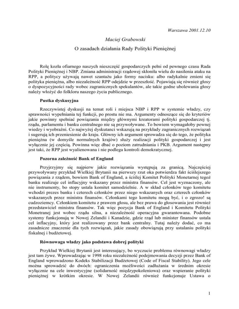 Warszawa 2001.12.10 Maciej Grabowski O zasadach działania Rady Polityki Pieniężnej Rolę kozła ofiarnego naszych nieszczęść gospodarczych pełni od pewnego czasu Rada Polityki Pieniężnej i NBP. Zmiana administracji rządowej skłoniła wielu do nasilenia ataku na RPP, a politycy używają nawet szantażu jako formy nacisku: albo radykalnie zmieni się polityka pieniężna, albo niezależność RPP odejdzie w przeszłość. Pojawiają się również głosy o dyspozycyjności rady wobec zagranicznych spekulantów, ale takie godne ubolewania głosy należy włożyć do folkloru naszego życia publicznego. Pustka dyskusyjna Rzeczywistej dyskusji na temat roli i miejsca NBP i RPP w systemie władzy, czy sprawności wypełniania tej funkcji, po prostu nie ma. Argumenty odnoszące się do kryteriów jakie powinny spełniać powiązania między głównymi kreatorami polityki gospodarczej tj. rządu, parlamentu i banku centralnego nie są przywoływane. To bowiem wymagałoby pewnej wiedzy i wyobraźni. Co najwyżej dyskutanci wskazują na przykłady zagranicznych rozwiązań i sugerują ich przeniesienie do kraju. Główny ich argument sprowadza się do tego, że polityka pieniężna (w domyśle normalnych krajów) służy realizacji polityki gospodarczej i jest wyłącznie jej częścią. Powinna więc dbać o poziom zatrudniania i PKB. Argument następny jest taki, że RPP jest wyalienowana i nie podlega kontroli demokratycznej. Pozorna zależność Bank of England Przyjrzyjmy się najpierw jakie rozwiązania występują za granicą. Najczęściej przywoływany przykład Wielkiej Brytanii na pierwszy rzut oka potwierdza fakt ściślejszego powiązania z rządem, bowiem Bank of England, a ściślej Komitet Polityki Monetarnej tegoż banku realizuje cel inflacyjny wskazany przez ministra finansów. Cel jest wyznaczony, ale nie instrumenty, bo stopy ustala komitet samodzielnie. A w skład członków tego komitetu wchodzi prezes banku i czterech członków przez niego wskazanych oraz czterech członków wskazanych przez ministra finansów. Członkami tego komitetu mogą być, i o zgrozo! są cudzoziemcy. Członkiem komitetu z prawem głosu, ale bez prawa do głosowania jest również przedstawiciel ministra finansów. Tak więc pozycja Bank of England i Komitetu Polityki Monetranej jest wobec rządu silna, a niezależność operacyjna gwarantowana. Podobne systemy funkcjonują w Nowej Zelandii i Kanadzie, gdzie rząd lub minister finansów ustala cel inflacyjny, który jest realizowany przez bank centralny. Tutaj należy dodać, co ma zasadnicze znaczenie dla tych rozwiązań, jakie zasady obowiązują przy ustalaniu polityki fiskalnej i budżetowej. Równowaga władzy jako podstawa dobrej polityki Przykład Wielkiej Brytanii jest interesujący, bo wyczucie problemu równowagi władzy jest tam żywe. Wprowadzając w 1998 roku niezależność podejmowania decyzji przez Bank of England wprowadzono Kodeks Stabilizacji Budżetowej (Code of Fiscal Stability). Jego cele można sprowadzić do dwóch: ograniczenia możliwości zadłużania w średnim okresie wyłącznie na cele inwestycyjne (solidarność międzypokoleniowa) oraz wspieranie polityki pieniężnej w krótkim okresie. W Nowej Zelandii również funkcjonuje Ustawa o 1 Odpowiedzialnym Budżecie (Fiscal Responsability Act) spełniająca podobne zadania. Wreszcie działania wszystkich tych instytucji budżetowych i monetarnych cechuje wysoka przejrzystość, a one same posiadają cechę zaufania publicznego. W innych krajach takich jak Japonia, czy Australia banki centralne same ustalają cel inflacyjny jak i instrumenty jego osiągnięcia. W Stanach Zjednoczonych federalna rezerwa prowadzi politykę monetarną niezależnie, ale nawet cel jej działania nie jest określony ustawowo. Przypadek Europejskiego Banku Centralnego (ECB) jest specjalny, bo jest on częścią szerszego systemu europejskich banków centralnych, choć podobnie jak w powyższych krajach i cele i instrumenty pozostają w rękach banku. Można przypomnieć, że podczas negocjacji towarzyszących tworzeniu tego banku sformułowanie celu działania ECB wywołało spór, a ostatecznie celem jest osiąganie i utrzymywanie stabilnych cen. Powiązanie ECB z innymi organami decyzyjnymi jest stosunkowo słabe. Prezes ECOFIN może brać udział w posiedzeniach ECB i zgłaszać wnioski. W posiedzeniach może brać również udział przedstawiciel Komisji Europejskiej, ale bez takiego prawa. Ponad konfrontacyjnym podejściem polityki fiskalnej i pieniężnej Tradycyjna dyskusja ekonomiczna mówiła o prostej zależności między polityką budżetową a pieniężną i wskazywała na uproszczoną zależność między restrykcyjnością polityki budżetowej ograniczającej popyt a obniżaniem stóp procentowych dla założonego celu inflacyjnego. Taki model stawia niejako po dwóch stronach kreatorów polityki gospodarczej. W takim rozumowaniu pomija się wszakże takie cechy jak przejrzystość systemu budżetowego i zaufanie do prowadzonej polityki budżetowej. A te wprost wpływają na oczekiwania inflacyjne. Innymi słowy im większa przejrzystość i zaufanie do prowadzonej polityki budżetowej tym większa możliwość na obniżanie stóp procentowych przy założonym celu inflacyjnym. Jeśli polityka pieniężna jest prowadzona w sposób przewidywalny, decyzje podejmowane są w sposób przejrzysty to zarówno rynek jak i budżet może trafniej ocenić swoje sytuację. Doświadczenie polskie współpracy RPP i Ministra Finansów W warunkach polskich w ostatnich latach cele inflacyjne wskazywane przez NBP nie były osiągane. Ale te cele publicznie ogłaszane zawsze we wrześniu w Założeniach Polityki Pieniężnej na rok następny przed zatwierdzeniem budżetu były zgodne z założeniami makroekonomicznymi rządu. W 2001 roku rząd przewidywał 7% wzrost cen, a NBP-owski cel inflacyjny określany jest między 6 a 8%. NBP regularnie publikuje Raporty o Inflacji, gdzie znajdu
