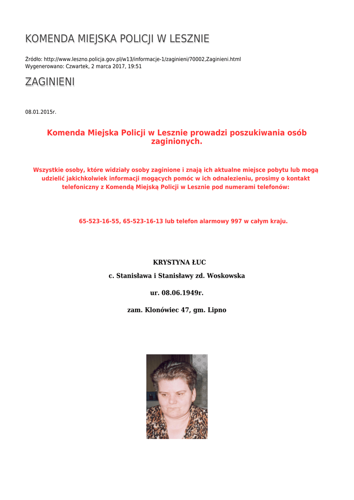 KOMENDA MIEJSKA POLICJI W LESZNIE Źródło: http://www.leszno.policja.gov.pl/w13/informacje-1/zaginieni/70002,Zaginieni.html Wygenerowano: Czwartek, 2 marca 2017, 19:51 ZAGINIENI 08.01.2015r. Komenda Miejska Policji w Lesznie prowadzi poszukiwania osób zaginionych. Wszystkie osoby, które widziały osoby zaginione i znają ich aktualne miejsce pobytu lub mogą udzielić jakichkolwiek informacji mogących pomóc w ich odnalezieniu, prosimy o kontakt telefoniczny z Komendą Miejską Policji w Lesznie pod numerami telefonów: 65-523-16-55, 65-523-16-13 lub telefon alarmowy 997 w całym kraju. KRYSTYNA ŁUC c. Stanisława i Stanisławy zd. Woskowska ur. 08.06.1949r. zam. Klonówiec 47, gm. Lipno Zaginiona w dniu 26.06.2011r. około godz. 23:00 wykorzystując sen domowników wyszła z domu udając się w nieznanym kierunku i do chwili obecnej nie powróciła i nie nawiązała kontaktu z rodziną. Rysopis: wiek z wyglądu 65 lat, szczupła budowa ciała, wzrost około 168cm, włosy krótkie koloru szpakowatego. Ubiór: nie ustalony, posiadała przy sobie torebkę koloru czarnego. Znaki szczególne: całkowity brak uzębienia. ------------------------------------------------------------------------------------------- KAZIMIERZ BIEL s. Wojciecha i Stanisławy ur. 16.05.1951 roku w Szczawnicy ostatnio zamieszkały: Leszno ul. Chociszewskiego 25 Zaginiony Kazimierz Biel w 2009 roku opuścił swoje miejsce zamieszkania i do dnia dzisiejszego nie nawiązał kontaktu z rodziną. Rysopis: wiek z wyglądu 60-65 lat, szczupła budowa ciała , wzrost ok. 170 cm, brunet, oczy szare, twarz owalna, uszy normalne, nos duży, widoczne braki w uzębieniu. Znaki szczególne: tatuaż przedstawiający litery na prawej dłoni. ------------------------------------------------------------------------------------------- Komenda Miejska Policji w Lesznie prowadzi poszukiwania zaginionej: ŁUC Krystyna c. Stanisława i Stanisławy zd. Woskowska ur. 08.06.1949r. zam. Klonówiec 47 gm. Lipno Zaginiona w dniu 26.06.2011r. około godz. 23:00 wykorzystując sen domowników wyszła z domu udając się w nieznanym kierunku i do chwili obecnej nie powróciła i nie nawiązała kontaktu z rodziną. Rysopis: wiek z wyglądu 65 lat, szczupła budowa ciała, wzrost około 168cm, włosy krótkie koloru szpakowatego. Ubiór: nie ustalony, posiadała przy sobie torebkę koloru czarnego. Znaki szczególne: całkowity brak uzębienia. Wszystkie osoby, które widziały zaginioną i znają jej aktualne miejsce pobytu lub mogą udzielić jakichkolwiek informacji mogących pomóc w odnalezieniu zaginionej, prosimy o kontakt telefoniczny z Komendą Miejską Policji w Lesznie pod numerami telefonów: 65-523-16-55, 65-523-16-13 lub telefon alarmowy 997 w całym kraju. Ocena: 0/5 (0) Tweetnij