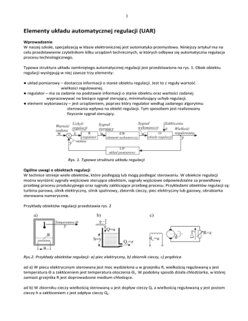1 Elementy układu automatycznej regulacji (UAR) Wprowadzenie W naszej szkole, specjalizacją w klasie elektronicznej jest automatyka przemysłowa. Niniejszy artykuł ma na celu przedstawienie czytelnikom kilku urządzeń technicznych, w których odbywa się automatyczna regulacja procesu technologicznego. Typowa struktura układu zamkniętego automatycznej regulacji jest przedstawiona na rys. 1. Obok obiektu regulacji występują w niej zawsze trzy elementy: ● układ pomiarowy – dostarcza informacji o stanie obiektu regulacji. Jest to z reguły wartość wielkości regulowanej. ● regulator – ma za zadanie na podstawie informacji o stanie obiektu oraz wartości zadanej wypracowywać na bieżąco sygnał sterujący, minimalizujący uchyb regulacji. ● element wykonawczy – jest urządzeniem, poprzez który regulator według zadanego algorytmu sterowania wpływa na obiekt regulacji. Tym sposobem jest realizowany fizycznie sygnał sterujący. Rys. 1. Typowa struktura układu regulacji Ogólne uwagi o obiektach regulacji W technice istnieje wiele obiektów, które podlegają lub mogą podlegać sterowaniu. W obiekcie regulacji można wyróżnić sygnały wejściowe sterujące obiektem, sygnały wyjściowe odpowiedzialne za prawidłowy przebieg procesu produkcyjnego oraz sygnały zakłócające przebieg procesu. Przykładami obiektów regulacji są: turbina parowa, silnik elektryczny, silnik spalinowy, zbiornik cieczy, piec elektryczny lub gazowy, obrabiarka sterowana numerycznie. Przykłady obiektów regulacji przedstawia rys. 2 Rys.2. Przykłady obiektów regulacji: a) piec elektryczny, b) zbiornik cieczy, c) prądnica ad a) W piecu elektrycznym sterowana jest moc wydzielona u w grzejniku R, wielkością regulowaną y jest temperatura Θ a zakłóceniem jest temperatura otoczenia Θz. W podobny sposób działa chłodziarka, w której zamiast grzejnika R jest doprowadzone medium chłodzące. ad b) W zbiorniku cieczy wielkością sterowaną u jest dopływ cieczy Q, a wielkością regulowaną y jest poziom cieczy h a zakłóceniem z jest odpływ cieczy Qz. 2 ad c) W prądnicy wielkością sterowaną u jest prąd wzbudzenia Iw, wielkością regulowaną y jest napięcie twornika U, natomiast zakłóceniem z jest obciążenie R. Podstawowe struktury układów sterowania W przypadku, kiedy chcemy oddziaływać na jeden, nieskomplikowany proces, wtedy stosujemy dwie struktury układów sterowania: ● układ otwarty ● układ zamknięty zwany też układem regulacji Układ sterowania otwartego charakteryzuje się jednokierunkowym oddziaływaniem sygnału sterującego na obiekt sterowania, bez możliwości kontroli prawidłowej realizacji sterowania. Rys. 3. Układ sterowania otwartego Przykładem jest zdalne załączanie silników, oświetlenia itp. bez sprawdzania przez załączającego, czy decyzja rzeczywiście została wykonana. Mogły przecież wystąpić zakłócenia w postaci przepalenia się bezpiecznika, uzwojenia silnika, żarówki lub linii energetycznej. Przy sterowaniu otwartym nie ma możliwości kompensacji wpływu niepożądanych zakłóceń zewnętrznych na wielkość sterowania u. Regulacja automatyczna polega na samoczynnym utrzymywaniu wartości wielkości sterowanej zgodnie z jej (stałą lub zmienną) wartością zadaną. W zamkniętym układzie sterowania, zwanym układem regulacji, do określenia sposobu oddziaływania na układ wykorzystywany jest stan wyjścia układu. W układzie zamkniętym sterowania regulator tak formuje sygnał nastawczy, aby różnica między wartością wielkości regulowanej, a wartością zadaną (zwaną sygnałem błędu ε) osiągnęła minimum. Wyróżnia się dwie struktury układów regulacji zamkniętej przedstawione na rys. 4. Rys. 4. Podstawowe struktury układów regulacji Przykłady układów regulacji 1. Sterowanie ręczne w układzie zamkniętym Schemat zamkniętego układu sterowania ręcznego przedstawia rys. 5. Centralnym elementem układu jest obiekt sterowania – urządzenie lub proces, w którym steruje się co najmniej jednym z parametrów. Ten parametr jest mierzony i przetwarzany na standardowy sygnał pomiarowy przez zespół pomiarowy i wskazywany przez przyrząd pomiarowy. Człowiek sterujący procesem porównuje wartość wskazywanego parametru z wartością ustaloną wcześniej jako optymalną i w przypadku wystąpienia różnicy oddziałuje odpowiednio na obiekt sterowania za pośrednictwem urządzenia wykonawczego. Proces sterowania komplikują zakłócenia wpływające na sterowany parametr. Gdyby nie było zakłóceń, można by jednorazowo ustalić optymalne ustawienie urządzenia wykonawczego i sterowanie byłoby zbędne. 3 Ponieważ w układzie występuje zwrotne oddziaływanie na obiekt, przeciwdziałające zmianom wielkości sterowanej (sprzężenie zwrotne ujemne), układ regulacji ręcznej jest układem zamkniętym. Rys. 5. Schemat zamkniętego sterowania ręcznego Przykładowy układ regulacji ręcznej przedstawiono na rys. 5. Operator obsługujący proces ogrzewania cieczy w wymienniku ciepła porównuje wskazania miernika temperatury T z wartością temperatury właściwą dla procesu, zadaną mu przez instrukcję technologa. Gdy temperatura cieczy jest za wysoka, zmniejsza pokrętłem zaworu strumień pary Q doprowadzony do wymiennika. Przy temperaturze za niskiej reaguje odwrotnie. Jeżeli temperatura jest prawidłowa, nie reaguje. Takie sterowanie procesem wymaga jednak aktywnego udziału operatora, zwłaszcza jego zaangażowania myślowego, nie jest więc automatyczne. Ciekawe jest prześledzenie, jak działałoby tu zastąpienie ujemnego sprzężenia zwrotnego dodatnim. Należy tylko odwrócić reakcję operatora, który na wzrost temperatury T reaguje zwiększeniem strumienia pary do wymiennika. Takie sterowanie doprowadziłoby do osiągnięcia skrajnych możliwych wartości T i całe sterowanie nie miałoby sensu. Dodatnie sprzężenie zwrotne działa na ogół destabilizująco na sterowan