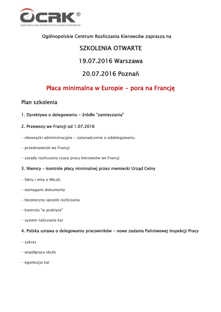 Ogólnopolskie Centrum Rozliczania Kierowców zaprasza na SZKOLENIA OTWARTE 19.07.2016 Warszawa 20.07.2016 Poznań Płaca minimalna w Europie - pora na Francję Plan szkolenia 1. Dyrektywa o delegowaniu - źródło "zamieszania" 2. Przewozy we Francji od 1.07.2016 - obowiązki administracyjne - zaświadczenie o oddelegowaniu - przedstawiciel we Francji - zasady rozliczania czasu pracy kierowców we Francji 3. Niemcy - kontrole płacy minimalnej przez niemiecki Urząd Celny - fakty i mity o MiLoG - wymagane dokumenty - bezpieczny sposób rozliczania - kontrola "w praktyce" - system naliczania kar 4. Polska ustawa o delegowaniu pracowników - nowe zadania Państwowej Inspekcji Pracy - zakres - współpraca służb - egzekucja kar Terminy i lokalizacje 19.07.2016 WARSZAWA Hotel Sound Garden Hotel ul. Żwirki i Wigury 18 20.07.2016 POZNAŃ Grand Royal Hotel ul. Głogowska 358 a Szkolenia odbędą się w godzinach 11:00-14:00. Limit miejsc: Ze względu na komfort uczestników szkolenia, obowiązuje limit miejsc. Decyduje kolejność zgłoszeń. Zgłoszenia Do udziału zapraszamy przewoźników prowadzących działalność transportową oraz osoby zarządzające transportem w firmie. Jedna firma może zgłosić maksymalnie dwie osoby. Podstawą do rejestracji jest czytelne wypełnienie formularza zgłoszeniowego, który należy przesłać na adres: [email protected] Informacji udziela: Piotr Pietrasina Tel. 692 487 993 Mail: [email protected]