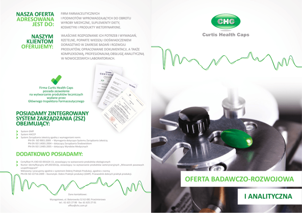 NASZA OFERTA ADRESOWANA JEST DO: NASZYM KLIENTOM OFERUJEMY: FIRM FARMACEUTYCZNYCH I PODMIOTÓW WPROWADZAJĄCYCH DO OBROTU WYROBY MEDYCZNE, SUPLEMENTY DIETY, KOSMETYKI I PRODUKTY WETERYNARYJNE. WŁAŚCIWE ROZPOZNANIE ICH POTRZEB I WYMAGAŃ, RZETELNE, POPARTE WIEDZĄ I DOŚWIADCZENIEM DORADZTWO W ZAKRESIE BADAŃ I ROZWOJU PRODUKTÓW, OPRACOWANIE DOKUMENTACJI, A TAKŻE KOMPLEKSOWĄ, PROFESJONALNĄ OBSŁUGĘ ANALITYCZNĄ W NOWOCZESNYCH LABORATORIACH. Firma Curtis Health Caps posiada zezwolenie na wytwarzanie produktów leczniczych wydane przez Głównego Inspektora Farmaceutycznego POSIADAMY ZINTEGROWANY SYSTEM ZARZĄDZANIA (ZSZ) OBEJMUJĄCY: System GMP System HACCP System Zarządzania Jakością zgodny z wymaganiami norm: PN-EN ISO 9001:2009 – Wymagania dotyczące Systemu Zarządzania Jakością PN-EN ISO 14001:2004 – dotyczący Zarządzania Środowiskiem PN-EN ISO 13485:2005 – dotyczący Wyrobów Medycznych DODATKOWO POSIADAMY: Certyfikat PL-EKO-02-001624-13, zezwalający na wytwarzanie produktów ekologicznych Numer identyfikacyjny αPL3021012p, zezwalający na wytwarzanie produktów weterynaryjnych „Mieszanek paszowych uzupełniających” Wdrażamy i pracujemy zgodnie z systemem Dobrej Praktyki Produkcji, zgodnie z normą PN-EN ISO 22716:2009 – Kosmetyki. Dobre Praktyki produkcji (GMP). Przewodnik dobrych praktyk produkcji. OFERTA BADAWCZO-ROZWOJOWA Dane kontaktowe: Wysogotowo, ul. Batorowska 52 62-081 Przeźmierowo tel.: 61 625 27 00 fax: 61 625 27 01 offi[email protected] I ANALITYCZNA OFERUJEMY USŁUGI BADAWCZO-ROZWOJOWE NA WSZYSTKICH ETAPACH WYTWARZANIA KAPSUŁEK, OD POMYSŁU DO PRODUKTU FINALNEGO, DLA PRODUKTÓW LECZNICZYCH, WYROBÓW MEDYCZNYCH, SUPLEMENTÓW DIETY, KOSMETYKÓW I PRODUKTÓW WETERYNARYJNYCH. WYKONUJEMY BADANIA Z ZAKRESU ANALIZ BIEŻĄCYCH PRODUKTÓW, SUROWCÓW I OPAKOWAŃ, PRZEPROWADZAMY TAKŻE BADANIA TRWAŁOŚCI PRODUKTÓW. ZAJMUJEMY SIĘ OPRACOWYWANIEM I WALIDACJĄ METOD ANALITYCZNYCH I MIKROBIOLOGICZNYCH. WYKONUJEMY BADANIA WG FARMAKOPEI, METODAMI WŁASNYMI LUB ZLECENIODAWCY. SPECJALIŚCI Z DZIAŁU BADAŃ I ROZWOJU OFERUJĄ PROFESJONALNĄ OBSŁUGĘ W ZAKRESIE: NASZE ATUTY TO : Indywidualne podejście i elastyczność Możliwość wytwarzania małych serii produkcyjnych Znajomość najnowszych wymagań prawnych Współpraca z wieloma ośrodkami naukowymi w Polsce Specjalizacja w trudnych produktach USŁUGI ANALITYCZNE W LABORATORIUM FIZYKO-CHEMICZNYM CURTIS HEALTH CAPS WYPOSAŻENIE LABORATORIUM TO M.IN.: Chromatografy cieczowe HPLC z detekcją UV-VIS, PDA Chromatograf gazowy GC-FID i HeadSpace Spektrofotometry UV-VIS Spektrofotometr IR Spektrometr ASA (z płomieniem, piecem grafitowym i systemem generacji wodorków/zimnych par Hg) Mineralizator mikrofalowy Aparat do badania profilu uwalniania Aparat do badania czasu rozpadu Aparat Karla Fischera Piec muflowy Komory klimatyczne do sezonowania produktów w warunkach długoterminowych (25 C/60%RH) i w warunkach pośrednich (30 C/65%RH) OFERUJEMY SZEROKI WACHLARZ PRAC ANALITYCZNYCH W ZAKRESIE BADANIA SUROWCÓW I PRODUKTÓW Opracowania formulacji nowych produktów w oparciu o najnowsze trendy rynkowe i literaturę Modyfikacji składów istniejących produktów Doboru odpowiedniej jakości surowców od skwalifikowanych dostawców Opracowania technologii produkcji i wykonywania serii próbnych i pilotażowych Transferu produkcji i metod analitycznych Opracowania i walidacji metod analitycznych oraz optymalizacji istniejących Wykonywania badań trwałości Zarządzania projektami Opracowania dokumentacji na potrzeby rejestracji produktów leczniczych i wyrobów medycznych oraz notyfikacji środków spożywczych i kosmetyków Przygotowania druków informacyjnych i powiadomień GIS dot. środków spożywczych (suplementów diety, dietetycznych środków spożywczych specjalnego przeznaczenia medycznego, środków spożywczych wzbogacanych) Wsparcia merytorycznego w dziedzinie regulacji prawnych Oznaczanie zawartości substancji Potwierdzanie tożsamości substancji Oznaczanie zanieczyszczeń (metale ciężkie, pozostałości rozpuszczalników i inne) Oznaczanie barwników Oznaczanie konserwantów i przeciwutleniaczy Oznaczanie zawartości wody i straty masy po suszeniu Badanie profilu uwalniania Badanie czasu rozpadu Badanie parametrów technologicznych np. twardości, lepkości Inne badania, po uzgodnieniu USŁUGI ANALITYCZNE W LABORATORIUM MIKROBIOLOGICZNYM CURTIS HEALTH CAPS NASZA OFERTA BADAŃ OBEJMUJE: LABORATORIUM WYPOSAŻONE JEST W NOWOCZESNĄ APARATURĘ KONTROLNO-POMIAROWĄ, KTÓRĄ OBSŁUGUJE WYKWALIFIKOWANA, KOMPETENTNA I DOŚWIADCZONA KADRA. LABORATORIUM MIKROBIOLOGICZNE WYPOSAŻONE ZOSTAŁO W SPRZĘT ANALITYCZNY, SPEŁNIAJĄCY STANDARDY NIEZBĘDNE DO PROWADZENIA BADAŃ CZYSTOŚCI MIKROBIOLOGICZNEJ ORAZ MONITORINGU ŚRODOWISKA PRODUKCYJNEGO. Badanie czystości mikrobiologicznej surowców oraz produktów leczniczych zgodnie z wymogami farmakopealnymi, wyrobów medycznych, suplementów diety, dietetycznych środków spożywczych specjalnego przeznaczenia medycznego, kosmetyków (metody zgodne z normami ISO) Badanie monitoringu mikrobiologicznego środowiska wytwarzania i mediów – wody wodociągowej, wody oczyszczonej, powierzchni urządzeń i wyposażenia, podłóg i ścian, powietrza Opracowanie i walidację metod mikrobiologicznych Badanie przeżywalności mezofilnych bakterii fermentacji mlekowej OFERUJEMY USŁUGI BADAWCZO-ROZWOJOWE NA WSZYSTKICH ETAPACH WYTWARZANIA KAPSUŁEK, OD POMYSŁU DO PRODUKTU FINALNEGO, DLA PRODUKTÓW LECZNICZYCH, WYROBÓW MEDYCZNYCH, SUPLEMENTÓW DIETY, KOSMETYKÓW I PRODUKTÓW WETERYNARYJNYCH. WYKONUJEMY BADANIA Z ZAKRESU ANALIZ BIEŻĄCYCH PRODUKTÓW, SUROWCÓW I OPAKOWAŃ, PRZEPROWADZAMY TAKŻE BADANIA TRWAŁOŚCI PRODUKTÓW. ZAJMUJEMY SIĘ OPRACOWYWANIEM I WALIDACJĄ METOD ANALITYCZNYCH I MIKROBIOLOGICZNYCH. WYKONUJEMY BADANIA WG FARMAKOPEI, METODAMI WŁASNYMI LUB ZLECENIODAWCY. SPECJALIŚCI Z DZIAŁU BADAŃ I ROZWOJU OFERUJĄ PROFESJONALNĄ OBSŁUGĘ W ZAKRESIE: NASZE