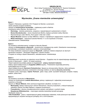 GRUPA DE-PL Biuro Usług Turystycznych "GRUPA DE-PL” Szymon Kurkiewicz ul. Lodowa 31/1, 60-227 Poznań tel: 530 76 77 76, e-mail: [email protected] NIP:6981710393, REGON:302235732 Wycieczka „Znane niemieckie uniwersytety” Dzień 1 -Wyjazd z Warszawy o godzinie 4.00. Przejazd do Niemiec z przerwami. -Około południa przyjazd do Berlina. -Wizyta na Uniwersytecie Humboldta – najstarszej uczelni w Berlinie -Zwiedzanie stolicy Niemiec. Na trasie m.in.: • Reichstag – siedziba parlamentu, związana z najważniejszymi wydarzeniami w historii. • Brama Brandenburska – duma mieszkańców Berlina, będąca symbolem stolicy Niemiec. • Reprezentacyjny salon Berlina „Pod Lipami” Unter den Linden. • Wyspa Muzeów wpisana na listę UNESCO, miejsce o największym zagęszczeniu muzeów w Europie • Wieża telewizyjna – najwyższa budowla Niemiec i 4. co do wysokości w Europie. -Zakwaterowanie i obiadokolacja Dzień 2 -Po śniadaniu wykwaterowanie i przejazd w kierunku Bawarii -Wizyta na Uniwersytecie w Bayreuth – dynamicznie rozwijającej się uczelni. Zwiedzanie nowoczesnego, pomyślanego o potrzebach studentów, campusu uniwersyteckiego. -W miarę możliwości czasowych spacer po Bayreuth, urokliwym mieście związanym ze słynnymi niemieckimi artystami – Richardem Wagnerem i Jeanem Paulem. -Przyjazd na nocleg w Alpach Bawarskich, zakwaterowanie i obiadokolacja Dzień 3 Zapierająca dech wycieczka na najwyższy szczyt Niemiec – Zugspitze oraz do najważniejszego alpejskiego kurortu w Niemczech – „GaPa”. W czasie wycieczki: -Wjazd wąskotorową kolejką zębatą na Zugspitzplatt – jedyny niemiecki lodowiec. -Dalszy wjazd kolejką linową na Zugspitze (2962m.n.p.m.) . Podziwianie wspaniałej panoramy, roztaczającej się ze szczytu. -Zjazd kolejką linową do Garmisch-Partenkirchen. Spacer po zimowej stolicy Niemiec, która zachwyca malowniczą alpejską zabudową. podziwianie zimowego stadionu ze słynną skocznią narciarską -Przejście przez imponujący wąwóz Partnach, gdzie rwący potok wyrzeźbił fantazyjne przejście między skałami. (około 4km) Dzień 4 -Po śniadaniu wycieczka do Monachium. -Wizyta na Uniwersytecie Ludwika Maximiliana, jednej z najstarszych i najbardziej renomowanych wszechnic w Europie. -Spacer po Starym Mieście, które zachwyca bogactwem zabytków, na trasie m.in: • Marienplatz, będący historycznym centrum Monachium, otoczony budynkami, z których każdy jest zabytkiem (Neues und Altes Rathaus z zegarem kurantowym). • Frauenkirche, z dwoma charakterystycznymi wieżami, jest jednym z symboli miasta. • Rezydencja Wittelsbachów – imponująca siedziba bawarskiej dynastii panującej. -Możliwość wizyty np.: • Alte Pinakothek – jedna z najważniejszych galerii światowego malarstwa, może poszczycić się dziełami najwybitniejszych artystów tworzących pomiędzy XIV a XVIII stuleciem. www.grupa-depl.com GRUPA DE-PL Biuro Usług Turystycznych "GRUPA DE-PL” Szymon Kurkiewicz ul. Lodowa 31/1, 60-227 Poznań tel: 530 76 77 76, e-mail: [email protected] NIP:6981710393, REGON:302235732 • Muzeum Niemieckie – wizyta tutaj to prawdziwa wyprawa w świat techniki. Jedno z największych i najstarszych na świecie muzeów o tematyce naukowo-technicznej. -Powrót na obiadokolację Dzień 5 -Po śniadaniu wykwaterowanie. Przejazd do Austrii z przerwami. -Przyjazd do Wiednia. Zwiedzanie Starego Miasta z przewodnikiem. Na trasie m.in • Plac i Katedra św. Stefana – symbol Wiednia, gotycka świątynia, cudem przetrwała liczne burze dziejowe. • Hofburg - okazała rezydencja cesarska,skąd przez ponad siedem stuleci kierowano imperium Habsburgów • Kościół Krzyżacki – w którym do dnia dzisiejszego działa Zakon Szpitala NMP Domu Niemieckiego. -Pałac Schönbrunn – pełna przepychu i rozmachu letnia rezydencja Habsburgów. Spacer po najpiękniejszym założeniu parkowo-pałacowym Wiednia. -Przejazd przez Ring Wiedeński – reprezentacyjny bulwar, obudowany imponującymi gmachami. Na trasie m.in. Parlament, Teatr Dworski, Kościół Wotywny, Opera Wiedeńska, Plac Marii Teresy. -Przyjazd na miejsce noclegowe, zakwaterowanie i obiadokolacja -Możliwość udziału w przedstawieniu słynnej Opery Wiedeńskiej Dzień 6 -Po śniadaniu wykwaterowanie. -Zwiedzanie Muzeum Historii Naturalnej – dzięki ponad 30 milionom eksponatów, uważane jest za jedno z najważniejszych na świecie i z pewnością największe w Austrii. -Wizyta na Uniwersytecie w Wiedniu – największej uczelni wyższej nie tylko w Austrii ale w całej Europie Środkowej. -Wyjazd z Wiednia około godziny 16 -Przejazd do Polski z przerwą na obiadokolację -Przyjazd do Warszawy w godzinach nocnych Zakwaterowanie: Schronisko młodzieżowe/hostel Zakwaterowanie w wygodnych schroniskach młodzieżowych. Pokoje wieloosobowe, łazienka ogólnodostępna. Świadczenia: • • • • • • Przejazd komfortowym autokarem/busem wyposażonym w klimatyzację, TV 5 x noclegi w schronisku młodzieżowym, pokoje wieloosobowe, łazienka ogólnodostępna 5 x śniadanie, 6 x obiadokolacja Opiekę pilota-przewodnika i przewodnika po Wiedniu Ubezpieczenie PZU Wojażer KL 40 000zł, NNW 10 000zł Bezpłatny udział opiekunów 1/15 45 osób 40 osób 35 osób 30 osób 20 osób Schronisko młodzieżowe 1 450 zł 1 500 zł 1 550 zł 1 650 zł 1 800 zł Należy mieć przygotowane około 40€ na rezerwacje i bilety wstępów do: Wąwozu Partnach, Muzeum Historii Naturalnej w Wiedniu, Wjazd na Zugspitze, przejazdy w Wiedniu. www.grupa-depl.com