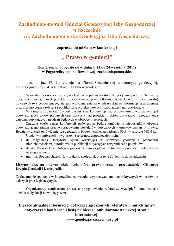 Zachodniopomorski Oddział Geodezyjnej Izby Gospodarczej w Szczecinie (d. Zachodniopomorska Geodezyjna Izba Gospodarcza) zaprasza do udziału w konferencji „ Prawo w geodezji" Konferencja odbędzie się w dniach 22 do 24 września 2011r. w Pogorzelicy, gmina Rewal, woj. zachodniopomorskie. Jest to już 17. konferencja na Ziemi Szczecińskiej o tematyce geodezyjnej, 16. w Pogorzelicy i 4. o tematyce „Prawo w geodezji”. W ostatnim czasie zaczęło się wiele dziać w prawodawstwie dotyczącym geodezji. Nie mamy dotąd co prawda, nawet projektu (opracowanego przez Główny Urząd Geodezji i Kartografii) nowego Prawa geodezyjnego, ale jest wdrażana ustawa o infrastrukturze informacji przestrzennej oraz ostatnio coraz częściej są publikowane projekty nowych rozporządzeń nas dotykających. W zamyśle organizatorów jest dyskusja na konferencji nad problemami z wdrożeniem już obowiązujących aktów prawnych oraz dyskusja nad projektami aktów dotyczących geodezji oraz dziedzin dotykających geodezji będących w obróbce w resortach. Znaczna część czasu konferencji poświęcona będzie omówieniu niedostatków obecnie obowiązującego prawa oraz wypracowaniu postulatów dotyczących kierunków zmian w prawie. Będziemy chcieli omówić miejsce geodezji w budownictwie, zarządzaniu PKP, w resorcie MON itd. Udział w konferencji i wygłoszenie referatów zapowiedzieli m.in. • dr Magdalena Durzyńska sędzia orzekająca w sprawach geodezji i gospodarki nieruchomościami, autorka wielu publikacji dotyczących rozgraniczeń i podziałów, • dr inż. Dariusz Felcenloben – pracownik samorządowy, autor wielu publikacji dotyczących naszego zawodu • mgr inż. Bogdan Grzechnik – praktyk, społecznik o prawie 50. letnim doświadczeniu Liczymy także na aktywny udział tych, którzy prawo tworzą – przedstawicieli Głównego Urzędu Geodezji i Kartografii. Zakładamy że spotkanie w Pogorzelicy zaowocuje wypracowaniem konstruktywnych wniosków do dalszych prac legislacyjnych. Organizatorzy seminarium proszą o przygotowanie referatów, wystąpień udziału w dyskusji na wiodący temat. oraz wzięcie Bieżące aktualne informacje dotyczące zgłoszonych referatów i innych spraw dotyczących konferencji będą na bieżąco publikowane na naszej stronie internatowej: www.geodezja-szczecin.org.pl Uzgodnione z organizatorami referaty dostarczone organizatorom do dnia 30.08.2010r. zostaną umieszczone w materiałach konferencji /plik Word, czcionka Times New Roman- 12, marginesy – standard, pojemność do 20 000 znaków, druk bezpośrednio z dostarczonych materiałów. Informacje dotyczące warunków udziału w konferencji. Pobyt z miejscem w pokoju dwuosobowym 990 zł, w pokoju jednoosobowym 1250 zł , od osoby przy zgłoszeniach i wpłatach do 15 sierpnia 2011r. Po tym terminie odpowiednio 1090 zł i 1350 zł. Opłata obejmuje wszystkie koszty związane z udziałem w konferencji: materiały, zakwaterowanie, posiłki - od kolacji w dniu 21 września do śniadania w dniu 24 września 2011r., i udział w uroczystej kolacji w dniu 23.09 oraz zamówioną przez organizatorów dobrą pogodę. Firmom komercyjnym oferujemy tradycyjnie powierzchnię wystawienniczą , koszt 2500 zł +VAT. Opłata obejmuje udostępnienie powierzchni wystawienniczej oraz możliwość 20 min. prezentacji w czasie obrad. Powierzchnia handlowa wg uzgodnień indywidualnych.. Miejsce konferencji (uwaga ! – zmiana) : Kompleks Wczasowy SANDRA SPA www.sandra.ta.pl Pogorzelica ul. Wojska Polskiego 3 72-350 Niechorze tel. 91 4814700 Zgłoszenia prosimy przesyłać na adres: Zachodniopomorska Geodezyjna Izba Gospodarcza ul. 5 Lipca 22/1 70-376 Szczecin e-mail: [email protected] faks 914846657 lub drukiem zgłoszenia na stronie: www.geodezja-szczecin.org.pl Wpłaty należy dokonywać na konto: Zachodniopomorska Geodezyjna Izba Gospodarcza ul. 5 Lipca 22/1 70-376 Szczecin Bank VW Bank direct., Nr rach. 53 2130 0004 2001 0248 0192 0001 z dopiskiem "Konferencja......osoby" Aktualne informacje można uzyskać: tel.: 914840957, 914846657 tel. kom. Sławomir Leszko 509513514