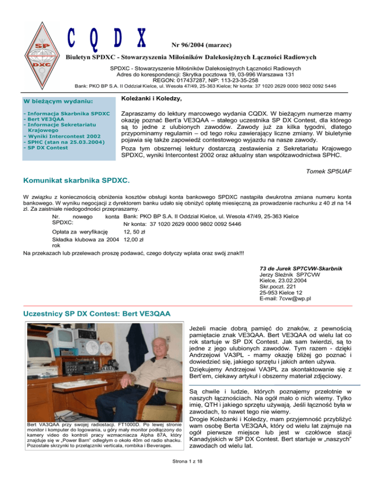 CQDX Nr 96/2004 (marzec) Biuletyn SPDXC - Stowarzyszenia Mi ników Dalekosi nych czno ci Radiowych SPDXC - Stowarzyszenie Mi ników Dalekosi nych czno ci Radiowych Adres do korespondencji: Skrytka pocztowa 19, 03-996 Warszawa 131 REGON: 017437287, NIP: 113-23-35-258 Bank: PKO BP S.A. II Oddzia Kielce, ul. Weso a 47/49, 25-363 Kielce; Nr konta: 37 1020 2629 0000 9802 0092 5446 W bie cym wydaniu: - Informacja Skarbnika SPDXC - Bert VE3QAA - Informacje Sekretariatu Krajowego - Wyniki Intercontest 2002 - SPHC (stan na 25.03.2004) - SP DX Contest Kole anki i Koledzy, Zapraszamy do lektury marcowego wydania CQDX. W bie cym numerze mamy okazj pozna Bert’a VE3QAA – sta ego uczestnika SP DX Contest, dla którego to jedne z ulubionych zawodów. Zawody ju za kilka tygodni, dlatego przypominamy regulamin – od tego roku zawieraj cy liczne zmiany. W biuletynie pojawia si tak e zapowied contestowego wyjazdu na nasze zawody. Poza tym obszernej lektury dostarcz zestawienia z Sekretariatu Krajowego SPDXC, wyniki Intercontest 2002 oraz aktualny stan wspó zawodnictwa SPHC. Tomek SP5UAF Komunikat skarbnika SPDXC. W zwi zku z konieczno ci obni enia kosztów obs ugi konta bankowego SPDXC nast pi a dwukrotna zmiana numeru konta bankowego. W wyniku negocjacji z dyrektorem banku uda o si obni op at miesi czn za prowadzenie rachunku z 40 z na 14 zl. Za zaistnia e niedogodno ci przepraszamy. Nr. nowego konta Bank: PKO BP S.A. II Oddzial Kielce, ul. Wesola 47/49, 25-363 Kielce SPDXC: Nr konta: 37 1020 2629 0000 9802 0092 5446 Op ata za weryfikacj 12, 50 z Sk adka klubowa za 2004 12,00 z rok Na przekazach lub przelewach prosz podawa , czego dotyczy wplata oraz swój znak!!! 73 de Jurek SP7CVW-Skarbnik Jerzy Sle nik SP7CVW Kielce, 23.02.2004 Skr.poczt. 221 25-953 Kielce 12 E-mail: [email protected] Uczestnicy SP DX Contest: Bert VE3QAA Je eli macie dobr pami do znaków, z pewno ci pami tacie znak VE3QAA. Bert VE3QAA od wielu lat co rok startuje w SP DX Contest. Jak sam twierdzi, s to jedne z jego ulubionych zawodów. Tym razem - dzi ki Andrzejowi VA3PL - mamy okazj bli ej go pozna i dowiedzie si , jakiego sprz tu i jakich anten u ywa. Dzi kujemy Andrzejowi VA3PL za skontaktowanie si z Bert’em, ciekawy artyku i obszerny materia zdj ciowy. Bert VA3QAA przy swojej radiostacji. FT1000D. Po lewej stronie monitor i komputer do logowania, u góry ma y monitor pod czony do kamery video do kontroli pracy wzmacniacza Alpha 87A, który znajduje si w „Power Barn” odleg ym o oko o 40m od radio shacku. Pozosta e skrzynki to prze czniki verticala, rombika i Beverages. chwile i ludzie, których poznajemy przelotnie w naszych czno ciach. Na ogó ma o o nich wiemy. Tylko imi , QTH i jakiego sprz tu u ywaj . Je li czno by a w zawodach, to nawet tego nie wiemy. Drogie Kole anki i Koledzy, mam przyjemno przybli wam osob Berta VE3QAA, który od wielu lat zajmuje na ogó pierwsze miejsce lub jest w czo ówce stacji Kanadyjskich w SP DX Contest. Bert startuje w „naszych” zawodach od wielu lat. Strona 1 z 18 Bert jest emerytowanym in ynierem elektronikiem i w swojej karierze zawodowej zajmowa si badaniami tranzystorów. Nosi em si z zamiarem odwiedzenia Berta VE3QAA ju od pewnego czasu. Skontaktowa em si z nim ponad rok temu i zosta em zaproszony do z enia wizyty. Dom Berta znajduje si do daleko od mojego miejsca zamieszkania - jest to oko o 6 godzin jazdy samochodem. O tyle dobrze si sk ada, e mój syn mieszka niedaleko od Berta, wiec pomy la em, e kiedy b u syna to przy okazji odwiedz Berta. Mia em odwiedzi Berta w lipcu ubieg ego roku, ale tak si o, e akurat w tym samym czasie syn kupi nowy dom i pomaga em mu w przeprowadzce, wi c musia em odwo wizyt . W sierpniu ubieg ego roku (2003) nadarzy a si okazja do osobistego spotkania z Bertem (VE3QAA) u John’a (VA3EJ), który zaprosi wszystkich cz onków Contest Club Ontario na spotkanie organizacyjne na terenie swojej posiad ci ko o Hamilton, a potem na BarBaQue (grilla). Romb KF i wie a – vertical 80/160m By mo e powinienem równie co napisa o Johnie VE3EJ, bo jest on jednym z najpowa niejszych uczestników zawodów i ma wspania , rozbudowan stacj z wielkimi antenami. John jest znanym i licz cym si zawodnikiem nie tylko w Kanadzie, ale na ca ym kontynencie ameryka skim, ale o tym mo e innym razem, bo John VE3EJ nie „chodzi” w naszych zawodach. Tutaj tylko wspomn , e John VE3EJ reprezentowa Kanad w czasie World Radio Championship w Finlandii. Na spotkanie organizacyjne Contest Club Ontario pojecha em z Jurkiem (VA3EF) i Bogdanem (VE3BDN). Tam w cieniu wielkich anten EJ’a, przy piwie i hamburgerze sma onym przez innego ciekawego czlowka Gary’ego VE3XN, spotka em si osobi cie z Bertem VE3QAA po raz pierwszy. Wyja ni em przy okazji, dlaczego nie mog em go odwiedzi wcze niej. Bert ponowi zaproszenie do odwiedzin. Zbli y si wi ta Bo ego Narodzenia, wi c pomy la em, e to doskona a okazja, aby go odwiedzi . Tak si te zdarzy o, e 18 grudnia 2003 urodzi a si synowi córka, a moja wnuczka, wi c wiedzia em na pewno, e b u syna na wi ta. Tu po wi tach zadzwoni em do Berta i umówi em si na spotkanie z nim w niedziel 28 grudnia Stodo a – „Power Barn”. Za „Power Barn” vertical 2003. Do Berta VE3QAA na 80/160 oraz jedyna yagi - na 6m. jedzie si na wschód drog numer 17 (trans Canada highway) w kierunku na Ottaw . Od mojego syna jest oko o pó torej godziny jazdy samochodem. Bert mieszka oko o 50 kilometrów na zachód od Ottawy (stolicy Kanady). Dom Berta znajduje si na posiad ci o powierzchni 14 hektarów. Mieszka wraz z on w ma ym domku a obok znajduje si „stodo a – Power Barn”. To, co zobaczy em przesz o moje wszelkie oczekiwania. Bert ma tylko anteny „drutowe”. ówn anten jest dwu-drutowy rombik na wysoko ci 30m. Ka dy Zasilanie anteny bok rombu ma d ugo 130m. Rombik jest skierowany na Europ (dok adnie 51 stopni) i jest zasilany dwoma liniami symetrycznymi 600 omów, co pozwala na prze czanie przód/ty . Rombik jest g ówn anten , jakiej u ywa Bert na wszys