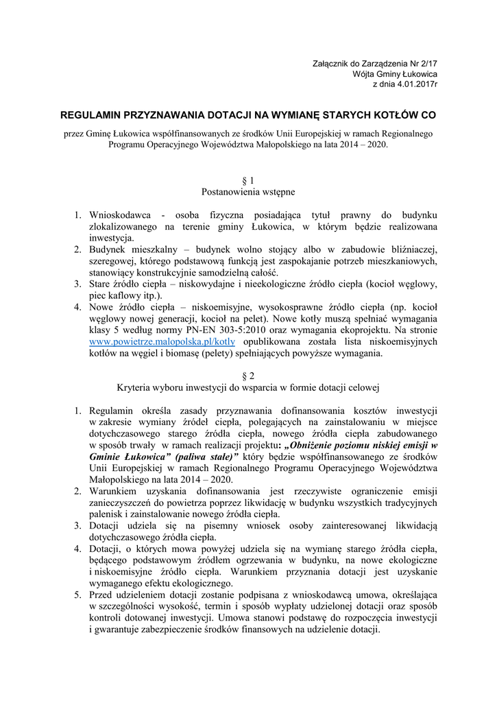 Załącznik do Zarządzenia Nr 2/17 Wójta Gminy Łukowica z dnia 4.01.2017r REGULAMIN PRZYZNAWANIA DOTACJI NA WYMIANĘ STARYCH KOTŁÓW CO przez Gminę Łukowica współfinansowanych ze środków Unii Europejskiej w ramach Regionalnego Programu Operacyjnego Województwa Małopolskiego na lata 2014 – 2020. §1 Postanowienia wstępne 1. Wnioskodawca - osoba fizyczna posiadająca tytuł prawny do budynku zlokalizowanego na terenie gminy Łukowica, w którym będzie realizowana inwestycja. 2. Budynek mieszkalny – budynek wolno stojący albo w zabudowie bliźniaczej, szeregowej, którego podstawową funkcją jest zaspokajanie potrzeb mieszkaniowych, stanowiący konstrukcyjnie samodzielną całość. 3. Stare źródło ciepła – niskowydajne i nieekologiczne źródło ciepła (kocioł węglowy, piec kaflowy itp.). 4. Nowe źródło ciepła – niskoemisyjne, wysokosprawne źródło ciepła (np. kocioł węglowy nowej generacji, kocioł na pelet). Nowe kotły muszą spełniać wymagania klasy 5 według normy PN-EN 303-5:2010 oraz wymagania ekoprojektu. Na stronie www.powietrze.malopolska.pl/kotly opublikowana została lista niskoemisyjnych kotłów na węgiel i biomasę (pelety) spełniających powyższe wymagania. §2 Kryteria wyboru inwestycji do wsparcia w formie dotacji celowej 1. Regulamin określa zasady przyznawania dofinansowania kosztów inwestycji w zakresie wymiany źródeł ciepła, polegających na zainstalowaniu w miejsce dotychczasowego starego źródła ciepła, nowego źródła ciepła zabudowanego w sposób trwały w ramach realizacji projektu: „Obniżenie poziomu niskiej emisji w Gminie Łukowica” (paliwa stałe)” który będzie współfinansowanego ze środków Unii Europejskiej w ramach Regionalnego Programu Operacyjnego Województwa Małopolskiego na lata 2014 – 2020. 2. Warunkiem uzyskania dofinansowania jest rzeczywiste ograniczenie emisji zanieczyszczeń do powietrza poprzez likwidację w budynku wszystkich tradycyjnych palenisk i zainstalowanie nowego źródła ciepła. 3. Dotacji udziela się na pisemny wniosek osoby zainteresowanej likwidacją dotychczasowego źródła ciepła. 4. Dotacji, o których mowa powyżej udziela się na wymianę starego źródła ciepła, będącego podstawowym źródłem ogrzewania w budynku, na nowe ekologiczne i niskoemisyjne źródło ciepła. Warunkiem przyznania dotacji jest uzyskanie wymaganego efektu ekologicznego. 5. Przed udzieleniem dotacji zostanie podpisana z wnioskodawcą umowa, określająca w szczególności wysokość, termin i sposób wypłaty udzielonej dotacji oraz sposób kontroli dotowanej inwestycji. Umowa stanowi podstawę do rozpoczęcia inwestycji i gwarantuje zabezpieczenie środków finansowych na udzielenie dotacji. 6. W pierwszej kolejności do projektu zakwalifikowane zostaną osoby spełniające następujące kryterium (wyniki zostaną opracowane w audycie energetycznym wykonanym przez zewnętrznego audytora): a) Budynek będący przedmiotem modernizacji źródła ciepła jest ocieplony (budynek posiada maksymalną wartość wskaźnika EPH+W nie większą niż 150 kWh [m2 *rok]dla domów jednorodzinnych na potrzeby ogrzewania, wentylacji oraz przygotowania ciepłej wody użytkowej) 7. Dotacja na wymianę starego źródła ciepła wynosi do 350,00 zł za każdy kW obliczonej mocy nowego źródła ciepła (maksymalnie do 8 tys. zł) , w razie konieczności wymiany instalacji wewnętrznej (zamontowanie pieca) dofinansowanie maksymalnie wynosi 1000,00 zł. do budynku jednorodzinnego . §3 Tryb postępowania w sprawie udzielenia dotacji celowej 1. Osoby ubiegające się o dotację zobowiązane są do złożenia pisemnego wniosku o udzielenie dotacji. Wniosek należy złożyć do 27 stycznia 2017 r. 2. Weryfikacji wniosków dokonuje Stanowisko ds. Nieruchomości i Ochrony Środowiska w Urzędzie Gminy Łukowica . 3. Gmina Łukowica dokona oceny wniosków na podstawie kryteriów wymienionych w § 2 ust.6. W przypadku zakwalifikowania się większej ilości osób od zaplanowanej w realizowanym projekcie , Gmina Łukowica może przeprowadzić losowanie osób które złożyły wnioski spełniające kryteria określone w §2ust.6 . 4. Sporządzona zostanie lista Wnioskodawców zakwalifikowanych do udziału w projekcie oraz lista rezerwowa. 5. Gmina przekaże listę Wnioskodawców Audytorom energetycznym zatrudnionym przez Urząd Marszałkowski. 6. Audytorzy przeprowadzą audyt energetyczny budynków i opracują świadectwa energetyczne budynków, będące podstawą do opracowania ostatecznej listy wnioskodawców kwalifikujących się do objęcia wsparciem w ramach projektu. 7. Gmina Łukowica podpisze umowy o przyznanie dotacji z kwalifikującymi się wnioskodawcami, którzy zgodzą się na spełnienie warunków ujętych w świadectwach energetycznych oraz zaakceptują proponowaną moc nowego kotła i dostarczą dokument potwierdzający tytuł prawny do dysponowania budynkiem. W przypadku, gdy wnioskodawca nie jest jedynym właścicielem budynku, zobowiązany jest do przedłożenia pisemnej zgody pozostałych właścicieli na wymianę źródła ciepła. §4 Sposób rozliczenia inwestycji 1. W celu rozliczenia inwestycji wnioskodawca przedłoży do Urzędu Gminy Łukowica komplet dokumentów, tj.: a) oryginał faktury za wymianę źródła ciepła, b) w przypadku urządzeń grzewczych, gdzie emitorem spalin jest komin - opinia zakładu kominiarskiego ustalająca prawidłowość podłączenia źródła ciepła do przewodu kominowego oraz wykonania wentylacji kotłowni, c) dokument potwierdzający fizyczną likwidację starego urządzenia grzewczego (dokument zezłomowania – kartę przekazania odpadu), d) protokół odbioru końcowego zawierający oświadczenie firmy dokonującej montażu źródła ogrzewania o prawidłowości wykonanych robót zgodnie z obowiązującymi przepisami i normami. 2. Rozliczenie inwestycji nastąpi w terminie do trzech miesięcy od daty podpisania umowy, lecz nie później niż