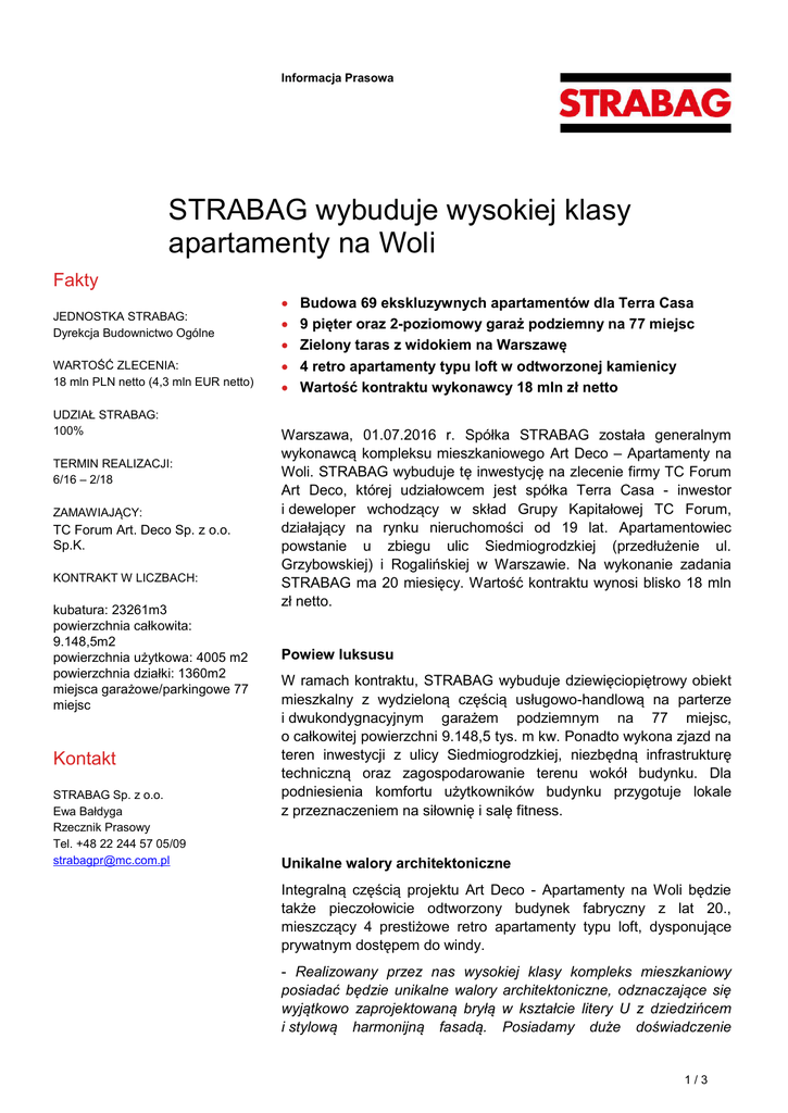 Informacja Prasowa STRABAG wybuduje wysokiej klasy apartamenty na Woli Fakty JEDNOSTKA STRABAG: Dyrekcja Budownictwo Ogólne WARTOŚĆ ZLECENIA: 18 mln PLN netto (4,3 mln EUR netto) UDZIAŁ STRABAG: 100% TERMIN REALIZACJI: 6/16 – 2/18 ZAMAWIAJĄCY: TC Forum Art. Deco Sp. z o.o. Sp.K. KONTRAKT W LICZBACH: kubatura: 23261m3 powierzchnia całkowita: 9.148,5m2 powierzchnia użytkowa: 4005 m2 powierzchnia działki: 1360m2 miejsca garażowe/parkingowe 77 miejsc Kontakt STRABAG Sp. z o.o. Ewa Bałdyga Rzecznik Prasowy Tel. +48 22 244 57 05/09 [email protected] Budowa 69 ekskluzywnych apartamentów dla Terra Casa 9 pięter oraz 2-poziomowy garaż podziemny na 77 miejsc Zielony taras z widokiem na Warszawę 4 retro apartamenty typu loft w odtworzonej kamienicy Wartość kontraktu wykonawcy 18 mln zł netto Warszawa, 01.07.2016 r. Spółka STRABAG została generalnym wykonawcą kompleksu mieszkaniowego Art Deco – Apartamenty na Woli. STRABAG wybuduje tę inwestycję na zlecenie firmy TC Forum Art Deco, której udziałowcem jest spółka Terra Casa - inwestor i deweloper wchodzący w skład Grupy Kapitałowej TC Forum, działający na rynku nieruchomości od 19 lat. Apartamentowiec powstanie u zbiegu ulic Siedmiogrodzkiej (przedłużenie ul. Grzybowskiej) i Rogalińskiej w Warszawie. Na wykonanie zadania STRABAG ma 20 miesięcy. Wartość kontraktu wynosi blisko 18 mln zł netto. Powiew luksusu W ramach kontraktu, STRABAG wybuduje dziewięciopiętrowy obiekt mieszkalny z wydzieloną częścią usługowo-handlową na parterze i dwukondygnacyjnym garażem podziemnym na 77 miejsc, o całkowitej powierzchni 9.148,5 tys. m kw. Ponadto wykona zjazd na teren inwestycji z ulicy Siedmiogrodzkiej, niezbędną infrastrukturę techniczną oraz zagospodarowanie terenu wokół budynku. Dla podniesienia komfortu użytkowników budynku przygotuje lokale z przeznaczeniem na siłownię i salę fitness. Unikalne walory architektoniczne Integralną częścią projektu Art Deco - Apartamenty na Woli będzie także pieczołowicie odtworzony budynek fabryczny z lat 20., mieszczący 4 prestiżowe retro apartamenty typu loft, dysponujące prywatnym dostępem do windy. - Realizowany przez nas wysokiej klasy kompleks mieszkaniowy posiadać będzie unikalne walory architektoniczne, odznaczające się wyjątkowo zaprojektowaną bryłą w kształcie litery U z dziedzińcem i stylową harmonijną fasadą. Posiadamy duże doświadczenie 1/3 w realizacji kompleksów mieszkaniowych i nowoczesne systemy zarządzania procesami budowlanymi. Współpracujemy ściśle z projektantami i inwestorami zapewniając docelowo komfort użytkownikom obiektu. Dzięki nowoczesnym systemom zarządzania potrafimy budować efektywnie przy zachowaniu optymalnych kosztów i czasu trwania inwestycji. Cieszymy się, że dostrzegł to nasz kolejny partner, z którym rozpoczynamy właśnie współpracę przy bardzo atrakcyjnym projekcie dla mieszkańców Warszawy - mówi Alfred Watzl, członek zarządu STRABAG Sp. z o.o. Inwestycja Art Deco – Apartamenty na Woli to łącznie 67 apartamentów o powierzchni od 30 do 125 mkw oraz 2 wyjątkowe penthouse’y z dużymi tarasami. Apartamenty wykonane zostaną przy użyciu szlachetnych materiałów wykończeniowych najwyższej jakości oraz będą wyposażone w zapewniające komfort życia nowinki techniczne. Każdy apartament będzie wyposażony w wentylację mechaniczną oraz system przygotowany do montażu klimatyzacji. Inteligentne i interaktywne apartamenty działać będą w systemie Smart Home, który umożliwi indywidualne sterowanie za pomocą urządzeń mobilnych oświetleniem, ogrzewaniem i zabezpieczeniami. Ultraszybki internet „Fiber to the Home” (1 GB/S) zostanie doprowadzony do każdego apartamentu za pomocą światłowodu. Wstęp do budynku będzie chroniony poprzez system kontroli wejścia - kamery i monitoring oraz czytniki linii papilarnych. Z widokiem na panoramę Warszawy Niewątpliwą atrakcją dla użytkowników tego luksusowego apartamentowca będzie usytuowany na dachu zielony taras z widokiem na panoramę Warszawy. Sam budynek z jego otoczeniem będzie miejscem idealnym do wypoczynku i wspólnych spotkań z przyjaciółmi. Zaletą apartamentów Art Deco jest ich lokalizacja. Budynek powstaje w wyjątkowej części stolicy Polski, w jednym z niewielu miejsc, które nie zostały zniszczone podczas II wojny światowej. Apartamenty powstają w pobliżu popularnych szlaków komunikacyjnych, w niedalekiej odległości od Galerii Arkadia i biznesowej części Woli, kilka minut drogi od Metra Rondo Daszyńskiego i planowanej stacji Wolska. STRABAG SE jest europejskim koncernem budowlanym, liderem w zakresie wdrażania innowacyjnych technologii z silnym kapitałem własnym. Działalność STRABAG obejmuje pełen zakres usług budowlanych, wykwalifikowaną kadrę inżynierską, wysokiej jakości materiały budowlane oraz najnowszej generacji park maszynowy. Dzięki temu możliwa jest kompleksowa realizacja inwestycji terminowo, na najwyższym poziomie pod względem jakości i w najlepszej cenie. STRABAG korzysta z całej gamy usług oferowanych przez wyspecjalizowane spółki koncernowe, które przejmują odpowiedzialność za ich wykonanie, generując w ten sposób wartość dodaną dla swoich Klientów. Dzięki zaangażowaniu 73 tys. pracowników STRABAG SE osiąga roczne obroty w wysokości około 14 mld EUR. Koncern rozszerza swoją działalność daleko wykraczającą poza granice Austrii i Niemiec. Za pośrednictwem sieci należących do niego spółek jest obecny w wielu krajach europejskich i coraz częściej reprezentowany na innych kontynentach. Więcej informacji jest dostępnych na www.strabag.com 2/3 Grupa STRABAG działa w Polsce od 1987 roku. Przy zatrudnieniu ok. 5 tys. pracowników, roczne obroty Grupy wynoszą ponad 900 mln EUR. Więcej informacji jest dostępnych na www.strabag.pl Zdjęcia: Źródło: Terra Casa Wizualizacja Art Deco – Apartamenty na Woli 3/3