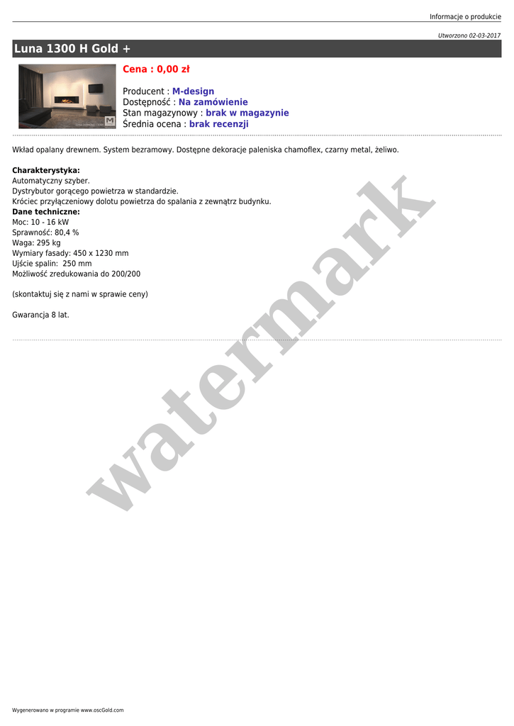 Informacje o produkcie Utworzono 02-03-2017 Luna 1300 H Gold + Cena : 0,00 zł Producent : M-design Dostępność : Na zamówienie Stan magazynowy : brak w magazynie Średnia ocena : brak recenzji Wkład opalany drewnem. System bezramowy. Dostępne dekoracje paleniska chamoflex, czarny metal, żeliwo. er m ar k Charakterystyka: Automatyczny szyber. Dystrybutor gorącego powietrza w standardzie. Króciec przyłączeniowy dolotu powietrza do spalania z zewnątrz budynku. Dane techniczne: Moc: 10 - 16 kW Sprawność: 80,4 % Waga: 295 kg Wymiary fasady: 450 x 1230 mm Ujście spalin: 250 mm Możliwość zredukowania do 200/200 (skontaktuj się z nami w sprawie ceny) w at Gwarancja 8 lat. Wygenerowano w programie www.oscGold.com
