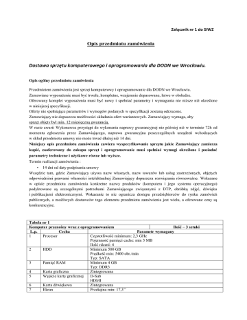Załącznik nr 1 do SIWZ Opis przedmiotu zamówienia Dostawa sprzętu komputerowego i oprogramowania dla DODN we Wrocławiu. Opis ogólny przedmiotu zamówienia Przedmiotem zamówienia jest sprzęt komputerowy i oprogramowanie dla DODN we Wrocławiu. Zamawiane wyposażenie musi być trwałe, kompletne, wzajemnie dopasowane, łatwe w obsłudze. Oferowany komplet wyposażenia musi być nowy i spełniać parametry i wymagania nie niższe niż określone w niniejszej specyfikacji. Oferty nie spełniające parametrów i wymogów podanych w specyfikacji zostaną odrzucone. Zamawiający nie dopuszcza możliwości składania ofert wariantowych. Zamawiający wymaga, aby sprzęt objęty był min. 12 miesięczną gwarancją. W razie awarii Wykonawca przystąpi do wykonania naprawy gwarancyjnej nie później niż w terminie 72h od momentu zgłoszenia przez Zamawiającego, naprawa gwarancyjna poszczególnych urządzeń wchodzących w skład przedmiotu umowy nie może trwać dłużej niż 14 dni. Niniejszy opis przedmiotu zamówienia zawiera wyspecyfikowanie sprzętu jakie Zamawiający zamierza kupić, zaoferowany do zakupu sprzęt i oprogramowanie musi spełniać wymogi określone i posiadać parametry techniczne i użytkowe równe lub wyższe. Termin realizacji zamówienia : • 14 dni od daty podpisania umowy Wszędzie tam, gdzie Zamawiający używa nazw własnych, nazw towarów lub usług zastrzeżonych, objętych odpowiednimi prawami własności intelektualnej Zamawiający dopuszcza rozwiązania równoważne. Wskazane w opisie przedmiotu zamówienia konkretne nazwy produktów (komputera i jego systemu operacyjnego) podyktowane są szczególnymi potrzebami Zamawiającego związanymi z DTP, obróbką zdjęć, dźwięku i publikacjami elektronicznymi. Wskazanie to nie ogranicza dostępu przedsiębiorców do rynku zamówień publicznych, a możliwych dostawców tego elementu przedmiotu zamówienia jest wielu, a oferowane ceny są konkurencyjne. Tabela nr 1 Komputer przenośny wraz z oprogramowaniem Ilość – 3 sztuki L.p. Cecha Parametr wymagany 1 Procesor Częstotliwość minimum: 2,3 GHz Pojemność pamięci cache: min 3 MB Ilość rdzeni: 4 2 HDD Minimum 500 GB Prędkość min: 5400 obr./min Typ: SATA 3 Pamięć RAM Minimum 4 GB Typ: DDR3 4 Karta graficzna Zintegrowana 5 Wyjście karty graficznej D-Sub HDMI 6 Karta dźwiękowa Zintegrowana 7 Ekran Przekątna min: 17,3’’ 8 Komunikacja 9 Wyposażenie 10 11 Dodatkowe Oprogramowanie 12 13 Waga Gwarancja Nominalna rozdzielczość: 1600x900 Typ ekranu: LED WiFi (IEEE 802.11 b/g/n) LAN 10/100 Minimum 3x USB Kamera z wbudowanym mikrofonem Wbudowane głośniki stereo Czytnik kart SD Wejście mikrofonowe Wejście słuchawkowe/głośnikowe Mysz optyczna USB, torba na ramię Preinstalowany system operacyjny z oryginalnym nośnikiem instalacyjnym, Microsoft Windows 7 lub równoważny spełniający następujące kryteria: 1) system operacyjny z graficznym interfejsem użytkownika w języku polskim, w tym także system interaktywnej pomocy w języku polskim. 2) system operacyjny z zintegrowanym systemem aktualizacji darmowych poprawek bezpieczeństwa, przy czym komunikacja z użytkownikiem powinna odbywać się w języku polskim; 3) możliwość zdalnej automatycznej instalacji, konfiguracji, administrowania oraz aktualizowania systemu; 4) system operacyjny musi mieć publicznie znany cykl życia przedstawiony przez producenta i dotyczący rozwoju i wsparcia technicznego – w szczególności w zakresie bezpieczeństwa; 5) system operacyjny musi pozwalać na pracę w różnych sieciach komputerowych (sieci lokalne LAN, Internet), w tym także automatycznie rozpoznawać sieci i ich ustawienia bezpieczeństwa, rozpoznawać automatycznie urządzenia peryferyjne działające w tej sieci (np. drukarki, tablice interaktywne) oraz łączyć się automatycznie z raz zdefiniowanymi sieciami; 6) system operacyjny pozwalający na wdrożenie jednolitej polityki bezpieczeństwa dla wszystkich komputerów w sieci lokalnej. Maksymalnie 3,5 kg z baterią 36 miesięcy – pożądana, jednak nie mniejsza niż 12 miesięcy Tabela nr 2 Komputer przenośny wraz z oprogramowaniem Ilość – 3 sztuki L.p. Cecha Parametr wymagany 1 Procesor Częstotliwość minimum: 2,3 GHz Pojemność pamięci cache: min 3 MB Ilość rdzeni: 4 2 HDD Minimum 500 GB Prędkość min: 5400 obr./min Typ: SATA 3 Pamięć RAM Minimum 4 GB Typ: DDR3 4 Karta graficzna Zintegrowana 5 Wyjście karty graficznej D-Sub HDMI 6 Karta dźwiękowa Zintegrowana 7 Ekran Przekątna min: 15,6’’ Nominalna rozdzielczość: 1366x768 Typ ekranu: LED 8 Komunikacja WiFi (IEEE 802.11 b/g/n) LAN 10/100 Minimum 3x USB 9 Wyposażenie Kamera z wbudowanym mikrofonem Wbudowane głośniki stereo Czytnik kart SD 10 11 Dodatkowe Oprogramowanie 12 13 Waga Gwarancja Wejście mikrofonowe Wejście słuchawkowe/głośnikowe Mysz optyczna USB, torba na ramię Preinstalowany system operacyjny z oryginalnym nośnikiem instalacyjnym, Microsoft Windows 7 lub równoważny spełniający następujące kryteria: 1) system operacyjny z graficznym interfejsem użytkownika w języku polskim, w tym także system interaktywnej pomocy w języku polskim. 2) system operacyjny z zintegrowanym systemem aktualizacji darmowych poprawek bezpieczeństwa, przy czym komunikacja z użytkownikiem powinna odbywać się w języku polskim; 3) możliwość zdalnej automatycznej instalacji, konfiguracji, administrowania oraz aktualizowania systemu; 4) system operacyjny musi mieć publicznie znany cykl życia przedstawiony przez producenta i dotyczący rozwoju i wsparcia technicznego – w szczególności w zakresie bezpieczeństwa; 5) system operacyjny musi pozwalać na pracę w różnych sieciach komputerowych (sieci lokalne LAN, Internet), w tym także automatycznie rozpoznawać sieci i ich ustawienia bezpieczeństwa, rozpoznawać automatycznie urządzenia peryferyjne działające w tej sieci (np. drukarki, tablice interaktywne) oraz łączyć się automatycznie