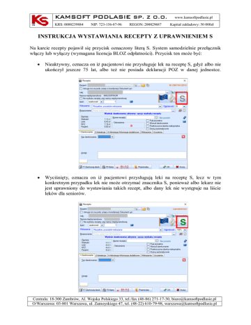 KAMSOFT PODLASIE SP. Z O.O. KRS: 0000239884 NIP: 723-156-87-96 REGON: 200029687 www.kamsoftpodlasie.pl Kapitał zakładowy: 50 000zł INSTRUKCJA WYSTAWIANIA RECEPTY Z UPRAWNIENIEM S Na karcie recepty pojawił się przycisk oznaczony literą S. System samodzielnie przełącznik włączy lub wyłączy (wymagana licencja BLOZ odpłatności). Przycisk ten może być: Nieaktywny, oznacza on iż pacjentowi nie przysługuje lek na receptę S, gdyż albo nie ukończył jeszcze 75 lat, albo też nie posiada deklaracji POZ w danej jednostce. Wyciśnięty, oznacza on iż pacjentowi przysługują leki na receptę S, lecz w tym konkretnym przypadku lek nie może otrzymać znacznika S, ponieważ albo lekarz nie jest uprawniony do wystawiania takich recept, albo dany lek nie występuje na liście leków dla seniorów. Centrala: 18-300 Zambrów, Al. Wojska Polskiego 33, tel./fax (48-86) 271-17-30, [email protected] O/Warszawa: 03-801 Warszawa, ul. Zamoyskiego 47, tel. (48-22) 610-79-98, [email protected] KAMSOFT PODLASIE SP. Z O.O. KRS: 0000239884 NIP: 723-156-87-96 REGON: 200029687 www.kamsoftpodlasie.pl Kapitał zakładowy: 50 000zł Wciśnięty, ten lek trafi na receptę ze znacznikiem S, a więc i recepta taki znacznik otrzyma. Spełnione są wszystkie konieczne warunku aby receptę S wystawić Oprócz informacji o uprawnieniu S pojawia się także właściwa odpłatność za lek (np. 30%), taka z jaką wystawiony zostałby lek, gdyby pacjent nie miał uprawnień seniora. Jest to zgodne z rozporządzeniem o receptach i z informacji Ministra Zdrowia, z których wynika, że odpłatność na receptach musi być zachowana taka jak w przypadku pozostałych pacjentów, a w części uprawnień dodatkowych ma pojawić się litera S. Recepta dla seniora może wyglądać tak: Centrala: 18-300 Zambrów, Al. Wojska Polskiego 33, tel./fax (48-86) 271-17-30, [email protected] O/Warszawa: 03-801 Warszawa, ul. Zamoyskiego 47, tel. (48-22) 610-79-98, [email protected]