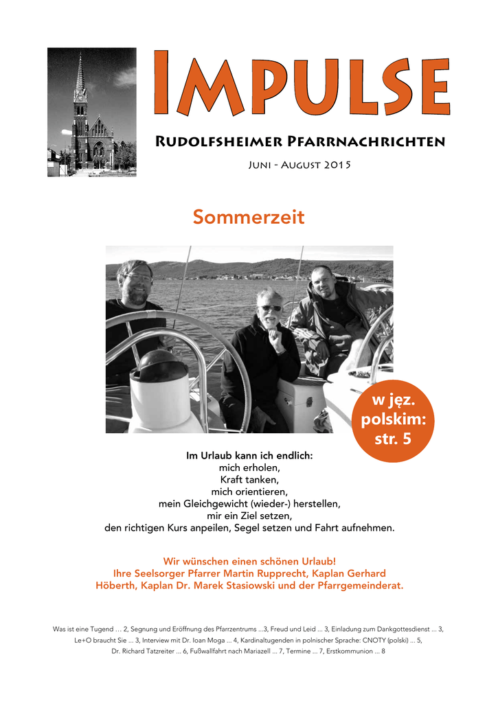 Impulse Rudolfsheimer Pfarrnachrichten Juni - August 2015 Sommerzeit w jęz. polskim: str. 5 Im Urlaub kann ich endlich: mich erholen, Kraft tanken, mich orientieren, mein Gleichgewicht (wieder-) herstellen, mir ein Ziel setzen, den richtigen Kurs anpeilen, Segel setzen und Fahrt aufnehmen. Wir wünschen einen schönen Urlaub! Ihre Seelsorger Pfarrer Martin Rupprecht, Kaplan Gerhard Höberth, Kaplan Dr. Marek Stasiowski und der Pfarrgemeinderat. Was ist eine Tugend … 2, Segnung und Eröffnung des Pfarrzentrums ...3, Freud und Leid ... 3, Einladung zum Dankgottesdienst ... 3, Le+O braucht Sie ... 3, Interview mit Dr. Ioan Moga ... 4, Kardinaltugenden in polnischer Sprache: CNOTY (polski) ... 5, Dr. Richard Tatzreiter ... 6, Fußwallfahrt nach Mariazell ... 7, Termine ... 7, Erstkommunion ... 8 Die Tugenden „Was immer wahrhaft, edel, recht, was lauter, liebenswert, ansprechend ist, was Tugend heißt und lobenswert ist, darauf seid bedacht!“ (Phil 4,8). Die Tugend ist eine beständige, feste Neigung, das Gute zu tun. Sie ermöglicht dem Menschen nicht nur gute Taten zu vollbringen, sondern sein Bestes zu leisten. Mit all seinen sinnlichen und geistigen Kräften strebt der tugendhafte Mensch nach dem Guten. Er sucht es zu erreichen und entscheidet sich bei seinen konkreten Handlungen dafür. „Das Ziel eines tugendhaften Lebens besteht darin, Gott ähnlich zu werden“ (Gregor von Nyssa). Die menschlichen Tugenden Die menschlichen Tugenden sind feste Haltungen, verlässliche Neigungen, beständige Vollkommenheit des Verstandes und des Willens, die unser Tun regeln, unsere Leidenschaften ordnen und unser Verhalten der Vernunft und dem Glauben entsprechend lenken. Sie verleihen dem Menschen Leichtigkeit, Sicherheit und Freude zur Führung eines sittlich guten Lebens. Der tugendhafte Mensch tut freiwillig das Gute. Die sittlichen Tugenden werden durch menschliches Bemühen erworben. Die Kardinaltugenden Vier Tugenden sind Angelpunkte des sittlichen Lebens. Aus diesem Grund nennt man sie „Kardinal“-Tugenden; alle anderen sind rund um sie angeordnet. Es sind dies die Klugheit, die Gerechtigkeit, die Tapferkeit und die Mäßigung. Die Klugheit ist jene Tugend, welche die praktische Vernunft bereit macht, in jeder Lage unser wahres Gut zu erfassen und die richtigen Mittel zu wählen, um es zu erlangen. „Der Kluge achtet auf seinen Schritt“ (Spr 14,15). „Seid also besonnen und nüchtern, und betet!“ (1 Petr 4,7). „Klugheit ist die rechte Vernunft als Grund des Handelns“, schreibt der hl. Thomas im Anschluss an Aristoteles. Sie hat nichts mit Schüchternheit oder Ängstlichkeit, mit Doppelzüngigkeit oder Verstellung zu tun. Man nennt sie „auriga virtutum“ [Lenkerin der Tugenden]: Sie steuert die anderen Tugenden, indem sie ihnen Regel und Maß gibt. Die Gerechtigkeit als sittliche Tugend ist der beständige, feste Wille, Gott und dem Nächsten das zu geben, was ihnen gebührt. Die Gerechtigkeit gegenüber Gott nennt man „Tugend der Gottesverehrung“. Gerechtigkeit gegenüber Menschen ordnet darauf hin, die Rechte eines jeden zu achten und in den menschlichen Beziehungen jene Harmonie herzustellen, welche die Rechtschaffenheit gegenüber den Personen und dem Gemeinwohl fördert. Der gerechte Mensch, von dem in der Heiligen Schrift oft gesprochen wird, zeichnet sich durch die ständige Geradheit seines Denkens und die Richtigkeit seines Verhaltens gegenüber dem Nächsten aus. „Du sollst weder für einen Geringen noch für einen Großen Partei nehmen; gerecht sollst du deinen Stammesgenossen richten“ (Lev 19,15). Die Tapferkeit ist jene sittliche Tugend, die in Schwierigkeiten standhalten und im Erstreben des Guten durchhalten lässt. Sie festigt die Entschlossenheit, Versuchungen zu widerstehen und im sittlichen Leben Hindernisse zu überwinden. Die Tugend der Tapferkeit befähigt, die Angst, selbst die vor dem Tod, zu besiegen und allen Prüfungen und Verfolgungen die Stirn zu bieten. Sie macht bereit, für eine gerechte Sache auch das eigene Leben zu opfern. Die Mäßigung ist jene sittliche Tugend, welche die Neigung zu verschiedenen Vergnügungen zügelt und im Gebrauch geschaffener Güter das rechte Maß einhalten lässt. Sie sichert die Herrschaft des Willens über die Triebe und lässt die Begierden die Grenzen des Ehrbaren nicht überschreiten. Die Tugend des Maßhaltens wird im Alten Testament oft gelobt: „FoIge nicht deinen Begierden, von deinen Gelüsten halte dich fern!“ (Sir 18,30). Im Neuen Testament wird sie „Besonnenheit“ oder „Nüchternheit“ genannt. Wir sollen „besonnen, gerecht und fromm in dieser Welt leben“ (Tit 2,12). Aus dem Katechismus der katholischen Kirche: www.vatican.va/archive/DEU0035/_P6B.HTM Seite 2 Mehr Info: www.pfarre-rudolfsheim.at Segnung und Eröffnung des renovierten Pfarrzentrums w enn Sie in den nächsten Wochen ins Pfarrzentrum oder in die Kanzlei kommen, werden Sie die neu renovierten Räume bemerken. Am meisten freuen wir uns über die Heizung, die neue Toilettenanlage und den Pfarrsaal, der allerdings erst im August fertiggestellt wird. Zum Patronatsfest unserer Pfarre am 13. September möchten wir die Segnung des gesamten Hauses begehen. Bis dahin und darüber hinaus müssen wir kräftig sparen, denn die Kosten der Renovierung belasten sehr. Wir bitten daher alle Gemeindemitglieder um Hilfe: Mit beiliegendem Zahlschein, in der Sammlung des ersten Sonntags im Monat – oder vielleicht haben Sie noch Silbermünzen, Gedenkmünzen, kleine Golddukaten, Schillingscheine oder alte Münzen zu Hause? Wäre das nicht ein Geschenk für den Saal unserer Gemeinde? Herzliche Einladung zum Dankgottesdienst Am Sonntag, den 13. September, um 10 Uhr! Patrozinium, Eröffnung des Pfarrzentrums, Pfarrfest (keine 8.30-Uhr-Messe!) oben: Johann (rechts), unser Vorarbeiter, arbeitet unermüdlich an der Fertigstellung der Renovierung. Vieles war nicht planbar und bereitet ihm Kopfzerbrechen. Freud und Leid in Rudolfsheim Aus unsere