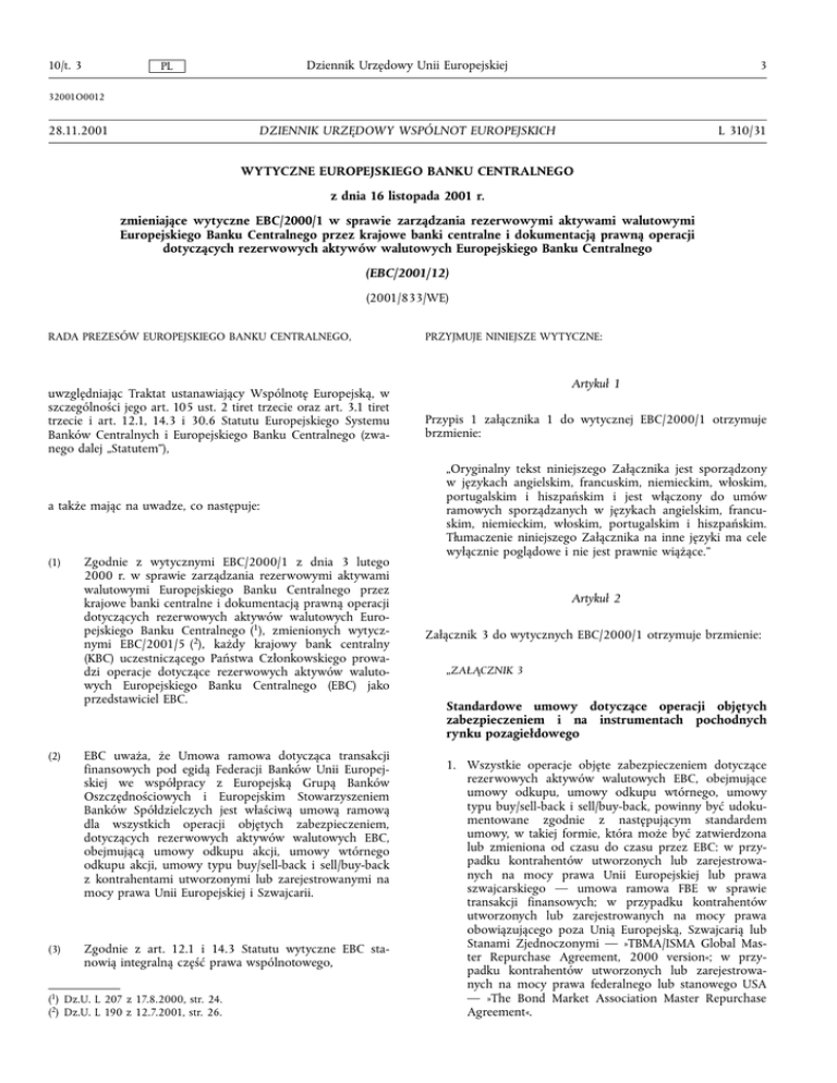 10/t. 3 Dziennik Urzędowy Unii Europejskiej PL 3 32001O0012 28.11.2001 L 310/31 DZIENNIK URZĘDOWY WSPÓLNOT EUROPEJSKICH WYTYCZNE EUROPEJSKIEGO BANKU CENTRALNEGO z dnia 16 listopada 2001 r. zmieniające wytyczne EBC/2000/1 w sprawie zarządzania rezerwowymi aktywami walutowymi Europejskiego Banku Centralnego przez krajowe banki centralne i dokumentacją prawną operacji dotyczących rezerwowych aktywów walutowych Europejskiego Banku Centralnego (EBC/2001/12) (2001/833/WE) RADA PREZESÓW EUROPEJSKIEGO BANKU CENTRALNEGO, uwzględniając Traktat ustanawiający Wspólnotę Europejską, w szczególności jego art. 105 ust. 2 tiret trzecie oraz art. 3.1 tiret trzecie i art. 12.1, 14.3 i 30.6 Statutu Europejskiego Systemu Banków Centralnych i Europejskiego Banku Centralnego (zwanego dalej „Statutem”), a także mając na uwadze, co następuje: (1) Zgodnie z wytycznymi EBC/2000/1 z dnia 3 lutego 2000 r. w sprawie zarządzania rezerwowymi aktywami walutowymi Europejskiego Banku Centralnego przez krajowe banki centralne i dokumentacją prawną operacji dotyczących rezerwowych aktywów walutowych Europejskiego Banku Centralnego (1), zmienionych wytycznymi EBC/2001/5 (2), każdy krajowy bank centralny (KBC) uczestniczącego Państwa Czlonkowskiego prowadzi operacje dotyczące rezerwowych aktywów walutowych Europejskiego Banku Centralnego (EBC) jako przedstawiciel EBC. (2) EBC uważa, że Umowa ramowa dotycząca transakcji finansowych pod egidą Federacji Banków Unii Europejskiej we wspólpracy z Europejską Grupą Banków Oszczędnościowych i Europejskim Stowarzyszeniem Banków Spóldzielczych jest wlaściwą umową ramową dla wszystkich operacji objętych zabezpieczeniem, dotyczących rezerwowych aktywów walutowych EBC, obejmującą umowy odkupu akcji, umowy wtórnego odkupu akcji, umowy typu buy/sell-back i sell/buy-back z kontrahentami utworzonymi lub zarejestrowanymi na mocy prawa Unii Europejskiej i Szwajcarii. (3) Zgodnie z art. 12.1 i 14.3 Statutu wytyczne EBC stanowią integralną część prawa wspólnotowego, (1) Dz.U. L 207 z 17.8.2000, str. 24. (2) Dz.U. L 190 z 12.7.2001, str. 26. PRZYJMUJE NINIEJSZE WYTYCZNE: Artykul 1 Przypis 1 zalącznika 1 do wytycznej EBC/2000/1 otrzymuje brzmienie: „Oryginalny tekst niniejszego Zalącznika jest sporządzony w językach angielskim, francuskim, niemieckim, wloskim, portugalskim i hiszpańskim i jest wlączony do umów ramowych sporządzanych w językach angielskim, francuskim, niemieckim, wloskim, portugalskim i hiszpańskim. Tlumaczenie niniejszego Zalącznika na inne języki ma cele wylącznie poglądowe i nie jest prawnie wiążące.” Artykul 2 Zalącznik 3 do wytycznych EBC/2000/1 otrzymuje brzmienie: „ZALĄCZNIK 3 Standardowe umowy dotyczące operacji objętych zabezpieczeniem i na instrumentach pochodnych rynku pozagieldowego 1. Wszystkie operacje objęte zabezpieczeniem dotyczące rezerwowych aktywów walutowych EBC, obejmujące umowy odkupu, umowy odkupu wtórnego, umowy typu buy/sell-back i sell/buy-back, powinny być udokumentowane zgodnie z następującym standardem umowy, w takiej formie, która może być zatwierdzona lub zmieniona od czasu do czasu przez EBC: w przypadku kontrahentów utworzonych lub zarejestrowanych na mocy prawa Unii Europejskiej lub prawa szwajcarskiego — umowa ramowa FBE w sprawie transakcji finansowych; w przypadku kontrahentów utworzonych lub zarejestrowanych na mocy prawa obowiązującego poza Unią Europejską, Szwajcarią lub Stanami Zjednoczonymi — »TBMA/ISMA Global Master Repurchase Agreement, 2000 version«; w przypadku kontrahentów utworzonych lub zarejestrowanych na mocy prawa federalnego lub stanowego USA — »The Bond Market Association Master Repurchase Agreement«. 4 PL Dziennik Urzędowy Unii Europejskiej 2. Wszystkie operacje na instrumentach pochodnych rynku pozagieldowego dotyczące rezerwowych aktywów walutowych EBC powinny być udokumentowane zgodnie z następującym standardem umowy, w takiej formie, która może być zatwierdzona lub zmieniona od czasu do czasu przez EBC; w przypadku kontrahentów utworzonych lub zarejestrowanych na mocy prawa francuskiego — »Convention-cadre relative aux opérations de marché à terme«; w przypadku kontrahentów utworzonych lub zarejestrowanych na mocy prawa niemieckiego — »Rahmenvertrag für echte Finanztermingeschäfte«; w przypadku kontrahentów utworzonych lub zarejestrowanych na mocy prawa obowiązującego poza Francją, Niemcami i Stanami Zjednoczonymi, »1992 International Swaps and Derivatives Association Master Agreement« (Wielowalutowy — transgraniczny, wersja podlegająca prawu angielskiemu); w przypadku kontrahentów utworzonych lub zarejestrowanych na mocy prawa federalnego lub praw stanowych USA — »1992 International Swaps and Derivatives Association Master Agreement« (Wielowalutowy — transgraniczny, wersja podlegająca prawu Nowego Jorku).” 10/t. 3 Artykul 3 Przepisy końcowe Niniejsze wytyczne są skierowane do krajowych banków centralnych uczestniczących Państw Czlonkowskich. Niniejsze wytyczne wchodzą w życie z dniem 23 listopada 2001 r. Niniejsze wytyczne są opublikowane w Dzienniku Urzędowym Wspólnot Europejskich. Sporządzono we Frankfurcie nad Menem, dnia 16 listopada 2001 r. W imieniu Rady Prezesów EBC Willem F. DUISENBERG Prezes