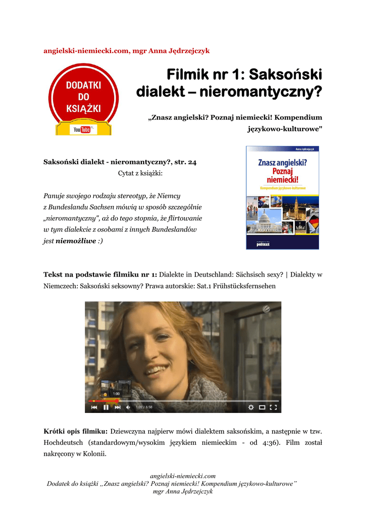 angielski-niemiecki.com, mgr Anna Jędrzejczyk Filmik nr 1: Saksoński dialekt – nieromantyczny? „Znasz angielski? Poznaj niemiecki! Kompendium językowo-kulturowe" Saksoński dialekt - nieromantyczny?, str. 24 Cytat z książki: Panuje swojego rodzaju stereotyp, że Niemcy z Bundeslandu Sachsen mówią w sposób szczególnie „nieromantyczny", aż do tego stopnia, że flirtowanie w tym dialekcie z osobami z innych Bundeslandów jest niemożliwe :) Tekst na podstawie filmiku nr 1: Dialekte in Deutschland: Sächsisch sexy? | Dialekty w Niemczech: Saksoński seksowny? Prawa autorskie: Sat.1 Frühstücksfernsehen Krótki opis filmiku: Dziewczyna najpierw mówi dialektem saksońskim, a następnie w tzw. Hochdeutsch (standardowym/wysokim językiem niemieckim - od 4:36). Film został nakręcony w Kolonii. angielski-niemiecki.com Dodatek do książki „Znasz angielski? Poznaj niemiecki! Kompendium językowo-kulturowe” mgr Anna Jędrzejczyk TRANSKRYPCJA DIALOGU 1 (1:15 – 1:50) – w dialekcie saksońskim Wersja po niemiecku Wersja po polsku D: Przepraszam, jesteście z Kolonii? A: Nee*, wir kommen aus Hannover. Wir … A: Niee, jesteśmy z Hanoweru. D: Nie orientujecie się też tutaj? (dosłownie keine Ahnung! tłum.)./ Też nie znacie tego miasta D: Kennt euch hier auch nicht aus?* (niedosłowne tłum.)? A: Niee. A: Nee*. D: Ok, szkoda. D: Okay, schade. Habt ihr vielleicht Zeit, trotzdem was zu Pomimo tego macie może czas, aby czegoś się napić, lub zrobić coś innego? Jestem trinken*, oder so? Ich bin total alleine hier. tutaj całkowicie sama. Ich bin das erste Mal in Köln. Ich komme Jestem pierwszy raz w Kolonii. Pochodzę właściwie z Drezna. eigentlich aus Dresden. Und ich bin hier irgendwie so’n* bisschen I jestem tak troszkę zagubiona. verloren. A: Co ty tu robisz? A: Was machst du hier? D: Ich besuch* meinen Cousin, aber der* D: Odwiedzam mojego kuzyna, ale on jeszcze pracuje… do 18:00. arbeitet noch ... bis 18 Uhr. Und ich habe irgendwie gedacht ... die Zeit I pomyślałam sobie… jakoś spędzę ten kriege ich schon rum ... so ein bisschen czas… tak trochę zobaczyć… ale widziałam gucken … aber jetzt habe ich den Dom już tę katedrę, teraz widziałam ten… w gesehen, jetzt habe ich den … im muzeum czekolady byłam już… no, nie wiem Schokoladenmuseum war ich schon ... ich już… weiß auch nicht mehr … D: Entschuldigung, seid ihr aus Köln?* A: Das Ding ist, wir haben gleich einen A: Sprawa jest taka: Mamy zaraz umówione spotkanie. Jesteśmy tu służbowo. Termin. Wir sind geschäftlich hier. D: Ok. D: Okay. A: Das ist das Problem. Sonst sehr gerne A: To jest ten problem (dosłowne tłum.). O to chodzi (niedosłownie tłum.). (auf jeden Fall). W przeciwnym razie chętnie. D: Szkoda. D: Schade. TRANSKRYPCJA DIALOGU 2 (4:44 – 5:03) – w Hochdeutsch A: Hallo, Entschuldigung, eine Frage: kommst du hier aus Köln? D: Nee.* A: Nee?* Ich nämlich auch nicht. Ich kenne mich hier nicht so gut aus und wollte nur fragen, ob du eventuell Lust oder Zeit hast, kurz noch etwas trinken zu gehen? D: Das passt ganz gut. Ich komme aus München. Ich bin auch gerade erst angekommen. Warum eigentlich net? A: Okay. Ja, super. Cool. Das freut mich. Ich bin übrigens Marie. A: Cześć, przepraszam, jedno pytanie: Jesteś stąd z Kolonii? D: Niee. A: Niee? Ja właśnie też nie. Nie orientuje się tu za bardzo (dosłowne tłum.)/Nie znam tego miasta (niedosłowne tłum.) i chciałabym tylko zapytać, czy miałbyś ewentualnie ochotę lub czas, aby pójść się czegoś napić? D: To mi pasuje (dosłownie tłum.)/Dobrze się składa (niedosłowne tłum.) . Ja pochodzę z Monachium. Ja też właśnie dopiero przyjechałem… Dlaczego nie? A: Ok. Tak, super. Cool. Cieszy mnie to. Nazywam się poza tym Marie. angielski-niemiecki.com Dodatek do książki „Znasz angielski? Poznaj niemiecki! Kompendium językowo-kulturowe” mgr Anna Jędrzejczyk *Potoczne wyrażenia, które są potoczne. akceptowalne W formalnym wypracowaniu nie byłyby Wie es im Transkript ist, wie es sein sollte. Seid ihr aus Köln? – Kommt ihr aus Köln? Nee – Nein Kennt euch hier auch nicht aus? – Kennt ihr euch hier auch nicht aus? so’n – so ein besuch – besuche der – er Habt ihr vielleicht Zeit, trotzdem was trinken zu gehen – powinno być: Habt ihr vielleicht Zeit, trotzdem etwas trinken zu gehen? Net – Nicht ZAGADKA – znajdź nowe słówko opisujące społeczne zjawisko w Niemczech 2:23 – 2:24 – ten sam filmik str. 135 – strona w książce Jakie słówko mam na myśli? Podpowiedź: przezwisko. angielski-niemiecki.com Dodatek do książki „Znasz angielski? Poznaj niemiecki! Kompendium językowo-kulturowe” mgr Anna Jędrzejczyk