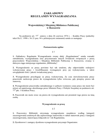 ZAKŁADOWY REGULAMIN WYNAGRADZANIA w Wojewódzkiej i Miejskiej Bibliotece Publicznej w Rzeszowie Na podstawie art. 772 ustawy z dnia 26 czerwca 1974 r. – Kodeks Pracy (jednolity tekst Dz.U. 1998 r. Nr 21 poz. 94 z późniejszymi zmianami) ustala co następuje: Postanowienia ogólne §1 1. Zakładowy Regulamin Wynagradzania zwany dalej „Regulaminem” ustala warunki zatrudnienia, wynagradzania oraz przyznawania innych świadczeń związanych z pracą pracowników Wojewódzkiej i Miejskiej Biblioteki Publicznej w Rzeszowie, zwanej w dalszym ciągu niniejszego regulaminu „Biblioteką”. 2. Wynagrodzenie za pracę powinno być tak ustalone, aby odpowiadało rodzajowi wykonywanej pracy i kwalifikacjom wymaganym przy jej wykonywaniu, a także uwzględniało ilość i jakość świadczonej pracy. 3. Wynagrodzenie przysługuje za pracę wykonywaną. Za czas niewykonywania pracy pracownik zachowuje prawo do wynagrodzenia tylko wówczas, gdy przepisy prawa tak stanowią. 4. Wynagrodzenie pracownika zatrudnionego w pełnym wymiarze czasu pracy nie może być niższe od najniższego określonego przez Ministra Pracy i Polityki Socjalnej na podstawie art. 774 pkt. 1 Kodeksu Pracy. 5. Pracownik nie może zrzec się prawa do wynagrodzenia ani przenieść tego prawa na inną osobę. Wynagrodzenie za pracę §2 1. Pracownicy Biblioteki otrzymują wynagrodzenie zasadnicze według kategorii zaszeregowania ustalonych dla zajmowanego stanowiska w tabeli stanowisk pracy i kategorii zaszeregowania, stanowiącej Załącznik nr 1 do Regulaminu. 2. Dyrektorowi i zastępcy dyrektora wynagrodzenie przyznaje Organizator. 1 3. Stawki wynagrodzeń zasadniczych dla poszczególnych kategorii zaszeregowania ustala tabela stanowiąca Załącznik nr 2 do Regulaminu. 4. Pracownicy pełniący funkcje kierownicze lub zatrudnieni na samodzielnych stanowiskach pracy otrzymują dodatki funkcyjne wg stawek procentowych minimalnej stawki. 5. Stawki dodatków funkcyjnych oraz stanowiska uprawniające do nich określa tabela dodatków funkcyjnych stanowiąca Załącznik nr 3 do Regulaminu. 6. Ilekroć w niniejszym Regulaminie jest mowa o „minimalnej stawce”, rozumie się przez to minimalną stawkę miesięcznego wynagrodzenia zasadniczego w pierwszej kategorii zaszeregowania, określoną w Załączniku nr 2 do Regulaminu. §3 1. Pracownikom przysługuje dodatek za wysługę lat w wysokości 5 procent miesięcznego wynagrodzenia zasadniczego po 5. latach pracy, wzrastający o 1 procent za każdy następny rok, aż do osiągnięcia 20 procent miesięcznego wynagrodzenia zasadniczego po 20. i dalszych latach pracy. 2. Pracownikom legitymującym się 30. letnim lub dłuższym stażem pracy przysługuje dodatek w wysokości 30 procent miesięcznego wynagrodzenia zasadniczego – jeżeli w Bibliotece, w której są zatrudnieni przepracowali co najmniej ostatnie 10 lat do czasu osiągnięcia 30. letniego lub dłuższego stażu pracy. 3. Do 10. letniego stażu, o którym mowa w ust. 2 zalicza się również okres zatrudnienia w innych instytucjach, jeżeli były to instytucje kultury w rozumieniu ustawy z dnia 25.10.1991 r. o organizowaniu i prowadzeniu działalności kulturalnej (jedn. tekst Dz U. 1997 r. Nr 110 poz. 721 z późn. zm.). 4. Do okresu uprawniającego do dodatku za wysługę lat wlicza się wszystkie poprzednie zakończone okresy zatrudnienia. 5. Do okresu pracy uprawniającego do dodatku za wysługę lat wlicza się także inne okresy, jeżeli z mocy odrębnych przepisów podlegają one wliczeniu do okresu pracy, od którego zależą uprawnienia pracownicze. 6. W przypadku dodatkowego zatrudnienia pracownika prawo do dodatku za wysługę lat ustala się odrębnie dla każdego stosunku pracy. Do okresu dodatkowego zatrudnienia nie podlegają zaliczeniu okresy zatrudnienia podstawowego. 7. Dodatek przysługuje za dni, za które pracownik otrzymuje wynagrodzenie oraz za dni nieobecności w pracy z powodu niezdolności do pracy wskutek choroby bądź konieczność osobistego sprawowania opieki nad dzieckiem lub chorym członkiem rodziny, za które pracownik otrzymuje z tego tytułu wynagrodzenie lub zasiłek z ubezpieczenia społecznego. 2 8. Dodatek za wysługę lat wypłacany jest w terminie wypłaty wynagrodzenia: 1) począwszy od pierwszego dnia miesiąca następującego po miesiącu, w którym pracownik nabył prawo do dodatku lub prawo do wyższej stawki dodatku, jeżeli nabycie prawa nastąpiło w ciągu miesiąca, 2) za dany miesiąc, jeżeli nabycie prawa do dodatku bądź prawa do wyższej stawki dodatku nastąpiło od pierwszego dnia miesiąca. §4 1. Pracownikom przysługuje dodatek za prace wykonywane w warunkach szkodliwych dla zdrowia, szczególnie uciążliwych lub niebezpiecznych w wysokości do 10 procent minimalnej stawki przy pierwszym jako jedynym występującym w Bibliotece stopniu szkodliwości dla zdrowia lub szczególnej uciążliwości. 2. Zasady przyznawania dodatku, o którym mowa w ust. 1 określa Załącznik nr 4 do Regulaminu. §5 1. Pracownikom zatrudnionym na stanowiskach, na których niezbędne jest posługiwanie się językiem obcym, przysługuje dodatek za znajomość języków obcych w wysokości do 20 procent minimalnej stawki za znajomość każdego języka obcego. 2. Zasady przyznawania dodatku określa Załącznik nr 5. §6 Za posiadanie stopnia naukowego doktora przysługuje pracownikowi dodatek w wysokości 20 procent minimalnej stawki. §7 Pracownikom zatrudnionym stale w systemie zmianowym przysługuje za każdą godzinę pracy na drugiej zmianie dodatek w wysokości 10 procent godzinowej stawki wynagrodzenia zasadniczego. Dwuzmianowa organizacja czasu pracy może być wprowadzona w Bibliotece, jeżeli czas pracy obejmuje liczbę godzin wynoszącą co najmniej półtorakrotny obowiązujący w Bibliotece dobowy wymiar czasu pracy. Czas pracy zalicza się do drugiej zmiany, jeżeli godziny rozpoczynania pracy przekraczają przedział połowy dobowego wymiaru czasu pracy obowi