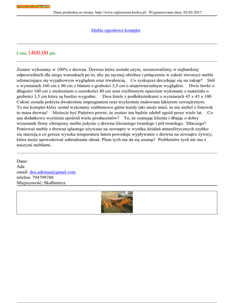 Dane pochodzą ze strony: http://www.ogloszenia-kielce.pl/. Wygenerowano dnia: 02-03-2017. Meble ogrodowe-komplet Cena:1400,00 pln Zestaw wykonany w 100% z drewna Drewno które zostało użyte, sezonowaliśmy w najbardziej odpowiednich dla niego warunkach po to, aby po ręcznej obróbce i połączeniu w całość stworzyć meble odznaczające się wyjątkowym wyglądem oraz trwałością. Co zyskujesz decydując się na zakup? Stół o wymiarach 160 cm x 80 cm z blatem o grubości 3,5 cm o niepowtarzalnym wyglądzie. Dwie ławki o długości 160 cm z siedzeniem o szerokości 40 cm oraz rzeźbionym oparciem wykonane z materiału o grubości 3,5 cm które są bardzo wygodne. Dwa fotele z podłokietnikami o wymiarach 45 x 45 x 100 Całość została pokryta dwukrotnie impregnatem oraz trzykrotnie malowana lakierem zewnętrznym. To nie komplet który został wykonany szablonowo gdzie każdy taki może mieć, to nie mebel z listewek to masa drewna! Możecie być Państwo pewni, że zestaw ten będzie zdobił ogród przez wiele lat. Co nas dodatkowo wyróżnia spośród wielu producentów? To, że szanując klienta i dbając o dobry wizerunek firmy oferujemy meble jedynie z drewna liściastego twardego i pół twardego. Dlaczego? Ponieważ meble z drewna iglastego używane na zewnątrz w wyniku działań atmosferycznych szybko się starzeją a co gorsze wysoka temperatura latem powoduje wypływanie z drewna na zewnątrz żywicy, która może spowodować zabrudzenie ubrań. Plam tych nie da się usunąć! Problemów tych nie ma z naszymi meblami. Dane: Ada email: [email protected] telefon: 794799788 Miejscowość: Skalbmierz