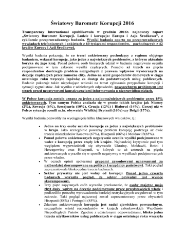 Światowy Barometr Korupcji 2016 Transparency International opublikowała w grudniu 2016r. najnowszy raport „Światowy Barometr Korupcji. Ludzie i korupcja: Europa i Azja Środkowa”, z cyklicznie przeprowadzanego badania. Wyniki badania oparto na przeprowadzonych wywiadach telefonicznych i ankietach z 60 tysiącami respondentów, pochodzących z 42 krajów Europy i Azji Środkowej. Wyniki badania pokazują, że co trzeci ankietowany pochodzący z regionu objętego badaniem, wskazał korupcję, jako jeden z największych problemów, z którym aktualnie boryka się jego kraj. Ponad połowa osób biorących udział w badaniu negatywnie oceniła podejmowane w tym zakresie wysiłki rządzących. Ponadto aż trzech na pięciu respondentów dostrzegło problem niezgodnych z prawem wpływów wywieranych na decyzje rządzących przez zamożne elity. Jedno na sześć gospodarstw domowych w ciągu ostatniego roku wręczyło łapówkę za dostęp do podstawowych usług publicznych. Badanie pokazuje także niepokojące wnioski na temat zgłaszania przypadków korupcji i sytuacji sygnalistów. Jak wynika z udzielonych odpowiedzi, powszechnym problemem jest strach przed negatywnymi konsekwencjami informowania o nieprawidłowościach. W Polsce korupcja została uznana za jeden z najpoważniejszych problemów przez 15% ankietowanych. Tym samym Polska znalazła się w gronie takich krajów jak Niemcy (2%), Szwecja (6%), Szwajcaria (10%), Gruzja (12%) i Białoruś (14%). Gorzej niż w Polsce sytuację ocenili m.in. obywatele Wielkiej Brytanii (16%) czy Belgii (17%). Wyniki badania pozwoliły na wyciągnięcie kilku kluczowych wniosków, tj.: • • • • • • Jedna na trzy osoby uznała korupcję za jeden z największych problemów w kraju. Jako szczególnie poważny problem korupcję postrzega aż dwie trzecie mieszkańców Kosowa (67%), Hiszpanii (66%) i Mołdawii?(65%). Ponad połowa ankietowanych negatywnie oceniła wysiłki podejmowane w walce z korupcją przez rządy ich krajów. Najbardziej krytycznie pod tym względem wypowiedzieli się obywatele Ukrainy, Mołdawii, Bośni i Hercegowiny oraz Hiszpanii, w których to aż czterech na pięciu ankietowanych wyraziło się w sposób negatywny o wysiłkach podejmowanych przez władze. W oczach opinii społecznej grupami zawodowymi uznawanymi za najbardziej skorumpowane są politycy i urzędnicy państwowi. Taki pogląd zaprezentowała blisko jedna trzecia badanych. Sektor prywatny nie jest wolny od korupcji. Ponad jedna czwarta badanych wyraziła pogląd, że sektor prywatny jest wysoce skorumpowany. Trzy piąte zapytanych osób wyraziło przekonanie, że osoby majętne mają zbyt duży wpływ na decyzje podejmowane przez przedstawicieli władz i podkreśliło potrzebę wprowadzenia bardziej restrykcyjnych uregulowań w tym zakresie. Taki pogląd najszerzej został zaprezentowany przez obywateli Hiszpanii (88%) i Portugalii (85%). Zdaniem ankietowanych korupcja jest nadal zjawiskiem powszechnym, szczególnie wśród respondentów w krajach członkowskich Wspólnoty Niepodległych Państw. Zgodnie z udzielonymi odpowiedziami, blisko jedna trzecia użytkowników usług publicznych w ciągu ostatniego roku wręczyła • • • łapówkę (30%). Najwięcej, bo aż 50% ankietowanych, którzy potwierdzili taki fakt, to obywatele Tadżykistanu. Korupcja jest jednak zjawiskiem powszechnym również w niektórych krajach Unii Europejskiej. Najgorszy wynik pod tym względem uzyskały Rumunia (29%) i Litwa (24%). Zgłaszanie przypadków korupcji i przeciwstawianie się jej zostały uznane za najbardziej skuteczne sposoby walki z tą patologią (odpowiednio 18 i 20%). Informowanie o nadużyciach zostało uznane za skuteczne narzędzie głównie w krajach Unii Europejskiej (24%). Nadrzędną przyczyną, z powodu, której przypadki korupcji i nadużyć nie są zgłaszane, jest obawa przed negatywnymi konsekwencjami informowania o nieprawidłowościach (30%). Krajami najgorzej ocenionymi przez ich obywateli w przeprowadzonym badaniu zostały: Armenia, Bośnia i Hercegowina, Litwa, Mołdawia, Rosja, Serbia oraz Ukraina. Na podstawie uzyskanych wyników badania, Transparency International przedstawiła rekomendacje, wśród których znajdują się przede wszystkim walka z korupcją polityczną oraz tworzenie środowiska sprzyjającego zgłaszaniu przypadków korupcji i nadużyć przez obywateli. Eksperci wymieniają m.in. potrzebę wprowadzenia przejrzystych zasad dotyczących działalności lobbingowej oraz przyjęcia i egzekwowania regulacji prawnych, mających na celu ochronę osób zgłaszających korupcję i nadużycia. Źródła: Transparency International (transparency.org);People and Corruption; Europe and Central Asia. Global Corruption Barometer, grudzień 2016r. Bronisław Jaworski, Rzecznik ds. Etyki
