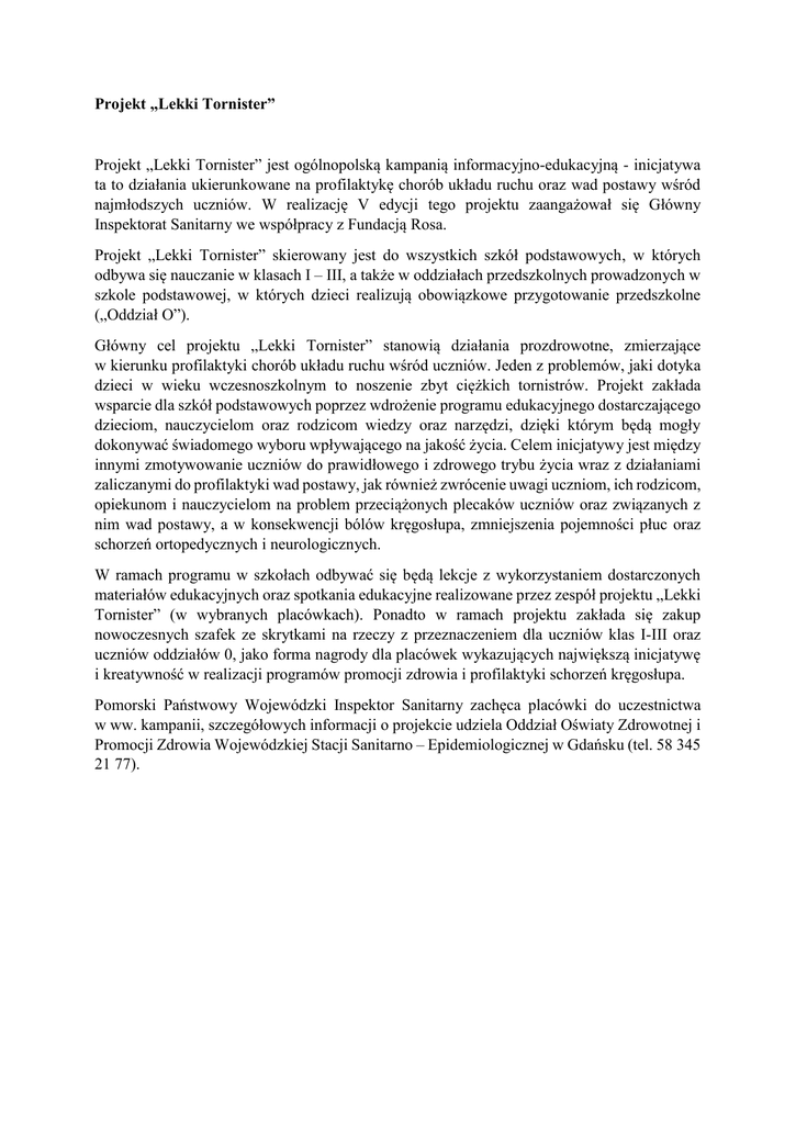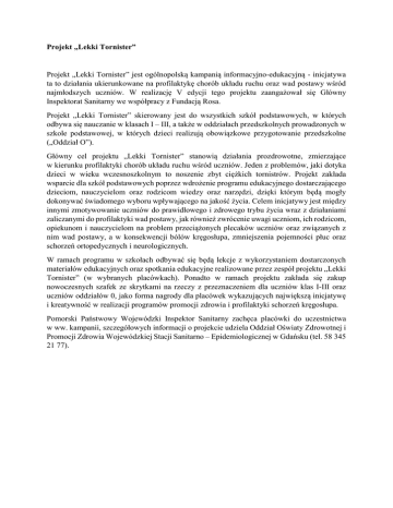 Projekt „Lekki Tornister” Projekt „Lekki Tornister” jest ogólnopolską kampanią informacyjno-edukacyjną - inicjatywa ta to działania ukierunkowane na profilaktykę chorób układu ruchu oraz wad postawy wśród najmłodszych uczniów. W realizację V edycji tego projektu zaangażował się Główny Inspektorat Sanitarny we współpracy z Fundacją Rosa. Projekt „Lekki Tornister” skierowany jest do wszystkich szkół podstawowych, w których odbywa się nauczanie w klasach I – III, a także w oddziałach przedszkolnych prowadzonych w szkole podstawowej, w których dzieci realizują obowiązkowe przygotowanie przedszkolne („Oddział O”). Główny cel projektu „Lekki Tornister” stanowią działania prozdrowotne, zmierzające w kierunku profilaktyki chorób układu ruchu wśród uczniów. Jeden z problemów, jaki dotyka dzieci w wieku wczesnoszkolnym to noszenie zbyt ciężkich tornistrów. Projekt zakłada wsparcie dla szkół podstawowych poprzez wdrożenie programu edukacyjnego dostarczającego dzieciom, nauczycielom oraz rodzicom wiedzy oraz narzędzi, dzięki którym będą mogły dokonywać świadomego wyboru wpływającego na jakość życia. Celem inicjatywy jest między innymi zmotywowanie uczniów do prawidłowego i zdrowego trybu życia wraz z działaniami zaliczanymi do profilaktyki wad postawy, jak również zwrócenie uwagi uczniom, ich rodzicom, opiekunom i nauczycielom na problem przeciążonych plecaków uczniów oraz związanych z nim wad postawy, a w konsekwencji bólów kręgosłupa, zmniejszenia pojemności płuc oraz schorzeń ortopedycznych i neurologicznych. W ramach programu w szkołach odbywać się będą lekcje z wykorzystaniem dostarczonych materiałów edukacyjnych oraz spotkania edukacyjne realizowane przez zespół projektu „Lekki Tornister” (w wybranych placówkach). Ponadto w ramach projektu zakłada się zakup nowoczesnych szafek ze skrytkami na rzeczy z przeznaczeniem dla uczniów klas I-III oraz uczniów oddziałów 0, jako forma nagrody dla placówek wykazujących największą inicjatywę i kreatywność w realizacji programów promocji zdrowia i profilaktyki schorzeń kręgosłupa. Pomorski Państwowy Wojewódzki Inspektor Sanitarny zachęca placówki do uczestnictwa w ww. kampanii, szczegółowych informacji o projekcie udziela Oddział Oświaty Zdrowotnej i Promocji Zdrowia Wojewódzkiej Stacji Sanitarno – Epidemiologicznej w Gdańsku (tel. 58 345 21 77).
