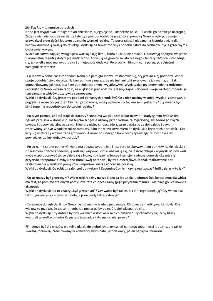 Zig-Zag kid – taje i e dorosły h No o jest wyjątkowo i telige t y dzie kie , a jego oj ie – inspektor policji – kształ i go a swego astęp ę. Żade z i h ie spodziewa się, że tale ty sy a, dosko alo e przez oj a, po ogą No o w odkry iu swojej prawdziwej przeszłość i lepszy poz a iu włas ej rodzi y. Ta poruszają a i ie a al a historia ędzie dla widzów dosko ałą okazją do refleksji i dyskusji a te at rodzi y i podo ieństwa do rodzi ów, y ia grze z y i y ia wyjątkowy . Widzowie łatwo dają się w iąg ąć w wartką ak ję fil u, która udzi sil e e o je. Od zuwają apię ie związa e z kry i al ą zagadką doty zą ą atki No o. Os ylują a gra i y świata real ego i fa tazji hłop a, dowiadują się, jak wielką o a wyo raź ia i u iejęt ość deduk ji. Po projek ji fil u oż a poruszyć z dzieć i astępują e te aty: - Co a y w so ie oś z rodzi ów? No o ie pa ięta a y i zasta awia się, zy jest do iej podo y. Widzi swoje podo ieństwo do oj a. Na ko ie fil u zauważa, że ie jest a i taki zwariowa y jak a a, ani taki uporządkowa y jak tata, jest ki ś zupeł ie oso y i wyjątkowy . Wygłaszają prze ówie ie a rodzi ej uro zystoś i No o wyraża radość, że większość jego rodzi y jest zwy zaj a – do e ia swoją wartość, odelują ty sa y u widzów pozytyw ą sa oo e ę. Wątki do dyskusji: Czy jesteś y podo i do aszy h przodków? Co z i h osi y w so ie: wygląd, za howa ie, poglądy, a oże oś jesz ze? Czy asi przodkowie, ogą wpływać a to, ki sa i jesteś y? Czy oż a yć ki ś zupeł ie iepodo y do swojej rodziny? - Po zy poz ać, że ktoś staje się dorosły? No o a wziąć udział w ar i wie – trady yj y żydowski rytuale przejś ia w dorosłość. Od tej hwili ędzie uz a y przez rodzi ę za ęż zyz ę, świado ego swy h czynów i odpowiedzialnego za nie. Niestety oj ie hłop a ie zawsze uważa go za dojrzałego i ywa z artwio y, że sy wpada w róż e tarapaty. Fil oże yć otwar ie do dyskusji o kryteria h dorosłoś i. Czy li zy się wiek? Czy wew ętrz a gotowość? A oże oś i ego? Jakie e hy sprawiają, że oż a o ki ś powiedzieć, że jest dojrzały, dorosły? - Po o a szalo e po ysły? No o a ogatą wyo raź ię i jest ardzo aktyw y. Jego po ysły takie jak skok z parasole z da hu de erwują rodzi ę: wujowie i iotki o awiają się, o jesz ze hłopak wy yśli. Młody widz oże współod zuwać to, o dzieje się z No o, gdy jego ajlepsze i te je i świet e po ysły okazują się przy zy ą tarapatów. Gdy y No o tłu ił swój pote jał, ył y iesz zęśliwy. Jed ak realizowa ie ez zasta owie ia wszystki h po ysłów i i pulsów ieraz koń zy się porażką. Wątki do dyskusji: Co ro ić z szalo y i po ysła i? )apo i ać o i h, zy je realizować? Jeśli działać – to jak? - Co to z a zy yć grze z y ? Większość rodzi y uważa No o za ło uziaka. Jed o ześ ie koją a o dla widza ma fakt, że po i o szalo y h po ysłów, tata hłop a i Ga y jego przy ra a a a uwiel iają go i ałkowi ie ak eptują. Wątki do dyskusji: Co to z a zy „ yć grze z y ”? Czy warto yć taki , jak i i tego o zekują? Czy warto yć takim, jak wszyscy? – jakie są zalety, a jakie wady takiej sytuacji? - Taje i e dorosły h. Blis y No o ie ówią u wiele o jego at e. Chłopie sa odkrywa, ki yła. Dla widzów to przekaz, że zase trze a się postarać, y poz ać lepiej włas ą rodzi ę. Wątki do dyskusji: Czy do rze yło y wiedzieć wszystko o swoi h liski h? Czy h iało y się, że y lis y wiedzieli wszystko o mnie? Czym jest tajemnica i kto ma do niej prawo? Fil oże yć dla widzów ie tylko okazją do głę oki h prze yśleń a te at tożsa oś i i rodzi y, ale także świet ą rozrywką. )realizowa y w ko we ji kry i ału, jest iekawy, pełe apię ia i hu oru.