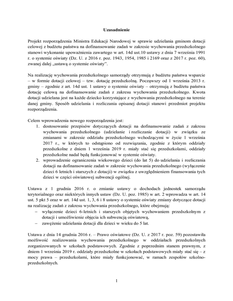 Uzasadnienie Projekt rozporządzenia Ministra Edukacji Narodowej w sprawie udzielania gminom dotacji celowej z budżetu państwa na dofinansowanie zadań w zakresie wychowania przedszkolnego stanowi wykonanie upoważnienia zawartego w art. 14d ust.10 ustawy z dnia 7 września 1991 r. o systemie oświaty (Dz. U. z 2016 r. poz. 1943, 1954, 1985 i 2169 oraz z 2017 r. poz. 60), zwanej dalej „ustawą o systemie oświaty”. Na realizację wychowania przedszkolnego samorządy otrzymują z budżetu państwa wsparcie – w formie dotacji celowej – tzw. dotację przedszkolną. Począwszy od 1 września 2013 r. gminy – zgodnie z art. 14d ust. 1 ustawy o systemie oświaty – otrzymują z budżetu państwa dotację celową na dofinansowanie zadań z zakresu wychowania przedszkolnego. Kwota dotacji udzielana jest na każde dziecko korzystające z wychowania przedszkolnego na terenie danej gminy. Sposób udzielania i rozliczania opisanej dotacji stanowi przedmiot projektu rozporządzenia. Celem wprowadzenia nowego rozporządzenia jest: 1. dostosowanie przepisów dotyczących dotacji na dofinansowanie zadań z zakresu wychowania przedszkolnego (udzielanie i rozliczanie dotacji) w związku ze zmianami w zakresie oddziału przedszkolnego wchodzącymi w życie 1 września 2017 r., w których to odstąpiono od rozwiązania, zgodnie z którym oddziały przedszkolne z dniem 1 września 2019 r. miały stać się przedszkolami, oddziały przedszkolne nadal będą funkcjonować w systemie oświaty. 2. wprowadzenie ograniczenia wiekowego dzieci (do lat 5) do udzielania i rozliczania dotacji na dofinansowanie zadań w zakresie wychowania przedszkolnego (wyłączenie dzieci 6 letnich i starszych z dotacji) w związku z uwzględnieniem finansowania tych dzieci w części oświatowej subwencji ogólnej. Ustawa z 1 grudnia 2016 r. o zmianie ustawy o dochodach jednostek samorządu terytorialnego oraz niektórych innych ustaw (Dz. U. poz. 1985) w art. 2 wprowadza w art. 14 ust. 5 pkt 5 oraz w art. 14d ust. 1, 3, 6 i 8 ustawy o systemie oświaty zmiany dotyczące dotacji na realizację zadań z zakresu wychowania przedszkolnego, które obejmują: wyłączenie dzieci 6-letnich i starszych objętych wychowaniem przedszkolnym z dotacji i umożliwienie objęcia ich subwencją oświatową, zawężenie udzielania dotacji dla dzieci w wieku do 5 lat. Ustawa z dnia 14 grudnia 2016 r. – Prawo oświatowe (Dz. U. z 2017 r. poz. 59) pozostawiła możliwość realizowania wychowania przedszkolnego w oddziałach przedszkolnych zorganizowanych w szkołach podstawowych. Zgodnie z poprzednim stanem prawnym, z dniem 1 września 2019 r. oddziały przedszkolne w szkołach podstawowych miały stać się – z mocy prawa – przedszkolami, które miały funkcjonować, w ramach zespołów szkolnoprzedszkolnych. 1 Biorąc pod uwagę powyższe, proponuje się zmianę polegającą na ograniczeniu udzielania i rozliczania dotacji do grupy dzieci w wieku do lat 5 w tym również wzoru rocznego rozliczenia dotacji celowej z budżetu państwa na dofinansowanie zadań w zakresie wychowania przedszkolnego za jeden rok budżetowy. Wprowadzenie ograniczenia zakresu dotacji do dzieci do lat 5 oznacza, że dotacja nie dotyczy dzieci które ukończą 6 lat w roku kalendarzowym poprzedzającym rok udzielenia dotacji. Generalnie przyjęta została zasada obowiązująca w całej ustawie o systemie oświaty z dnia 7 września 1991 r. o (Dz. U. z 2016 r. poz. 1943 i 1985) zgodnie z którą dzieckiem 6-letnim jest dziecko, które rozpoczyna edukację przedszkolną od nowego roku szkolnego (od września), w roku (kalendarzowym), w którym kończy 6 lat. Podobnie należy definiować dziecko 5letnie. Na dzieci w wieku 6-lat i powyżej realizujące roczne przygotowanie przedszkolne, wykazanych w Systemie Informacji Oświatowej wg stanu na 30 września 2016 r. zostanie naliczona średnia kwota subwencji w wysokości 4,3 tys. zł. Projekt określa tryb udzielania i sposób rozliczania dotacji na dofinansowanie zadań w zakresie wychowania przedszkolnego dzieci w wieku do lat 5, sposób i terminy ustalania informacji o liczbie dzieci, którym nie wskazano miejsca korzystania z wychowania przedszkolnego, sposób ustalania średniorocznej liczby dzieci korzystających z wychowania przedszkolnego na obszarze danej gminy oraz wzór formularza rocznego rozliczenia wykorzystania dotacji. Wydanie rozporządzenia jest konieczne w związku ze zmianami wynikającymi z ustawy – Przepisy wprowadzające ustawę – Prawo oświatowe oraz ustawy o zmianie ustawy o dochodach jednostek samorządu terytorialnego oraz niektórych innych ustaw. Proponuje się, aby przepisy projektu rozporządzenia weszły w życie z dniem następującym po dniu ogłoszenia, z wyjątkiem przepisów § 3 ust. 2, który wejdzie w życie z dniem 1 września 2017 r. Powodem jest to, że gminy powinny w miarę wcześnie znać zasady rozliczania dotacji za rok 2017 w celu dostosowania swoich planów budżetowych w 2017 r. Zgodnie z art. 5 ustawy z dnia 7 lipca 2005 r. o działalności lobbingowej w procesie stanowienia prawa (Dz. U. Nr 169, poz. 1414, z późn. zm.) rozporządzenie zostanie udostępnione w Biuletynie Informacji Publicznej na stronie internetowej Ministerstwa Edukacji Narodowej. Rozporządzenie zostanie również udostępnione w Biuletynie Informacji Publicznej na stronie internetowej Rządowego Centrum Legislacji. Projekt rozporządzenia nie zawiera przepisów technicznych w rozumieniu rozporządzenia Rady Ministrów z dnia 23 grudnia 2002 r. w sprawie sposobu funkcjonowania krajowego sytemu notyfikacji norm i aktów prawnych (Dz. U. Nr 239, poz. 2039 oraz z 2004 r. Nr 65, poz. 597), w związku z tym nie podlega notyfikacji. Przedmiot regulacji nie jest objęty zakresem prawa Unii Europejskiej. 2
