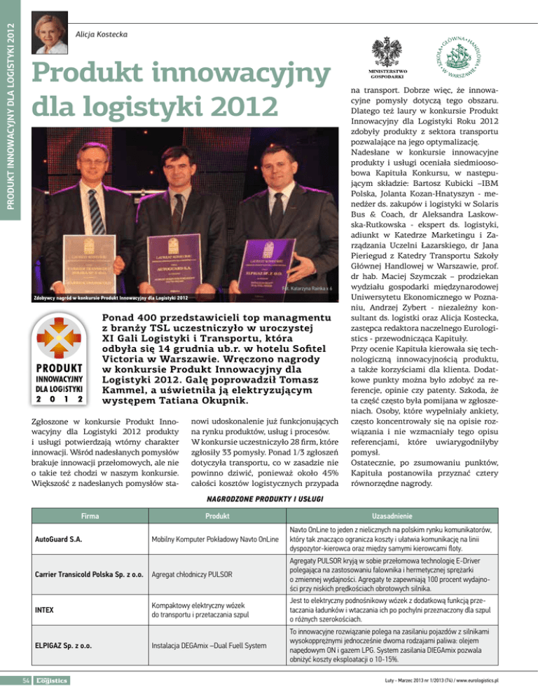 Produkt Innowacyjny dla Logistyki 2012 Alicja Kostecka Produkt innowacyjny dla logistyki 2012 Fot. Katarzyna Rainka x 6 Zdobywcy nagród w konkursie Produkt Innowacyjny dla Logistyki 2012 Ponad 400 przedstawicieli top managmentu z branży TSL uczestniczyło w uroczystej XI Gali Logistyki i Transportu, która odbyła się 14 grudnia ub.r. w hotelu Sofitel Victoria w Warszawie. Wręczono nagrody w konkursie Produkt Innowacyjny dla Logistyki 2012. Galę poprowadził Tomasz Kammel, a uświetniła ją elektryzującym występem Tatiana Okupnik. Zgłoszone w konkursie Produkt Innowacyjny dla Logistyki 2012 produkty i usługi potwierdzają wtórny charakter innowacji. Wśród nadesłanych pomysłów brakuje innowacji przełomowych, ale nie o takie też chodzi w naszym konkursie. Większość z nadesłanych pomysłów sta- nowi udoskonalenie już funkcjonujących na rynku produktów, usług i procesów. W konkursie uczestniczyło 28 firm, które zgłosiły 33 pomysły. Ponad 1/3 zgłoszeń dotyczyła transportu, co w zasadzie nie powinno dziwić, ponieważ około 45% całości kosztów logistycznych przypada na transport. Dobrze więc, że innowacyjne pomysły dotyczą tego obszaru. Dlatego też laury w konkursie Produkt Innowacyjny dla Logistyki Roku 2012 zdobyły produkty z sektora transportu pozwalające na jego optymalizację. Nadesłane w konkursie innowacyjne produkty i usługi oceniała siedmioosobowa Kapituła Konkursu, w następującym składzie: Bartosz Kubicki –IBM Polska, Jolanta Kozan-Hnatyszyn - menedżer ds. zakupów i logistyki w Solaris Bus & Coach, dr Aleksandra Laskowska-Rutkowska - ekspert ds. logistyki, adiunkt w Katedrze Marketingu i Zarządzania Uczelni Łazarskiego, dr Jana Pieriegud z Katedry Transportu Szkoły Głównej Handlowej w Warszawie, prof. dr hab. Maciej Szymczak – prodziekan wydziału gospodarki międzynarodowej Uniwersytetu Ekonomicznego w Poznaniu, Andrzej Zybert - niezależny konsultant ds. logistki oraz Alicja Kostecka, zastępca redaktora naczelnego Eurologistics - przewodnicząca Kapituły. Przy ocenie Kapituła kierowała się technologiczną innowacyjnością produktu, a także korzyściami dla klienta. Dodatkowe punkty można było zdobyć za referencje, opinie czy patenty. Szkoda, że ta część często była pomijana w zgłoszeniach. Osoby, które wypełniały ankiety, często koncentrowały się na opisie rozwiązania i nie wzmacniały tego opisu referencjami, które uwiarygodniłyby pomysł. Ostatecznie, po zsumowaniu punktów, Kapituła postanowiła przyznać cztery równorzędne nagrody. Nagrodzone produkty i usługi Firma Produkt Uzasadnienie Mobilny Komputer Pokładowy Navto OnLine Navto OnLine to jeden z nielicznych na polskim rynku komunikatorów, który tak znacząco ogranicza koszty i ułatwia komunikację na linii dyspozytor-kierowca oraz między samymi kierowcami floty. Carrier Transicold Polska Sp. z o.o. Agregat chłodniczy PULSOR Agregaty PULSOR kryją w sobie przełomowa technologię E-Driver polegająca na zastosowaniu falownika i hermetycznej sprężarki o zmiennej wydajności. Agregaty te zapewniają 100 procent wydajności przy niskich prędkościach obrotowych silnika. INTEX Kompaktowy elektryczny wózek do transportu i przetaczania szpul Jest to elektryczny podnośnikowy wózek z dodatkową funkcją przetaczania ładunków i wtaczania ich po pochylni przeznaczony dla szpul o różnych szerokościach. Instalacja DEGAmix –Dual Fuell System To innowacyjne rozwiązanie polega na zasilaniu pojazdów z silnikami wysokopprężnymi jednocześnie dwoma rodzajami paliwa: olejem napędowym ON i gazem LPG. System zasilania DIEGAmix pozwala obniżyć koszty eksploatacji o 10-15%. AutoGuard S.A. ELPIGAZ Sp. z o.o. 54 Luty - Marzec 2013 nr 1/2013 (74) / www.eurologistics.pl Produkt Innowacyjny dla Logistyki 2012 Produkty i usługi zgłoszone w konkursie Lp. Firma Produkt 1 Q4 Platforma zasobów ludzkich i mobilności w procesach obsługiwanych klienta 2 ASTOR Wonderware MES 3 AUTOGUARD P1 Mobilny Komputer Pokładowy Navto OnLine 4 AUTOGUARD P2 AutoControl Mobile 5 AUTOGUARD P3 AutoControl 2.0 6 BCS POLSKA CUBETAPE® - cyfrowe narzędzie do pomiarów wolumetrycznych 7 CARRIER TRANSICOLD POLSKA Agregat chłodniczy PULSOR 8 CASTORAMA POLSKA SAP Forecasting and Replenishment 9 CMA MONITORING Automonitoring naczep 10 EP SERWIS Pool paletowy EP Serwis 11 FINE Naczepa VARIO LINER 12 GASCAR PUSTY FOLDER 13 INTEX P1 Kompaktowy elektryczny ciągnik do transportu ładunków 14 INTEX P2 Kompaktowy elektryczny wózek do transportu i przetaczania szpul 15 NAVICA NCR-270 – Zdalny Czytnik Tacho (GSM) 16 KOMPANIA PIWOWARSKA System TRUCKER 17 POINT OF VIEV e-logistyka - drobnicowa obsługa logistyczna (przyjęcie, składowanie, kompletacja, wydanie) i dystrybucja (wysyłki za pomocą kuriera, poczty, paczkomatów) dla wielu klientów pod jednym dachem 18 POLTRAF POLTRAF ISO-THERM ACTIVE 19 PWSK Jacek Krywult Beata Krywult Program Narzędziownia 20 QUANTUM SOFTWARE moRFID WareFlow System 21 ROHLIG SUUS LOGISTICS Projekt strategiczny logistyka 2020 22 SIÓDEMKA Oferta handlowa (promocyjna) + platforma do obsługi przesyłek i klienta 7 Internet Shipping 23 SKK SYSTEM KODÓW KRESKOWYCH SKK VoiceConnector 24 STILL P1 Fleet Data Services (zestaw trzech narzędzi opartych na przeglądarce internetowej: FleetManager 4.x, STILLReport oraz STILL ProActive) 25 STILL P2 Wózek widłowy Still RX70 Hybrid 26 TOYOTA MATERIAL HANDLING POLSKA TOYOTA SpotME 27 COMPWIN Automatyczny spedytor 28 ELPIGAZ Instalacja DiegaMix - Duall Fuel System 29 FM LOGISTIC Automatyczny system awizacji 30 INTEGRO Planowanie floty sródlądowej 31 RABEN GROUP Raben e-commerce Robert Kuczyński, dyrektor Biura Handlowego, AutoGuard S.A. Cieszę się, że nasz produkt Mobilny Komputer Pokładowy Navto OnLine został uznany za innowację. Ufam, że Navto OnLine wraz z aplikacją autokontroli pozwoli usprawnić procesy zarządcze flotą i pracownikami w firmach transportowych. Maciej Kędziers