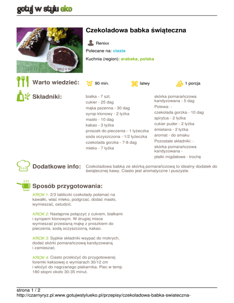 Czekoladowa babka świąteczna Renixx Polecane na: ciasta Kuchnia (region): arabska, polska Warto wiedzieć: 90 min. łatwy 1 porcja Składniki: białka - 7 szt. cukier - 25 dag mąka pszenna - 30 dag syrop klonowy - 2 łyżka masło - 10 dag kakao - 3 łyżka proszek do pieczenia - 1 łyżeczka soda oczyszczona - 1/2 łyżeczka czekolada gorzka - 7-8 dag mleko - 7 łyżka Dodatkowe info: Czekoladowa babka ze skórką pomarańczową to idealny dodatek do świątecznej kawy. Ciasto jest aromatyczne i puszyste. skórka pomarańczowa kandyzowana - 5 dag Polewa: czekolada gorzka - 10 dag spirytus - 2 łyżka cukier puder - 2 łyżka śmietana - 2 łyżka aromat - do smaku Pozostałe składniki: skórka pomarańczowa kandyzowana płatki migdałowe - trochę Sposób przygotowania: KROK 1: 2/3 tabliczki czekolady połamać na kawałki, wlać mleko, podgrzać, dodać masło, wymieszać, ostudzić. KROK 2: Następnie połączyć z cukrem, białkami i syropem klonowym. W drugiej misce wymieszać przesianą mąkę z proszkiem do pieczenia, sodą oczyszczoną, kakao. KROK 3: Sypkie składniki wsypać do mokrych, dodać skórki pomarańczową kandyzowaną i zamieszać. KROK 4: Ciasto przełożyć do przygotowanej foremki keksowej o wymiarach 30/12 cm i włożyć do nagrzanego piekarnika. Piec w temp 180 stopni około 30-35 minut. strona 1 / 2 http://czarnyryz.pl.www.gotujwstylueko.pl/przepisy/czekoladowa-babka-swiateczna- KROK 5: Polewa Czekoladę połamać, połączyć ze śmietaną, rozpuścić w kąpieli wodnej, dodać spirytus, cukier puder, aromat, dokładnie wymieszać. KROK 6: Upieczoną babkę ostudzić, oblać polewą czekoladową, ozdobić płatkami migdałowymi i skórką pomarańczową. strona 2 / 2 http://czarnyryz.pl.www.gotujwstylueko.pl/przepisy/czekoladowa-babka-swiatecznaPowered by TCPDF (www.tcpdf.org)