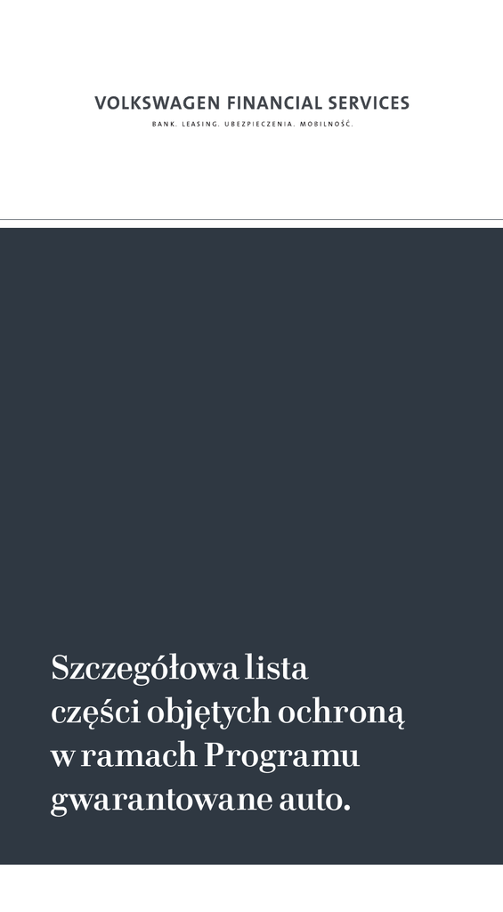 Szczegółowa lista części objętych ochroną w ramach Programu gwarantowane auto. Poniższa tabela przedstawia listę Części lub Zespołów Części objętych ochroną ubezpieczeniową w ramach Programu gwarantowane auto w przypadku wystąpienia Awarii w rozumieniu Ogólnych Warunków Ubezpieczenia Przedłużona Gwarancja na Samochody „Gwarantowane Auto” – program dla samochodów używanych: WARIANT WARIANT DIAMENTOWY PLATYNOWY Silnik Głowica cylindrów (z wykluczeniem pęknięć w wyniku przegrzania) Śruby mocujące głowicę cylindra Dźwignie zaworów z popychaczami Tłoki i pierścienie tłokowe Wał korbowy z łożyskami i tulejami Sworznie tłokowe, korbowody i panewki Zawory dolotowe i wylotowe z popychaczami Prowadnice oraz sprężyny zaworów Uszczelka podgłowicowa Koło zamachowe z kołem koronowym Kolektor dolotowy i wylotowy Pompa i chłodnica oleju Koła napędowe mechanizmu rozrządu Wałki rozrządu i rolki mechanizmu krzywkowego Łańcuch napędu rozrządu Napinacz łańcucha rozrządu Paski napędowe rozrządu (pod warunkiem potwierdzenia okresowej wymiany, zgodnie z zaleceniami producenta) Chłodnica recylkulacji spalin Pokrywa zaworów Miska olejowa Odma Nastawnik zmiennych faz rozrządu Chłodnica doładowania powietrza Napęd pompy oleju Podstawa, obudowa filta oleju Paski napędu osprzętu silnika Turbosprężarka Kompletny zespół turbosprężarki Układ wtrysku paliwa Pompa paliwa Pompa wtryskowa (diesel) Pompowtryskiwacze Wtryskiwacze Zawór rozruchowy Obudowa filtra powietrza Przewód odpowietrzania zbiornika paliwa Potencjometr przepustnicy Układ wtrysku paliwa Czujnik położenia pedału gazu Czujnik ciśnienia w kolektorze ssącym Zawór EGR (zawór recyrkulacji spalin) Zawór odcięcia paliwa Sterownik pompy wtryskowej Przepływomierz (czujnik przepływu masy powietrza) Sonda Lambda Obudowa przepustnicy Przekaźnik wtrysku paliwa Listwa wtryskowa Układ chłodzenia silnika Chłodnica oleju Silnik wentylatora chłodnicy Zawory układu ogrzewania Termostat wraz obudową Sprzęgło wiskotyczne wentylatora Pompa cieczy chłodzącej Chłodnica Intercooler/Chłodnica powietrza doładowania Nagrzewnica Zbiornik wyrównawczy płynu chłodzącego Rury i przewody Uszczelki i uszczelniacze * w Pakiecie Srebrnym z wyłączeniem tzw. pocenia się ** pod warunkiem braku zanieczyszczeń olejem WARIANT ZŁOTY WARIANT SREBRNY ● ● ● ● ● ● ● ● ● ● ● ● ● ● ● ● ● ● ● ● ● ● ● ● ● ● ● ● ● ● ● ● ● ● ● ●* ● ● ● ● ● ● ● ● ● ● ● ● ● ● ● ● ● ● ● ● ● ● ● ● ● ● ● ● ● ●** ● ● ● ● ● ● ● ● ● ● ● ● ● ● ● ● ● ● ● ● ● ● ● ● ● ● ● ● ● ● ● ● ● ● ● ● ● ● ● ● ● ● ● ● ● ● ● ● ● ● ● ● ● ● ● ● ● ● ● ● ● ● ● ● ● ● ● ● ● ● ● ● ● ● ● ● ● ● ● ● ● ● ● ● ● ● ● ● ● ● ● ● WARIANT DIAMANTOWY Skrzynie biegów Manualna Synchronizatory Wewnętrzne koła zębate Piasty Wybieraki suwakowe Wałki Tuleje Łożyska skrzyni biegów Napęd prędkościomierza Skrzynia rozdzielcza (4x4) Zespół dźwigni sterujących Zewnętrzne mechanizmy cięgnowe Automatyczna Modulator Pompa oleju Sprzęgła Zespół zaworów hydraulicznych Koła zębate/Tuleje/Wałki/Łożyska/Piasty Hamulce taśmowe Siłowniki Elektroniczny układ sterujący Tarcza sprzęgająca Chłodnica oleju Termostat układu chłodzenia skrzyni biegów Sprzęgło Tarcza sprzęgła Łożysko wyciskowe Koło zamachowe z kołem koronowym Dwumasowe koło zamachowe Tarcza dociskowa Wysprzęglik Układ przeniesienia napędu Mechanizm różnicowy Łożyska Półosie napędowe Wał napędowy Przeguby homokinetyczne Przekładnie planetarne Przeguby Cardana Osłony gumowe Łożyska podpory półosi Układ kierowniczy Kolumna kierownicza Pompa wspomagania układu kierowniczego Przekładnia kierownicza Pomocnicza przekładnia kierownicza Wałki pośrednie kolumny kierowniczej Blokada kierownicy Zbiornik płynu hydraulicznego Chłodnica Rury i przewody Układ hamulcowy Hydrauliczne rozpieracze Zaciski hamulcowe Korektor siły hamowania Pompa hamulcowa Moduł ABS Czujniki ABS Zbiornik płynu hamulcowego Dźwignia hamulca ręcznego Linki hamulca ręcznego Siłownik hamulca (Servo) Pompa próżniowa WARIANT PLATYNOWY WARIANT ZŁOTY WARIANT SREBRNY ● ● ● ● ● ● ● ● ● ● ● ● ● ● ● ● ● ● ● ● ● ● ● ● ● ● ● ● ● ● ● ● ● ● ● ● ● ● ● ● ● ● ● ● ● ● ● ● ● ● ● ● ● ● ● ● ● ● ● ● ● ● ● ● ● ● ● ● ● ● ● ● ● ● ● ● ● ● ● ● ● ● ● ● ● ● ● ● ● ● ● ● ● ● ● ● ● ● ● ● ● ● ● ● ● ● ● ● ● ● ● ● ● ● ● ● ● ● ● ● ● ● ● ● ● ● ● ● ● ● ● ● ● ● ● ● ● ● ● ● ● ● ● ● ● ● ● ● ● ● ● ● ● ● ● ● ● ● ● ● ● ● ● ● ● ● ● ● ● ● ● ● ● ● ● ● ● ● ● ● ● Zawieszenie Sprężyny śrubowe zawieszenia Łożyska kół Piasty kół Drążki skrętne Układ samopoziomujący zawieszenia Przeguby kulowe Akumulatory ciśnienia / sfery pneumatyczne Zawieszenie aktywne Kompresor zawieszenia pneumatycznego Sterownik zwieszenia pneumatycznego Resory zawieszenia Rury i przewody Mocowanie kolumny mcPhersona Wahacze oraz ich elementy Elementy metalowo gumowe zawieszenia Łączniki stabilizatora Końcówki drążków kierowniczych Wyposażenie elektryczne Alternator Rozrusznik Regulator napięcia Silnik dmuchawy nawiewu kabiny Silnik szyberdachu Przerywacz kierunkowskazów Silnik wycieraczek szyb Cewka zapłonowa Silniki elektryczne podnośników szyb Silniki elektryczne ustawienia lusterek bocznych Sterownik silnika (ECU) Zestaw wskaźników zespolonych Centralny z