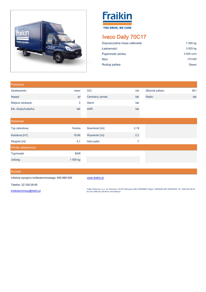 Iveco Daily 70C17 Dopuszczalna masa całkowita: 7 000 kg Ładowność: 3 025 kg Pojemność silnika: 3 000 cm3 Moc: 170 KM Rodzaj paliwa: Diesel Podwozie Zawieszenie: resor Napęd: A/C: nie Zbiornik paliwa: 90 l Centralny zamek: tak Radio: tak 3 Alarm tak tak ASR: tak tył Miejsce siedzące: Ele. Szyby/lusterka: Nadwozie Typ zabudowy: firanka Szerokość [m]: 2,18 Kubatura [m³]: 19,66 Wysokość [m]: 2,2 Długość [m]: 4,1 Ilość palet: 7 Winda załadowcza Typ/model: Udźwig: BAR 1 500 kg Kontakt Infolinia wynajmu krótkoterminowego: 800 889 000 www.fraikin.pl Telefon: 22 330 09 60 [email protected] Fraikin Polska Sp. z o.o.. Ul. Taśmowa 7; 02-677 Warszawa; KRS: 0000258807; Regon: 140540038; NIP: 5252364164; Tel: 0048 (22) 330 09 60; Fax: 0048 (22) 330 09 61; www.fraikin.pl