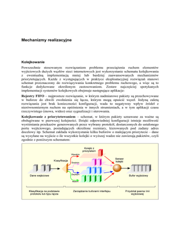 Mechanizmy realizacyjne Kolejkowanie Powszechnie stosowanym rozwiązaniem problemu przeciążenia ruchem elementów wyjściowych dużych węzłów sieci internetowych jest wykorzystanie schematu kolejkowania z ewentualną implementacją mniej lub bardziej zaawansowanych mechanizmów priorytetujących. Każde z występujących w praktyce eksploatacyjnej rozwiązań stanowi schemat przeznaczony do rozwiązywania konkretnego problemu ruchowego, a więc są to funkcje dedykowane określonym zastosowaniom. Zestaw najczęściej spotykanych implementacji systemów kolejkowych obejmuje następujące aplikacje: Rejestry FIFO – najprostsze rozwiązanie, w którym nadmiarowe pakiety są przechowywane w buforze do chwili zwolnienia się łącza, którym mogą opuścić węzeł. Jedyną zaletą rozwiązania jest brak konieczności konfiguracji, wada to negatywny wpływ źródeł z nierównomiernym ruchem na opóźnienia w innych strumieniach, a w tym aplikacji czasu rzeczywistego (mowa, wideo) oraz sygnalizacji i sterowania. Kolejkowanie z priorytetowaniem – schemat, w którym pakiety uznawane za ważne są obsługiwane w pierwszej kolejności. Dzięki odpowiedniej konfiguracji istnieje możliwość wyróżniania przekazów generowanych przez wybrany protokół, dostarczonych do ustalonego portu wejściowego, posiadających określone rozmiary, kierowanych pod zadany adres docelowy itp. Schemat zakłada wykorzystanie kilku buforów o malejącym priorytecie – dane są wysyłane na wyjście o ile wszystkie kolejki o wyższej wadze nie zawierają pakietów, czyli zgodnie z poniższym schematem: Wykorzystanie priorytetowania jest wystarczające, gdy istnieje potrzeba zapewnienia, by dane generowane przez krytyczne aplikacje były obsługiwane w pośredniczących sieciach WAN w pierwszej kolejności. Gwarantowanego pasma – schemat użyteczny w przypadkach, gdy różne aplikacje lub jednostki organizacyjne przedsiębiorstwa muszą posiadać stały dostęp do sieci z gwarancjami pewnego minimalnego pasma lub maksymalnego opóźnienia przekazu. Oznacza to, że wystąpienie natłoku nie zablokuje transferu wskazanych strumieni, a jedynie zmniejszy jego efektywność, dzięki czemu pozostanie nieco pasma dla innych nie chronionych aplikacji. Realizacja schematu w praktyce polega na przypisaniu każdej z klas ruchowych ustalonej części bufora i obsługiwaniu nich kolejno, w sposób cykliczny. Procedura odbiorcza umieszcza otrzymywane informacje w jednej z n+1 kolejek (kolejka 0 jest przeznaczona do obsługi wiadomości systemowych. Serwer obsługuje kolejki od 1 do n cyklicznie pobierając z nich za każdym razem tyle pakietów ile ustalono w fazie konfiguracji. Gwarantuje się w ten sposób, że w przypadku przeciążenia każda z aplikacji otrzyma taki udział w dostępnym paśmie jaki dla niej przewidziano. Schematy gwarantowania pasma i kolejkowania priorytetowanego funkcjonują w trybie statycznym tj. nie adaptują się do zmian sytuacji ruchowej w sieci. Kolejkowanie ważone ze sprawiedliwym przydziałem (pasma) – najbardziej zaawansowany schemat obsługowy, użyteczny zwłaszcza w przypadkach, gdy sieć musi przenosić ruch ze źródeł o znacznym zróżnicowaniu natężeń. W typowej realizacji, w pierwszej kolejności obsługiwany jest ruch związany z interakcjami multimedialnymi, zaś pozostałe pasmo jest dzielone sprawiedliwie pomiędzy pozostałe aplikacje. W efekcie preferowane są sesje bezpośredniej komunikacji użytkowników, zaś wymiana danych komputerowych jako mniej krytyczna czasowo jest realizowana w dalszej kolejności. Opisany mechanizm działania, oznaczany w literaturze jako WFQ (Weighted Fair Queuing), ilustruje poniższy schemat: Wysoka efektywność schematu przejawia się zwłaszcza w zdolności do zagospodarowania całości dysponowanego pasma na potrzeby ruchu o niższych priorytetach, o ile stojące wyżej w hierarchii kolejki są puste. Równie istotną zaletę algorytmu stanowi jego zdolność do minimalizowania zmienności opóźnienia w pętli (round-trip delay). Efekt ten jest szczególnie wyraźnie obserwowalny w systemach realizujących obsługę licznych sesji konwersacyjnych o dużym zapotrzebowaniu na pasmo, gdzie szybkość transmisji oraz interwały pomiędzy otrzymywaniem kolejnych pakietów stają się lepiej przewidywalne. W szczególności WFQ znacznie poprawia wydajność typowych algorytmów sterowania łączem logicznym (Logical Link Control – LLC) klasycznych protokołów pakietowych, zaś w systemach internetowych usprawnia funkcjonowanie mechanizmów przeciwdziałania przeciążeniom i tzw. wolnego startu (slow-start) wbudowanych w protokół TCP. Typowa realizacja sterowania WFQ jest w stanie rozpoznawać także priorytet pakietów IP dzięki analizie ich właściwego pola nagłówkowego, które może przenosić wartości z zakresu 0 – 7. Algorytm przydziela przy tym proporcjonalnie więcej pasma transmisjom oznaczanym wyższymi priorytetami, co sprawia, że są one obsługiwane szybciej niż inne, nawet w przypadku wystąpienia natłoku. Efekt ten osiąga się przypisując każdemu z przekazów odpowiedniej wagi (tym niższej im szybciej musi być obsługiwany), gdzie wskaźnik z nagłówka pakietu IP służy jako obiektywna miara znaczenia danego procesu. I tak np. pakiety oznaczone priorytetem 7 otrzymują niższą wagę niż opatrzone wartością 3 i w rezultacie uzyskują pierwszeństwo w module nadawczym. Jeśli w systemie funkcjonuje protokół RSVP to jego mechanizmy są w stanie wykorzystywać funkcje WFQ w celu przydzielania przestrzeni buforów, ustalania kolejności wysyłki pakietów oraz gwarantowania pasma dla wyróżnionych przekazów. Natomiast w sieciach FR, gdzie natłok jest sygnalizowany flagami FECN (Forward Explicit Congestion Notification) i BECN (Backward Explicit Congestion Notification) proces przyznawania wag przez algorytm WFQ uwzględnia ich wartości, dzięki czemu częstotliwość występowania przeciąże
