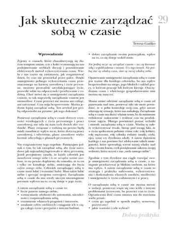 Jak skutecznie zarządzać 29 sobą w czasie Teresa Gańko Wprowadzenie Żyjemy w czasach, które charakteryzują się dużym tempem zmian, a te z kolei wymuszają na nas podejmowanie szybkich decyzji i poszukiwanie efektywnych metod wykorzystywania czasu. Wielu z nas często się zastanawia, jak zorganizować dzień, by czas nie przeciekał przez palce. Dzięki umiejętności pełnego wykorzystania czasu przeznaczonego na karierę zawodową i życie prywatne, możemy prowadzić satysfakcjonujące życie, pozwolić sobie na odpoczynek i przebywanie z rodziną. Choć mówi się o umiejętności zarządzania czasem, to tak naprawdę zarządzanie czasem jest niemożliwe. Czasu przecież nie można ani cofnąć, ani zatrzymać. Czas mija bezpowrotnie. Można jedynie lepiej zarządzać sobą. Ten artykuł jest próbą odpowiedzi na pytanie: jak tego dokonać? Ponieważ zarządzanie sobą w czasie dotyczy czynności wynikających z życia prywatnego i pracy zawodowej, nie uda się nam tych dwóch sfer rozdzielić. Plany związane z rodziną na pewno będą miały zasadniczy wpływ na te, które dotyczą pracy zawodowej, i odwrotnie, plany zawodowe wielokrotnie zdecydują o planach prywatnych. Nie rozgraniczymy tego zupełnie. Pamiętajmy jednak o tym, by tak zarządzać sobą, aby życie zawodowe jak najrzadziej ingerowało w sferę prywatną. Jeżeli przyjmiemy zasadę, że każdy człowiek jest menedżerem samego siebie i to on zarządza swoimi zasobami, to na pewno dojdziemy do wniosku, że to on i tylko on kształtuje siebie, zmierzając do bycia szefem samego siebie. Człowiek zarządzający sobą w czasie musi lubić i rozumieć ludzi. Musi także lubić siebie i sprzyjać swojemu rozwojowi. Zarządzanie sobą w czasie da mu wtedy niczym niezastąpione poczucie wpływu na to, co się dzieje w jego życiu. A zatem zarządzanie sobą w czasie to: • bycie panem samego siebie, • wzmacnianie zdolności do autonomii, niezależności i rozporządzania sobą, • rozumienie własnych pragnień i interesów, • ustalanie celów osobistych i osiąganie ich w ciągu całego życia i przyjaźni z innymi ludźmi, • dobre zarządzanie swoim potencjałem, wpływ na to, co się dzieje wokół mnie. Nie próbuj uczyć się zarządzać czasem – ucz się kierować sobą i współdziałania z innymi. Ucz tego innych. Nie próbuj stać się władcą czasu, stań się raczej władcą siebie. Opanowanie umiejętności zarządzania sobą w czasie jest ważne dla każdego człowieka, bo ma wpływ bezpośrednio na niego, jego bliskich i zakład pracy, w którym pracuje lub którym kieruje. Oszczędzania czasu i właściwego gospodarowania nim można się nauczyć. Musisz umieć odróżnić zarządzanie sobą w czasie od panowania nad nim, ponieważ nikt nie może powiedzieć, że w pełni kontroluje swój czas, gdyż zawsze zdarzają się sytuacje, które nas zaskakują. Zarządzanie sobą w czasie ma służyć właśnie temu, by do minimum redukować zaskoczenie i zyskiwać czas na produktywne zajęcia. Dlatego powinieneś poznać techniki i metody zarządzania sobą w czasie. Wiedzę tę należy wykorzystywać trwale, biorąc pod uwagę fakt, że w życiu społecznym pełnimy różne role: rolę kobiety, rolę mężczyzny, rolę członka rodziny (matki, córki, ojca, syna) czy dyrektora szkoły. A zatem dążeniem każdego z nas powinno być zdobywanie takich umiejętności, które spowodują wzrost naszej władzy nad sobą i swoim losem, czyli powiększanie zakresu swojej wolności, która uczyni z nas „szefa samego siebie”. Zgodnie z tym dyrektor ma ciągle rozwijać swoje umiejętności zarządzania sobą w czasie, a następnie przekazywać je bliskim osobom, na które ma wpływ. A zatem zarządzanie sobą w czasie to strategia i praktyka nabywania, wykorzystywania i doskonalenia własnych zasobów, możliwości i umiejętności w życiu codziennym i w pracy. O zarządzaniu sobą w czasie nie można mówić w izolacji, ponieważ wiąże się ono ściśle z innymi problemami życiowymi, bo przecież czas to życie. Ograniczona ilość czasu zmusza nas do stawiania wielu pytań: • czym go zapełnić w sposób mądry, sensowny, pożyteczny? • jakie wartości i cele wybrać? Dobra praktyka 30 Dobra praktyka Brak czasu na realizację założeń doprowadza do stresu, a to może być źródłem konfliktów wewnętrznych i problemów uczuciowych. Czy bardziej być czy bardziej mieć? Jest to sztuka wyborów, których już nie powtórzymy, bowiem decyzje w czasie są nieodwracalne. Zarządzanie czasem jest konsekwentnym i zorientowanym na cel stosowaniem w praktyce zasad i technik pracy w taki sposób, że kierowanie samym sobą i swoim otoczeniem odbywa się bez zbędnego trudu, a czas jest wykorzystywany sensownie i optymalnie. Czas jest nieodnawialny. Kiedy skończy się dzień, nie da się go odzyskać. Można jedynie mieć nadzieję, że następny będzie lepiej wykorzystany. Mówi się, że „czas to pieniądz”, ale o ile właściwe używanie czasu może w efekcie dać pieniądze, o tyle żadne pieniądze nie przywrócą zmarnowanego czasu. Kiedy mówisz: „brakuje mi czasu”, wiedz, że to nie z czasem jest coś nie tak, lecz z Tobą, jeśli nie osiągasz zamierzonych rezultatów. 1. Najczęstsze błędy w zarządzaniu sobą Sposób zarządzania sobą w czasie jest różny. Hindusi – przez cały dzień siedzą na łonie przyrody. Zażywają czasu, „żyją w wiecznym teraz”. Afrykanie mówią: po co się martwić na zapas, skoro i tak nie wiemy, co będzie jutro. Chińczycy – mają starą receptę na zagospodarowanie czasu: sen – 7 godzin, praca – 8 godzin, nicnierobienie – 9 godzin (czas przeznaczony na przyjemności). Poniżej przedstawiam błędy, które najczęściej są popełniane zarówno w życiu osobistym, jak i w pracy zawodowej, dotyczące zarządzania czasem. • obawa przed brakiem umiejętności poradzenia sobie z rozwiązaniem problemu, • obawa przed brakiem 