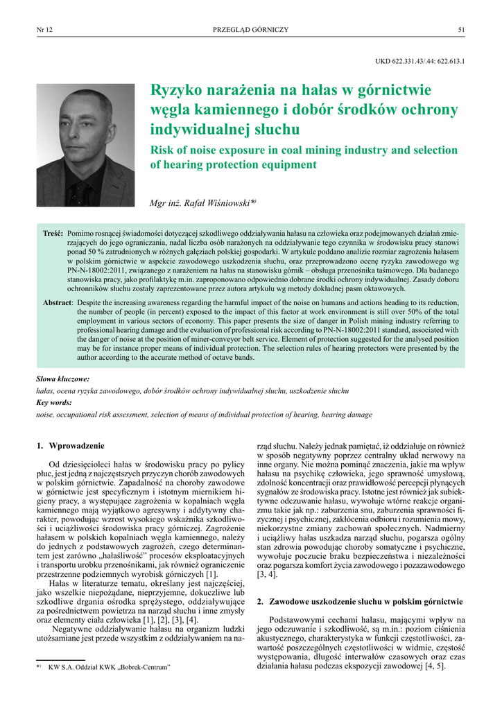 Nr 12 PRZEGLĄD GÓRNICZY 51 UKD 622.331.43/.44: 622.613.1 Ryzyko narażenia na hałas w górnictwie węgla kamiennego i dobór środków ochrony indywidualnej słuchu Risk of noise exposure in coal mining industry and selection of hearing protection equipment Mgr inż. Rafał Wiśniowski*) Treść: Pomimo rosnącej świadomości dotyczącej szkodliwego oddziaływania hałasu na człowieka oraz podejmowanych działań zmierzających do jego ograniczania, nadal liczba osób narażonych na oddziaływanie tego czynnika w środowisku pracy stanowi ponad 50 % zatrudnionych w różnych gałęziach polskiej gospodarki. W artykule poddano analizie rozmiar zagrożenia hałasem w polskim górnictwie w aspekcie zawodowego uszkodzenia słuchu, oraz przeprowadzono ocenę ryzyka zawodowego wg PN-N-18002:2011, związanego z narażeniem na hałas na stanowisku górnik – obsługa przenośnika taśmowego. Dla badanego stanowiska pracy, jako profilaktykę m.in. zaproponowano odpowiednio dobrane środki ochrony indywidualnej. Zasady doboru ochronników słuchu zostały zaprezentowane przez autora artykułu wg metody dokładnej pasm oktawowych. Abstract: Despite the increasing awareness regarding the harmful impact of the noise on humans and actions heading to its reduction, the number of people (in percent) exposed to the impact of this factor at work environment is still over 50% of the total employment in various sectors of economy. This paper presents the size of danger in Polish mining industry referring to professional hearing damage and the evaluation of professional risk according to PN-N-18002:2011 standard, associated with the danger of noise at the position of miner-conveyor belt service. Element of protection suggested for the analysed position may be for instance proper means of individual protection. The selection rules of hearing protectors were presented by the author according to the accurate method of octave bands. Słowa kluczowe: hałas, ocena ryzyka zawodowego, dobór środków ochrony indywidualnej słuchu, uszkodzenie słuchu Key words: noise, occupational risk assessment, selection of means of individual protection of hearing, hearing damage 1. Wprowadzenie Od dziesięcioleci hałas w środowisku pracy po pylicy płuc, jest jedną z najczęstszych przyczyn chorób zawodowych w polskim górnictwie. Zapadalność na choroby zawodowe w górnictwie jest specyficznym i istotnym miernikiem higieny pracy, a występujące zagrożenia w kopalniach węgla kamiennego mają wyjątkowo agresywny i addytywny charakter, powodując wzrost wysokiego wskaźnika szkodliwości i uciążliwości środowiska pracy górniczej. Zagrożenie hałasem w polskich kopalniach węgla kamiennego, należy do jednych z podstawowych zagrożeń, czego determinantem jest zarówno „hałaśliwość” procesów eksploatacyjnych i transportu urobku przenośnikami, jak również ograniczenie przestrzenne podziemnych wyrobisk górniczych [1]. Hałas w literaturze tematu, określany jest najczęściej, jako wszelkie niepożądane, nieprzyjemne, dokuczliwe lub szkodliwe drgania ośrodka sprężystego, oddziaływujące za pośrednictwem powietrza na narząd słuchu i inne zmysły oraz elementy ciała człowieka [1], [2], [3], [4]. Negatywne oddziaływanie hałasu na organizm ludzki utożsamiane jest przede wszystkim z oddziaływaniem na na*) KW S.A. Oddział KWK „Bobrek-Centrum” rząd słuchu. Należy jednak pamiętać, iż oddziałuje on również w sposób negatywny poprzez centralny układ nerwowy na inne organy. Nie można pominąć znaczenia, jakie ma wpływ hałasu na psychikę człowieka, jego sprawność umysłową, zdolność koncentracji oraz prawidłowość percepcji płynących sygnałów ze środowiska pracy. Istotne jest również jak subiektywne odczuwanie hałasu, wywołuje wtórne reakcje organizmu takie jak np.: zaburzenia snu, zaburzenia sprawności fizycznej i psychicznej, zakłócenia odbioru i rozumienia mowy, niekorzystne zmiany zachowań społecznych. Nadmierny i uciążliwy hałas uszkadza narząd słuchu, pogarsza ogólny stan zdrowia powodując choroby somatyczne i psychiczne, wywołuje poczucie braku bezpieczeństwa i niezależności oraz pogarsza komfort życia zawodowego i pozazawodowego [3, 4]. 2. Zawodowe uszkodzenie słuchu w polskim górnictwie Podstawowymi cechami hałasu, mającymi wpływ na jego odczuwanie i szkodliwość, są m.in.: poziom ciśnienia akustycznego, charakterystyka w funkcji częstotliwości, zawartość poszczególnych częstotliwości w widmie, częstość występowania, długość interwałów czasowych oraz czas działania hałasu podczas ekspozycji zawodowej [4, 5]. 52 PRZEGLĄD GÓRNICZY Rozpatrując szkodliwy wpływ hałasu na człowieka, doświadczalnie wykazano, że zaburzenia funkcji fizjologicznych organizmu mogą występować po przekroczeniu poziomu ciśnienia akustycznego równego 75 dB. Silne bodźce akustyczne o poziomach ciśnienia akustycznego powyżej 110-120 dB mogą wpływać na funkcje narządów zmysłów powodując zaburzenia wzroku, równowagi i dotyku. Słabsze bodźce akustyczne o poziomach 55÷75 dB, mogą powodować rozproszenie uwagi, utrudniać pracę i zmniejszać jej wydajność. Hałas o poziomie dźwięku A zawarty w przedziale 90 – 130 dB może być przyczyną zaburzenia układu krążenia, układu pokarmowego jak również uszkadza narząd słuchu. Powyżej 130 dB wywołuje drgania niektórych organów wewnętrznych człowieka, powodując ich choroby czy uszkodzenia, powoduje trwałe uszkodzenie narządu słuchu, jak również może być przyczyną zaburzeń równowagi, mdłości, czy być przyczynkiem do chorób psychicznych [3, 4]. Dominującym skutkiem wieloletniego i systematycznego narażenia na hałas są zmiany patologiczne i fizjologiczne narządu słuchu, powodujące jego nieodwracalne uszkodzenie. Zgodnie z art. 2351 Ustawy Kodeks pracy z dnia 26 czerwca 1974 r. za chorobę zawodową uważa się chorobę wymienioną w wy