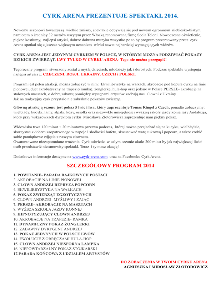 CYRK ARENA PREZENTUJE SPEKTAKL 2014. Nowemu sezonowi towarzyszą wielkie zmiany, spektakle odbywają się pod nowym ogromnym niebiesko-białym namiotem o średnicy 32 metrów uszytym przez Włoską renomowaną firmę Scola Teloni. Nowoczesne oświetlenie, piękne kostiumy, najlepsi artyści, dobrze dobrana muzyka wszystko po to by program prezentowany przez cyrk Arena spotkał się z jeszcze większym uznaniem wśród nawet najbardziej wymagających widzów. CYRK ARENA JEST JEDYNYM CYRKIEM W POLSCE, W KTÓRYM MOŻNA PODZIWIAĆ POKAZY DZIKICH ZWIERZĄT. LWY TYLKO W CYRKU ARENA- Tego nie można przegapić! Tegoroczny program stworzony został z myślą dzieciach, młodzieży jak i dorosłych. Podczas spektaklu występują najlepsi artyści z: CZECZENI, ROSJI, UKRAINY, CZECH i POLSKI. Program jest pełen atrakcji, można zobaczyć w nim: Ekwilibrystykę na wałkach, akrobacje pod kopułą cyrku na linie pionowej, duet akrobatyczny na trapezie(ramka), żonglerkę, hula-hop oraz jedyne w Polsce PERSZE- akrobacje na stalowych masztach, o dobrą zabawę pomiędzy występami artystów zadbają nasi Clowni z Ukrainy. Jak na tradycyjny cyrk przystało nie zabraknie pokazów zwierząt. Główną atrakcją sezonu jest pokaz 5 lwic i lwa, który zaprezentuje Tomas Ringel z Czech, ponadto zobaczymy: wielbłądy, kucyki, lamy, alpaki, kozy, osiołki oraz niezwykłe umiejętności wyższej szkoły jazdy konia rasy Andaluzja, który przy wskazówkach dyrektora cyrku Mirosława Złotorowicza zaprezentuje nam piękny pokaz. Widowisko trwa 120 minut + 20 minutowa przerwa podczas, której można przejechać się na kucyku, wielbłądzie, skorzystać z dobrze zaopatrzonego w napoje i słodkości bufetu, skosztować watę cukrową i popcorn, a także zrobić sobie pamiątkowe zdjęcie z naszym clownem. Gwarantowane niezapomniane wrażenia. Cyrk odwiedzi w całym sezonie około 200 miast by jak największej ilości osób przedstawić niesamowity spektakl. Teraz i ty masz okazję! Dodatkowe informacje dostępne na www.cyrk-arena.com oraz na Facebooku Cyrk Arena. SZCZEGÓŁOWY PROGRAM 2014 1. POWITANIE- PARADA BAJKOWYCH POSTACI 2. AKROBACJE NA LINIE PIONOWEJ 3. CLOWN ANDRZEJ REPRYZA POPCORN 4. EKWILIBRYSTYKA NA WAŁKACH 5. POKAZ ZWIERZĄT EGZOTYCZNYCH 6. CLOWN ANDRZEJ- MYŚLIWY I ZAJĄC 7. PERSZE- AKROBACJE NA MASZTACH 8. WYŻSZA SZKOŁA JAZDY KONNEJ 9. HIPNOTYZUJĄCY CLOWN ANDRZEJ 10. AKROBACJE NA TRAPEZIE- RAMKA 11. DYNAMICZNY POKAZ ŻONGLERKI 12. ZABAWNY DYRYGENT ANDRZEJ 13. POKAZ JEDYNYCH W POLSCE LWÓW 14. EWOLUCJE Z OBRĘCZAMI HULA-HOP 15. CLOWN ANDRZEJ NIESFORNA LAMPKA 16. NIEPOWTARZALNY POKAZ STÓJKARSKI 17.PARADA KOŃCOWA Z UDZIAŁEM ARTYSTÓW DO ZOBACZENIA W TWOIM CYRKU ARENA AGNIESZKA I MIROSŁAW ZŁOTOROWICZ