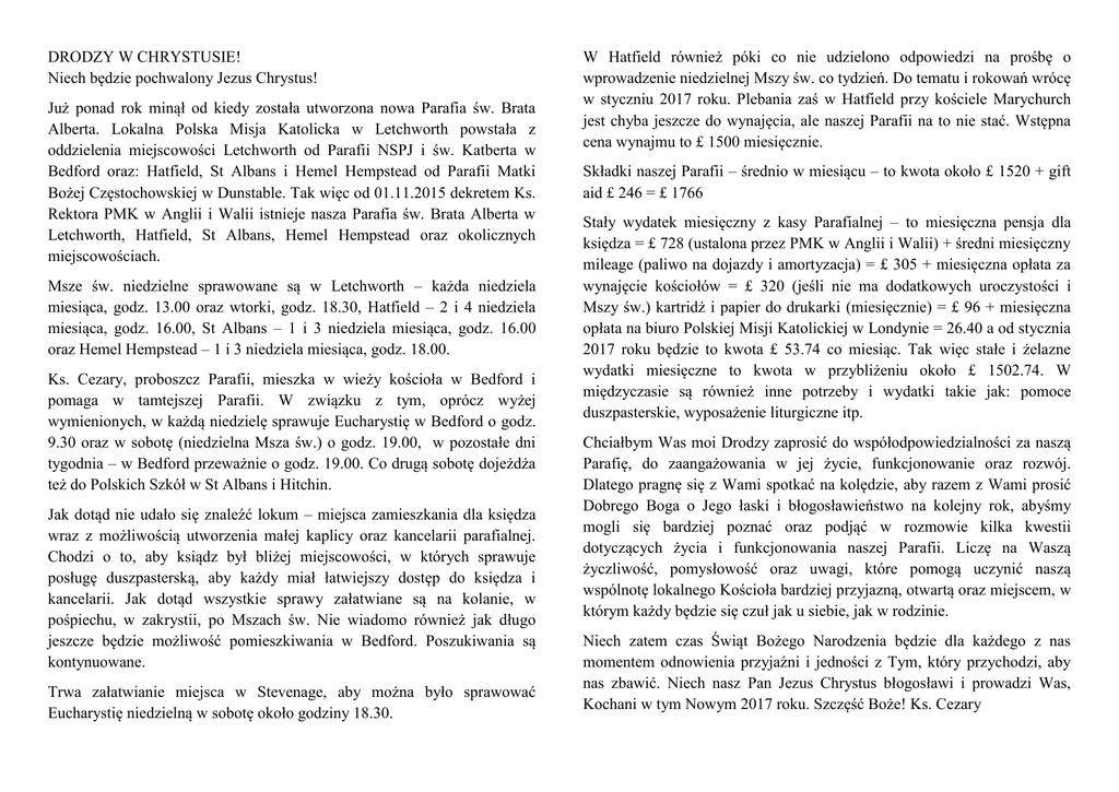 DRODZY W CHRYSTUSIE! Niech będzie pochwalony Jezus Chrystus! Już ponad rok minął od kiedy została utworzona nowa Parafia św. Brata Alberta. Lokalna Polska Misja Katolicka w Letchworth powstała z oddzielenia miejscowości Letchworth od Parafii NSPJ i św. Katberta w Bedford oraz: Hatfield, St Albans i Hemel Hempstead od Parafii Matki Bożej Częstochowskiej w Dunstable. Tak więc od 01.11.2015 dekretem Ks. Rektora PMK w Anglii i Walii istnieje nasza Parafia św. Brata Alberta w Letchworth, Hatfield, St Albans, Hemel Hempstead oraz okolicznych miejscowościach. Msze św. niedzielne sprawowane są w Letchworth – każda niedziela miesiąca, godz. 13.00 oraz wtorki, godz. 18.30, Hatfield – 2 i 4 niedziela miesiąca, godz. 16.00, St Albans – 1 i 3 niedziela miesiąca, godz. 16.00 oraz Hemel Hempstead – 1 i 3 niedziela miesiąca, godz. 18.00. Ks. Cezary, proboszcz Parafii, mieszka w wieży kościoła w Bedford i pomaga w tamtejszej Parafii. W związku z tym, oprócz wyżej wymienionych, w każdą niedzielę sprawuje Eucharystię w Bedford o godz. 9.30 oraz w sobotę (niedzielna Msza św.) o godz. 19.00, w pozostałe dni tygodnia – w Bedford przeważnie o godz. 19.00. Co drugą sobotę dojeżdża też do Polskich Szkół w St Albans i Hitchin. Jak dotąd nie udało się znaleźć lokum – miejsca zamieszkania dla księdza wraz z możliwością utworzenia małej kaplicy oraz kancelarii parafialnej. Chodzi o to, aby ksiądz był bliżej miejscowości, w których sprawuje posługę duszpasterską, aby każdy miał łatwiejszy dostęp do księdza i kancelarii. Jak dotąd wszystkie sprawy załatwiane są na kolanie, w pośpiechu, w zakrystii, po Mszach św. Nie wiadomo również jak długo jeszcze będzie możliwość pomieszkiwania w Bedford. Poszukiwania są kontynuowane. Trwa załatwianie miejsca w Stevenage, aby można było sprawować Eucharystię niedzielną w sobotę około godziny 18.30. W Hatfield również póki co nie udzielono odpowiedzi na prośbę o wprowadzenie niedzielnej Mszy św. co tydzień. Do tematu i rokowań wrócę w styczniu 2017 roku. Plebania zaś w Hatfield przy kościele Marychurch jest chyba jeszcze do wynajęcia, ale naszej Parafii na to nie stać. Wstępna cena wynajmu to £ 1500 miesięcznie. Składki naszej Parafii – średnio w miesiącu – to kwota około £ 1520 + gift aid £ 246 = £ 1766 Stały wydatek miesięczny z kasy Parafialnej – to miesięczna pensja dla księdza = £ 728 (ustalona przez PMK w Anglii i Walii) + średni miesięczny mileage (paliwo na dojazdy i amortyzacja) = £ 305 + miesięczna opłata za wynajęcie kościołów = £ 320 (jeśli nie ma dodatkowych uroczystości i Mszy św.) kartridż i papier do drukarki (miesięcznie) = £ 96 + miesięczna opłata na biuro Polskiej Misji Katolickiej w Londynie = 26.40 a od stycznia 2017 roku będzie to kwota £ 53.74 co miesiąc. Tak więc stałe i żelazne wydatki miesięczne to kwota w przybliżeniu około £ 1502.74. W międzyczasie są również inne potrzeby i wydatki takie jak: pomoce duszpasterskie, wyposażenie liturgiczne itp. Chciałbym Was moi Drodzy zaprosić do współodpowiedzialności za naszą Parafię, do zaangażowania w jej życie, funkcjonowanie oraz rozwój. Dlatego pragnę się z Wami spotkać na kolędzie, aby razem z Wami prosić Dobrego Boga o Jego łaski i błogosławieństwo na kolejny rok, abyśmy mogli się bardziej poznać oraz podjąć w rozmowie kilka kwestii dotyczących życia i funkcjonowania naszej Parafii. Liczę na Waszą życzliwość, pomysłowość oraz uwagi, które pomogą uczynić naszą wspólnotę lokalnego Kościoła bardziej przyjazną, otwartą oraz miejscem, w którym każdy będzie się czuł jak u siebie, jak w rodzinie. Niech zatem czas Świąt Bożego Narodzenia będzie dla każdego z nas momentem odnowienia przyjaźni i jedności z Tym, który przychodzi, aby nas zbawić. Niech nasz Pan Jezus Chrystus błogosławi i prowadzi Was, Kochani w tym Nowym 2017 roku. Szczęść Boże! Ks. Cezary