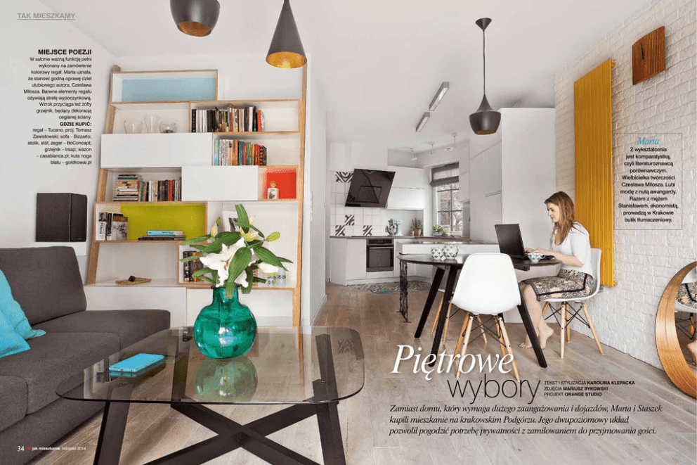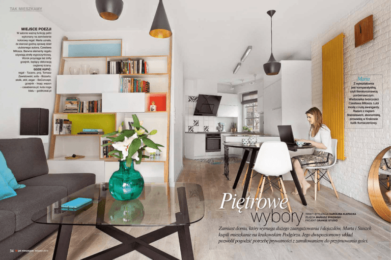 TAK MIESZKAMY miejsce poezji W salonie ważną funkcję pełni wykonany na zamówienie kolorowy regał. Marta uznała, że stanowi godną oprawę dzieł ulubionego autora, Czesława Miłosza. Barwne elementy regału ożywiają strefę wypoczynkową. Wzrok przyciąga też żółty grzejnik, będący dekoracją ceglanej ściany. gdzie kupić: regał – Tucano, proj. Tomasz Zawistowski; sofa – Bizzarto; stolik, stół, zegar – BoConcept; grzejnik – Irsap; wazon – casabianca.pl; kuta noga blatu – goldkowal.pl Marta Z wykształcenia jest komparatystką, czyli literaturoznawcą porównawczym. Wielbicielka twórczości Czesława Miłosza. Lubi modę z nutą awangardy. Razem z mężem Stanisławem, ekonomistą, prowadzą w Krakowie butik tłumaczeniowy. Piętrowe wybory tekst i stylizacja karolina klepacka zdjęcia mariusz bykowski projekt orange studio Zamiast domu, który wymaga dużego zaangażowania i dojazdów, Marta i Staszek kupili mieszkanie na krakowskim Podgórzu. Jego dwupoziomowy układ pozwolił pogodzić potrzebę prywatności z zamiłowaniem do przyjmowania gości. 34 M jak mieszkanie listopad 2014 TAK MIESZKAMY Zdjęcia: serwisy prasowe ImBRYKI Love Birds marki Pip Studio, decodorebasic.pl 99 zł 225 Olivia marki Bloomingville, scandiconcept.pl Tao marki Kahla, namoimstole.pl 36 M jak mieszkanie listopad 2014 zł 119 zł Plan mieszkania łazienka 82 m² pokój salon wąskie wejście kuchnia sypialnia łazienka 3 J ak przystało na perfekcjonistów, Marta i Staszek długo wybierali odpowiednie miejsce do zamieszkania. Przy urządzaniu konsultowali się ze specjalistami i przyjaciółmi, poszukując najlepszych rozwiązań i materiałów. Na co dzień małżonkowie realizują pasję będącą też sposobem na życie: z zaangażowaniem prowadzą wielojęzykowy butik tłumaczeniowy. Niedostatek wolnego czasu sprawił, że przestali rozważać kupno domu – wybrali dwupoziomowe mieszkanie w klimatycznej kamienicy, które oprócz wspaniałej lokalizacji i dużych okien z malowniczym widokiem miało też... nieregularny układ przestrzenny. Nie bez trudu projektanci z Orange Studio rozmieszczali w nim kolejne strefy, oszczędzając miejsce wszędzie, gdzie to było możliwe. Do mieszkania wchodzi się przez długi korytarz, z którego prowadzą schody do części prywatnej – są tam sypialnia, mała łazienka, garderoby i pralnia. Dolna kondygnacja o powierzchni 60 m² to przestrzeń dzienna, która miała uwzględnić organizowanie przyjęć i spotkań z przyjaciółmi. Oprócz rozłożystej sofy z pokaźnym stolikiem i rozkładanym stołem potrzebna była też odpowiednio duża kuchnia. By to osiągnąć, należało zmienić układ ścian. Prostym, białym meblom towarzyszą oryginalne płytki polskiej firmy Purpura. Kolorystyka kafli stała się punktem wyjścia do wyboru dodatków. Żółcie i błękity na tle bieli uzupełnione są czernią, bielonym drewnem i szarościami, wskazując na skandynawskie inspiracje domowników. Starannie dobierane detale korespondują ze sobą nie tylko kolorami, ale też formami, by stworzyć spójny, przemyślany efekt. korytarz zapraszamy Stół jadalniany spełnił nasze marzenia o przyjmowaniu gości w komfortowych warunkach – mówi Marta. Na co dzień czteroosobowy, może potroić swoją wielkość. Obok wygodnej kanapy stanął duży stolik kawowy, obowiązkowo z wielkim wazonem pełnym lilii. Długi korytarz jest dobrze doświetlony przez duże okno, ale dla poprawy jego proporcji trzeba było zwężyć schody. – Liczył się każdy centymetr, bo zależało nam, by korytarz był bramą zapraszającą do mieszkania – mówią projektanci. Zbudowana pod schodami szafa pozwala przechować wierzchnie ubrania, a „wydrążona” w niej szafka RTV zaoszczędziła przestrzeń w części dziennej – półki umieszczono we wnęce w ścianie.. TAK MIESZKAMY zadbane kafelki Ręcznie wykonane kafle nie są tak odporne na zabrudzenia jak płytki. Po montażu należy je zaimpregnować odpowiednim preparatem, by cement nie wchłaniał zabrudzeń, a potem regularnie konserwować. Orange studio Marlena Koczaj-Siwek, Michał Siwek www.orangestudio.info.pl e-mail: [email protected] tel.: 724 170 369, 609 373 919 Jak łączyć cementowe płytki z podłogą Patchworkowa kompozycja wzorzystych kafli nie pochodzi wbrew pozorom z Hiszpanii, ale z Polski. Cementowe płytki, wykonane ręcznie przez pracownię Purpura, podkreślają klimat kamienicy i stały się najbardziej dekoracyjnym akcentem w minimalistycznej kuchni. Żeliwna noga zaznacza granicę strefy kulinarnej. Pomysł na ozdobną podporę blatu wyszedł od projektantów, ale właściciele nadali mu osobisty charakter, zamawiając nogę w rodzinnych stronach na północy Polski, u kowala z Rychlik. REKLAMA hiszpaŃskie inspiracje Wywodzące się z Hiszpanii cementowe płytki przeżywają ostatnio renesans. Ze względu na wysoki koszt i bogactwo wzorów najczęściej wykłada się nimi tylko fragment posadzki, łącząc je z innym rodzajem podłogi. Łączenie nie powinno psuć wrażenia, jakie chcemy osiągnąć, stosując dekoracyjne płytki. Dlatego zwróćmy szczególną uwagę na ten detal. Na styku materiałów można zastosować metalowe profile ozdobne w kształcie litery L (kątowniki) lub T (teowniki), które montuje się podczas kładzenia płytek. Bardziej eleganckim i dyskretnym rozwiązaniem jest wypełnienie łączeń korkowym paskiem. Elastyczność korka dodatkowo chroni płytki przed działaniem naprężeń. Do wykonania takiego połączenia potrzebne jest zachowanie szczeliny dylatacyjnej, którą wypełnia się klejem, a następnie pasem korka. Korek wbijamy gumowym młotkiem, po czym docinamy. miętowa kąpiel Marta marzyła o tym, by oprócz prysznica, zmieściła się tu wolno stojąca wanna, ale powierzchnia łazienki była zbyt mała. Wolno stojącą zastąpiła więc wanna owalna, obłożona mozaiką. Towarzyszą jej miętowe, fazowane płytki. gdzie kupić: pły