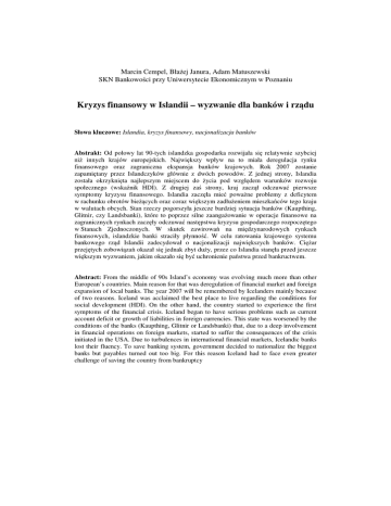 Marcin Cempel, Błażej Janura, Adam Matuszewski SKN Bankowości przy Uniwersytecie Ekonomicznym w Poznaniu Kryzys finansowy w Islandii – wyzwanie dla banków i rządu Słowa kluczowe: Islandia, kryzys finansowy, nacjonalizacja banków Abstrakt: Od połowy lat 90-tych islandzka gospodarka rozwijała się relatywnie szybciej niż innych krajów europejskich. Największy wpływ na to miała deregulacja rynku finansowego oraz zagraniczna ekspansja banków krajowych. Rok 2007 zostanie zapamiętany przez Islandczyków głównie z dwóch powodów. Z jednej strony, Islandia została okrzyknięta najlepszym miejscem do życia pod względem warunków rozwoju społecznego (wskaźnik HDI). Z drugiej zaś strony, kraj zaczął odczuwać pierwsze symptomy kryzysu finansowego. Islandia zaczęła mieć poważne problemy z deficytem w rachunku obrotów bieżących oraz coraz większym zadłużeniem mieszkańców tego kraju w walutach obcych. Stan rzeczy pogorszyła jeszcze bardziej sytuacja banków (Kaupthing, Glitnir, czy Landsbanki), które to poprzez silne zaangażowanie w operacje finansowe na zagranicznych rynkach zaczęły odczuwać następstwa kryzysu gospodarczego rozpoczętego w Stanach Zjednoczonych. W skutek zawirowań na międzynarodowych rynkach finansowych, islandzkie banki straciły płynność. W celu ratowania krajowego systemu bankowego rząd Islandii zadecydował o nacjonalizacji największych banków. Ciężar przejętych zobowiązań okazał się jednak zbyt duży, przez co Islandia stanęła przed jeszcze większym wyzwaniem, jakim okazało się być uchronienie państwa przed bankructwem. Abstract: From the middle of 90s Island’s economy was evolving much more than other European’s countries. Main reason for that was deregulation of financial market and foreign expansion of local banks. The year 2007 will be remembered by Icelanders mainly because of two reasons. Iceland was acclaimed the best place to live regarding the conditions for social development (HDI). On the other hand, the country started to experience the first symptoms of the financial crisis. Iceland began to have serious problems such as current account deficit or growth of liabilities in foreign currencies. This state was worsened by the conditions of the banks (Kaupthing, Glitnir or Landsbanki) that, due to a deep involvement in financial operations on foreign markets, started to suffer the consequences of the crisis initiated in the USA. Due to turbulences in international financial markets, Icelandic banks lost their fluency. To save banking system, government decided to nationalize the biggest banks but payables turned out too big. For this reason Iceland had to face even greater challenge of saving the country from bankruptcy Wprowadzenie Celem niniejszego artykułu jest zaprezentowanie problemów, z jakimi borykała się Islandia – kraj do niedawna uznawany za „tygrysa” Europy. Casus Islandii uwidacznia precyzyjnie międzynarodowe powiązania gospodarek i ich interakcje. Trudności w Stanach Zjednoczonych bardzo szybko przeniosły się na islandzkie rynki finansowe ze zdwojoną siłą. Skąd wynikały przyczyny tego kryzysu gospodarczego i w jaki sposób Islandia z nim sobie poradziła? Islandia – gospodarczy raj na ziemi Islandia to kraj położony na północy Europy, na wyspie o tak samo brzmiącej nazwie. Żyje tam ponad 300 tys. osób, zaś jej powierzchnia wynosi około 100 km2. Kraj kojarzony jest głównie z surowym klimatem, malowniczymi widokami, ale także z silną gospodarką – tak przynajmniej było do roku 20071. Islandia charakteryzuje się, typową dla krajów skandynawskich opiekuńczością – wskazuje na to rozbudowany system świadczeń socjalnych. Wpływa to na względnie równomierny podział dochodu narodowego oraz niskie bezrobocie osiągające wartości na poziomie 1,4% (dane na rok 2008). Większość wytworzonego rocznego PKB przypada na usługi – jest to niemal 70%. Główne gałęzie przemysłu, wytwarzającego ponad ¼ PKB Islandii, opierają się na rybołówstwie (dostarcza ono blisko 70% dochodów z eksportu) i wytopie aluminium2. Niewielkie możliwości eksportu i duże potrzeby kraju doprowadziły do wzrostu deficytu obrotów bieżących. W roku 2006 sięgał on aż 207,2 mld koron islandzkich, co stanowiło 25% PKB. Było to o ponad 100 mld koron islandzkich więcej niż rok wcześniej3. Począwszy od roku 2004 Islandzki Bank Centralny zdecydował się na prowadzenie restrykcyjnej polityki monetarnej. Podwyższanie stóp procentowych miało stabilizować wysoki kurs korony islandzkiej, a ponadto stworzono dobre warunki do inwestowania w lokaty. W latach 2003 – 2007 Islandia zwiększyła swoje PKB o ponad 25%. Był to swoisty rekord, biorąc pod uwagę państwa uprzemysłowione. Tak silny wzrost był wynikiem zwiększania się w szybkim tempie zadłużenia sektora prywatnego oraz uzależnienia się Islandii od zewnętrznych źródeł finansowania. Istotną składową rozwoju gospodarczego była prywatyzacja trzech głównych banków Islandii – Kauthing Bank, Glitnir Bank oraz Landsbanki oraz ich raptowna ekspansja na 1 https://www.cia.gov/library/publications/the-world-factbook/geos/ic.html http://www.mg.gov.pl/Wspolpraca+z+zagranica/Wspolpraca+gospodarcza+Polski+z+ krajami+UE+i+EFTA/islandia.htm 3 https://www.cia.gov/library/publications/the-world-factbook/geos/ic.html 2 europejskim rynku. Suma aktywów trzech powyższych banków wzrosła ze 100% islandzkiego PKB w roku 2004 do 923% na koniec roku 2007. W tym samym czasie rząd Islandii postanowił stymulować wzrost gospodarczy zwiększając popyt wewnętrzny. W związku z tym zdecydowano się na zmniejszenie podatków bezpośrednich. Wprowadzona została stawka liniowa na poziomie 36% łącznego opodatkowania dochodów osób fizycznych – przed reformą najbardziej produktywni Islandczycy oddawali państwu około 50% swoich dochodów4. Odzwierciedleniem dobrej sytuacji społecznej i gospodarczej by