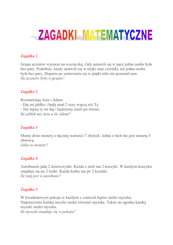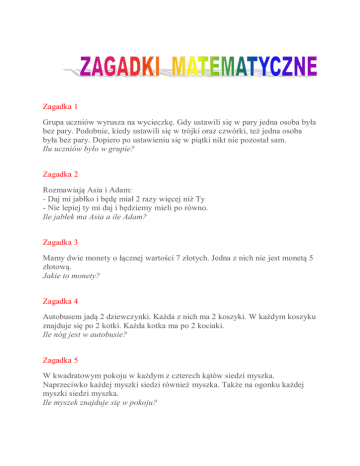 Zagadka 1 Grupa uczniów wyrusza na wycieczkę. Gdy ustawili się w pary jedna osoba była bez pary. Podobnie, kiedy ustawili się w trójki oraz czwórki, też jedna osoba była bez pary. Dopiero po ustawieniu się w piątki nikt nie pozostał sam. Ilu uczniów było w grupie? Zagadka 2 Rozmawiają Asia i Adam: - Daj mi jabłko i będę miał 2 razy więcej niż Ty - Nie lepiej ty mi daj i będziemy mieli po równo. Ile jabłek ma Asia a ile Adam? Zagadka 3 Mamy dwie monety o łącznej wartości 7 złotych. Jedna z nich nie jest monetą 5 złotową. Jakie to monety? Zagadka 4 Autobusem jadą 2 dziewczynki. Każda z nich ma 2 koszyki. W każdym koszyku znajduje się po 2 kotki. Każda kotka ma po 2 kociaki. Ile nóg jest w autobusie? Zagadka 5 W kwadratowym pokoju w każdym z czterech kątów siedzi myszka. Naprzeciwko każdej myszki siedzi również myszka. Także na ogonku każdej myszki siedzi myszka. Ile myszek znajduje się w pokoju? Zagadka 6 Dwóch ojców i dwóch synów postanowiło zjeść jajka na śniadanie. W sumie zjedli ich trzy, każdy zjadł całe jajko. Jak to mogło się stać? Zagadka 7 (praktyczna najlepiej) Do dyspozycji masz wiadro mieszczące w sobie 5 litrów wody oraz mniejsze o pojemności 3 litrów. Jak za ich pomocą odmierzyć 4 litry wody? Zagadka 8 W pewnej rodzinie jest pięciu braci. Każdy z nich ma siostrę. Ile dzieci jest w tej rodzinie? Zagadka 9 (z mojego dzieciństwa) Pewien chciał przewieźć z jeden strony rzeki na drugą stronę: kapustę, kozę i wilka. Miał łódź, ale poza nim mieściła się na niej tylko jedna rzecz (koza lub kapusta, lub wilk). Jak przewieźć kapustę i zwierzęta na drugą stronę, jeśli wiadomo, że: koza pozostawiona z kapustą zje kapustę, a wilk pozostawiony z kozą zje kozę...? Zagadka 10 Tomek ma jednakową liczbę braci i sióstr. Jego siostra ma dwa razy mnie sióstr niż braci. Ile rodzeństwa jest w tej rodzinie? Zagadka 11 Gospodarz hoduje na podwórzu kury i kozy. Ile zwierząt jest na podwórzu, jeśli wiadomo, że razem są 32 nogi? Zagadka 12 Gospodarz hoduje na podwórzu kury i kozy. Ile zwierząt jest na podwórzu, jeśli wiadomo, że razem są 32 nogi i 12 głów?