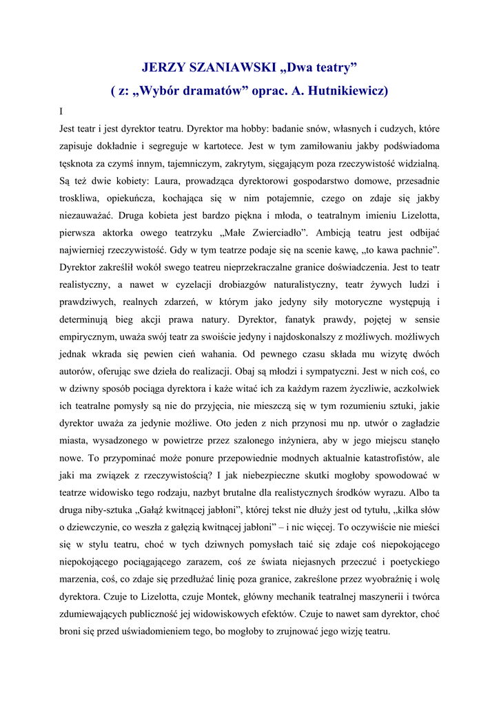 JERZY SZANIAWSKI „Dwa teatry” ( z: „Wybór dramatów” oprac. A. Hutnikiewicz) I Jest teatr i jest dyrektor teatru. Dyrektor ma hobby: badanie snów, własnych i cudzych, które zapisuje dokładnie i segreguje w kartotece. Jest w tym zamiłowaniu jakby podświadoma tęsknota za czymś innym, tajemniczym, zakrytym, sięgającym poza rzeczywistość widzialną. Są też dwie kobiety: Laura, prowadząca dyrektorowi gospodarstwo domowe, przesadnie troskliwa, opiekuńcza, kochająca się w nim potajemnie, czego on zdaje się jakby niezauważać. Druga kobieta jest bardzo piękna i młoda, o teatralnym imieniu Lizelotta, pierwsza aktorka owego teatrzyku „Małe Zwierciadło”. Ambicją teatru jest odbijać najwierniej rzeczywistość. Gdy w tym teatrze podaje się na scenie kawę, „to kawa pachnie”. Dyrektor zakreślił wokół swego teatreu nieprzekraczalne granice doświadczenia. Jest to teatr realistyczny, a nawet w cyzelacji drobiazgów naturalistyczny, teatr żywych ludzi i prawdziwych, realnych zdarzeń, w którym jako jedyny siły motoryczne występują i determinują bieg akcji prawa natury. Dyrektor, fanatyk prawdy, pojętej w sensie empirycznym, uważa swój teatr za swoiście jedyny i najdoskonalszy z możliwych. możliwych jednak wkrada się pewien cień wahania. Od pewnego czasu składa mu wizytę dwóch autorów, oferując swe dzieła do realizacji. Obaj są młodzi i sympatyczni. Jest w nich coś, co w dziwny sposób pociąga dyrektora i każe witać ich za każdym razem życzliwie, aczkolwiek ich teatralne pomysły są nie do przyjęcia, nie mieszczą się w tym rozumieniu sztuki, jakie dyrektor uważa za jedynie możliwe. Oto jeden z nich przynosi mu np. utwór o zagładzie miasta, wysadzonego w powietrze przez szalonego inżyniera, aby w jego miejscu stanęło nowe. To przypominać może ponure przepowiednie modnych aktualnie katastrofistów, ale jaki ma związek z rzeczywistością? I jak niebezpieczne skutki mogłoby spowodować w teatrze widowisko tego rodzaju, nazbyt brutalne dla realistycznych środków wyrazu. Albo ta druga niby-sztuka „Gałąź kwitnącej jabłoni”, której tekst nie dłuży jest od tytułu, „kilka słów o dziewczynie, co weszła z gałęzią kwitnącej jabłoni” – i nic więcej. To oczywiście nie mieści się w stylu teatru, choć w tych dziwnych pomysłach taić się zdaje coś niepokojącego niepokojącego pociągającego zarazem, coś ze świata niejasnych przeczuć i poetyckiego marzenia, coś, co zdaje się przedłużać linię poza granice, zakreślone przez wyobraźnię i wolę dyrektora. Czuje to Lizelotta, czuje Montek, główny mechanik teatralnej maszynerii i twórca zdumiewających publiczność jej widowiskowych efektów. Czuje to nawet sam dyrektor, choć broni się przed uświadomieniem tego, bo mogłoby to zrujnować jego wizję teatru. Choć on sam nie zdając sobie nawet sprawy przekracza jakby niekiedy ów krąg przez siebie zakreślony, owo dogmatyczne „stąd – dotąd”, i autor, którego wystawia, i widz z teatralnej Sali idą czasem dalej, gdzie indziej. A więc poza ową naturalistyczną rzeczywistością teatru miałżeby istnieć jakiś teatr inny, jakaś rzeczywistość „dalszych ciągów” tych zdarzeń, które kończą się pozornie z zapadnięciem kurtyny? II Drugi akt dramatu to swoisty „teatr w teatrze”. Wystawione zostają dwie jednoaktówki. Pierwsza „Matka”: izba mieszkalna zagubiona wśród lasów i zakopanej wśród śniegów leśniczówki. Zakłócenie przez śnieg ruchu kolejowego sprowadza do izby gościa, którą jest młoda, piękna, elegancka pani z wielkiego zapewne miasta. W leśniczówce zastała tylko starą kobietę (córka z mężem-leśniczym gdzieś wyjechali). Tu młoda kobieta, wśród pospolitych sprzętów mieszkania spostrzega przedmiot raczej niespotykany w lesie – pianino znakomitej marki Gerarda. Na pianinie fotografia zięcia starej kobiety. Okazuje się, że los i przypadek sprowadził wytwornego gościa do domu mężczyzny, który kiedyś był jej wielką miłością. Zaskozenie i lekkomyślna pokusa sprawia, że kobieta chce poczekać i zobaczyć go po tylu latach. Stara kobieta stwierdza, że to nie może się zdarzyć, bo jeju zięć to niepojęty i dziwny człowiek, bo lubi czasem przystanąć i przez długi czas wyglądać przez okno, jakby poza las. A tymczasem wkrótce ma się pojawic na świecie jego dziecko. Stara bezceremonialnie zmusza gościa do opuszczenia izby zanim młodzi powrócą. Młoda odjeżdża, a po chwili wraca młody leśniczy z żoną. Mężczyzna słyszał z dala, że ktoś tu był i własnie odjechał. Zobaczył otwarte pianino, poczuł zapach perfu,. „tamtych perfum”, zapach wypalonych przez gościa papierosów. Stanął przed oknem, zapatrzył się, głuchy na wszystko. A więc jest tak jak stara kobieta przewidziała. „A patrz sobie patrz” – uśmiechnęła się ironicznie. Ledwie zapadła kurtyna, a już podnosi się znowu i odsłania przed widzem inną przestrzeń. W czas powodzi na poddaszu schroniła się cała rodzina – mąż, żona, małe dziecko i stary ojciec mężczyzny. Woda wzrasta, jedyna nadzieja to zbliżająca się z dala łódź. Jest przepełniona i jedna osoba musi pozostać. Pada na ojca, który początkowo nieświadomy istoty rzeczy chwycił się instynktownie krawędzi łodzi. Syn podniósł wiosło i uderzył po rękach ojca, łódz zaczęła się oddalać. Z tonącego domu dobiega tylko rozpaczliwe wołanie opuszczonego. Oto jeszcze jedna projekcja wizji teatralnej twórcy tego teatru. Jest to teatr jakby „małego realizmu”, rejestrujący precyzyjnie drobne zdarzenia z codziennego, powszedniego życia, zwyczajne historie, jakie mogą się zdarzyć zawsze i wszędzie. Życie sprawia pewne problemy, a człowiek musi podejmować określone decyzje, które okazują się często ostateczne, zamykają sprawę na zawsze. Matka ocaliła swoją decyzją szczęście i spokój córki; młody 