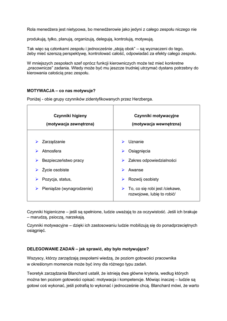 Rola menedżera jest nietypowa, bo menedżerowie jako jedyni z całego zespołu niczego nie produkują, tylko, planują, organizują, delegują, kontrolują, motywują. Tak więc są członkami zespołu i jednocześnie „stoją obok” – są wyznaczeni do tego, żeby mieć szerszą perspektywę, kontrolować całość, odpowiadać za efekty całego zespołu. W mniejszych zespołach szef oprócz funkcji kierowniczych może też mieć konkretne „pracownicze” zadania. Wtedy może być mu jeszcze trudniej utrzymać dystans potrzebny do kierowania całością prac zespołu. MOTYWACJA – co nas motywuje? Poniżej - obie grupy czynników zidentyfikowanych przez Herzberga. Czynniki higieny Czynniki motywacyjne (motywacja zewnętrzna) (motywacja wewnętrzna) Zarządzanie Uznanie Atmosfera Osiągnięcia Bezpieczeństwo pracy Zakres odpowiedzialności Życie osobiste Awanse Pozycja, status, Rozwój osobisty Pieniądze (wynagrodzenie) To, co się robi jest /ciekawe, rozwojowe, lubię to robić/ Czynniki higieniczne – jeśli są spełnione, ludzie uważają to za oczywistość. Jeśli ich brakuje – marudzą, psioczą, narzekają. Czynniki motywacyjne – dzięki ich zastosowaniu ludzie mobilizują się do ponadprzeciętnych osiągnięć. DELEGOWANIE ZADAŃ – jak sprawić, aby było motywujące? Wszyscy, którzy zarządzają zespołami wiedzą, że poziom gotowości pracownika w określonym momencie może być inny dla różnego typu zadań. Teoretyk zarządzania Blanchard ustalił, że istnieją dwa główne kryteria, według których można ten poziom gotowości opisać: motywacja i kompetencje. Mówiąc inaczej – ludzie są gotowi coś wykonać, jeśli potrafią to wykonać i jednocześnie chcą. Blanchard mówi, że warto elastycznie zmieniać styl zarządzania zależnie od tego, z jakimi kompetencjami pracownika pracujemy i jaką obserwujemy motywację. Delegowanie zadań, jak każda forma przekazywania upoważnień do samodzielnych decyzji, jest uznawane za formę motywacji pracownika. Pracownicy czują się docenieni i obdarzeni zaufaniem, a ponadto czują się bardziej zaangażowani w pracę w firmie. Przekazując zadania pracownikom bierz pod uwagę te dwa wymiary i spodziewaj się następujących sytuacji: Wysoka motywacja–niskie kompetencje. Mocne strony: chętnie się uczą, mają szacunek do nabytych umiejętności. Chętnie się podejmują zadań. Ryzyko: mogą popełniać błędy. Zalecenie: warto inwestować w rozwój kompetencji, budować relację na wspieraniu rozwoju kompetencji. Styl zarządzania: Wspierający – „omówmy to zadanie” Sposób prezentacji zadania: z poziomu tego, za co pracownik odpowiada Wysoka motywacja–wysokie kompetencje. Mocne strony: można im powierzyć najtrudniejsze zadania, chętnie się ich podejmują i potrafią je zakończyć z sukcesem. Ryzyko: aby działać – potrzebują kolejnych wyzwań. Mogą się poczuć pewnie i odejść do innej firmy. Źle znoszą kontrolę działania. Zalecenie: zlecać ciekawe zadania, pozwolić szkolić innych, omawiać zdobyte umiejętności, budować relacje na autonomii i zaufaniu. Styl zarządzania: Delegujący - chcę, abyś osiągnął to i to. Sposób prezentacji zadania: z poziomu stanowiska. Niska motywacja–niskie kompetencje. Mocne strony: zadowolą się wykonywaniem najprostszych zadań. Ryzyko: konieczność sprawowania kontroli, mogą się nie chcieć rozwijać. Zalecenie: sprawdzić czy niska motywacja jest powodem czy źródłem. Sprawdzić rzeczywisty potencjał – wspierać budowanie kompetencji. Ewentualnie zwolnić. Styl zarządzania: Autorytarny – zrób to w ten sposób Sposób prezentacji zadania: konkretne czynności do wykonania. Niska motywacja–wysokie kompetencje. Mocne strony: niewykorzystany potencjał. Ryzyko: „spali” najlepszy pomysł, przez brak chęci, może powodować konflikty. Zalecenie: rozmowa „dlaczego nie chcesz”, negocjacje, brać pod uwagę możliwość zwolnienia pracownika. Budować relacje: zaufanie wzajemne, uczyć odpowiedzialności. Styl zarządzania: Konsultacyjny – jak byś to zrobił? Sposób prezentacji zadania: z poziomu tego, za co pracownik odpowiada. Poziom gotowości pracownika do wykonania działania określa poziom motywacji (wysokaniska) oraz poziom kompetencji (wysokie-niskie). Warto dopasować styl zarządzania do prezentowanego poziomu gotowości. Niedopasowanie rodzi frustrację. Najlepszym działaniem kierownika jest pomoc podwładnym w osiąganiu coraz wyższego poziomu gotowości. Jak już wiesz – można to osiągnąć budując kompetencje lub dbając o motywację. Poziom gotowości zmienia się – wystarczy, że zmieni się sytuacja pracownika i zmianie ulegnie poziom kompetencji (pracownik się nauczy czegoś poprzez realizację zadania) lub motywacji (pracownik zniechęci się mało obiecującym zadaniem lub zobaczy w nim wyzwanie). W powyższy model się wpisuje model Shermana pokazujący poziomy delegowania: 1. działaj – nie są potrzebne dalsze kontakty ze mną. 2. działaj - powiadom mnie co zrobiłeś. 3. zbadaj problem – powiadom mnie co masz zamiar zrobić i zrób to – chyba, że ci zabronię. 4. zbadaj problem – powiadom mnie co zamierzasz zrobić, zaczekaj z działaniem aż wyrażę zgodę. 5. zbadaj problem – przedstaw mi możliwe działania, argumenty za i przeciw i wskaż do mojej akceptacji jedno z rozwiązań. 6. zbadaj problem – przedstaw mi wszystkie fakty, podejmę decyzję co należy zrobić. Delegując zadanie warto, aby menedżer: - Wybrał z zespołu najbardziej kompetentne osoby, które w przyszłości będą odpowiedzialne za wykonanie danego zadania; - Wytłumaczył podwładnemu na czym polega zadanie – zależnie od jego poziomu gotowości; - Określił zakres samodzielności decyzji, które może podejmować pracownik oraz tych, które są mu z góry narzucone; - Poinformował innych o przekazaniu upoważnień podwładnemu. a w szczególności osobom, którymi będzie zarz