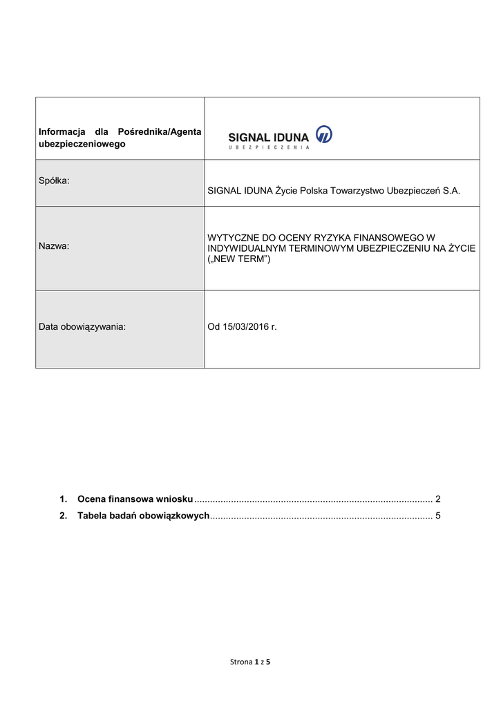 Informacja dla Pośrednika/Agenta ubezpieczeniowego Spółka: SIGNAL IDUNA Życie Polska Towarzystwo Ubezpieczeń S.A. Nazwa: WYTYCZNE DO OCENY RYZYKA FINANSOWEGO W INDYWIDUALNYM TERMINOWYM UBEZPIECZENIU NA ŻYCIE („NEW TERM”) Data obowiązywania: Od 15/03/2016 r. 1. Ocena finansowa wniosku ........................................................................................... 2 2. Tabela badań obowiązkowych ..................................................................................... 5 Strona 1 z 5 1. Ocena finansowa wniosku Ocena finansowa dotyczy: każdej osoby ubiegającej się o ubezpieczenie niezależnie od sumy ubezpieczenia, o jaką wnioskuje; każdej osoby ubiegającej się o podwyższenie sumy ubezpieczenia, za wyjątkiem gwarantowanego podwyższenia sumy ubezpieczenia określonego w OWU; dla określonych, skumulowanych sum ubezpieczenia podanych poniżej wymagana jest rozszerzona ocena finansowa; każdej osoby ubiegającej się o dokupienie umowy dodatkowej; Ubezpieczającego, jeśli jest tą samą osobą, co Ubezpieczony jak i oddzielnie Ubezpieczającego i Ubezpieczonego, gdy są innymi osobami/ podmiotami. Kwestionariusz finansowy wypełnia Ubezpieczony, jeśli jest jednocześnie Ubezpieczającym. Jeśli Ubezpieczającym jest firma, kwestionariusz finansowy wypełnia osoba reprezentująca/przedstawiciel firmy oraz dodatkowo oddzielnie Ubezpieczony, w przypadku ubezpieczenia pracowniczego Kwestionariusz finansowy wypełnia zawsze Ubezpieczony. W przypadku jakichkolwiek wątpliwości bądź niejasności, co do celu ubezpieczenia oraz zdolności finansowej underwriter może zwrócić się o uzupełnienie brakujących informacji lub przekazać do wypełnienia kwestionariusz finansowy, także poniżej łącznej sumy ubezpieczenia na życie tj. poniżej 500 000PLN. W wyniku oceny ryzyka finansowego underwriter może zaproponować także obniżenie sumy ubezpieczenia lub skrócenie okresu ubezpieczenia. W zależności od wskazanego przez Klienta celu ubezpieczenia, należy do kwestionariusza finansowego dołączyć dodatkowe dokumenty/ informacje: Strona 2 z 5 I. UBEPIECZENIE MA NA CELU ZABEZPIECZENIE RODZINY/ UBEZPIECZENIE POD KREDYT: a) do sumy ubezpieczenia 499.999 PLN – ocena na podstawie informacji podanych we wniosku o wysokości miesięcznych dochodów oraz informacji, które posiada SIGNAL IDUNA w ramach posiadanych już przez Klienta ubezpieczeń. W razie jakichkolwiek wątpliwości możliwe jest wystąpienie z prośbą o wypełnienie kwestionariusza finansowego (KF) b) przy sumie ubezpieczenia równej i powyżej 500.000 PLN obowiązkowo: kwestionariusz finansowy (KF) informacja we wniosku o wysokości miesięcznych dochodów c) przy sumie ubezpieczenia równej i powyżej 700.000 PLN obowiązkowo: kwestionariusz finansowy (KF) PIT-y lub zaświadczenie o dochodach z ostatnich 3 lat bilans firmy z ostatnich 3 lat (jeśli jest to ubezpieczenie wspólników) II. UBEZPIECZENIE POD KREDYT/ DODATKOWE INFORMACJE DO POWYŻSZYCH WARUNKÓW: a) przy sumie ubezpieczenia równej i powyżej 500.000 PLN: kwestionariusz finansowy (KF) informacje podane we wniosku o wysokości miesięcznych dochodów oraz informacji, które posiada SIGNAL IDUNA w ramach posiadanych już przez Klienta ubezpieczeń informacja o celu zaciągnięcia kredytu kopia umowy kredytu b) przy sumie ubezpieczenia równej i powyżej 700.000 PLN: kwestionariusz finansowy (KF) informacje podane we wniosku o wysokości miesięcznych dochodów oraz informacji, które posiada SIGNAL IDUNA w ramach posiadanych już przez Klienta ubezpieczeń informacja o celu zaciągnięcia kredytu kopia umowy kredytu zaświadczenie o dochodach z ostatnich trzech lat Strona 3 z 5 III. UBEZPIECZENIE SPŁATY ZOBOWIĄZAŃ PRZEDSIĘBIORSTWA/ DODATKOWE INFORMACJE DO POWYŻSZYCH WARUNKÓW: kwestionariusz finansowy (KF) wypełniony przez Ubezpieczonego oraz wypełniony przez firmę jeśli ma być Ubezpieczającym informacje podane we wniosku o wysokości miesięcznych dochodów oraz informacji, które posiada SIGNAL IDUNA w ramach posiadanych już przez Klienta ubezpieczeń umowa pożyczki lub kredytu informacje finansowe dokumenty finansowe lub raport z audytu IV. ZABEZPIECZENIE WSPÓLNIKÓW/DODATKOWE INFORMACJE DO POWYŻSZYCH WARUNKÓW: kwestionariusz finansowy (KF) wypełniony przez każdego ze wspólników oraz wypełniony przez firmę jeśli ma być Ubezpieczającym niezbędne są informacje o obowiązkach/zadaniach, dochodach itp. wspólnika, informacje finansowe dokumenty finansowe lub raport z audytu raport finansowy zawierające następujące informacje: · udział wspólników · zainwestowany kapitał · zyski z ostatnich trzech lat V. UBEZPIECZENIE KLUCZOWYCH PRACOWNIKÓW/DODATKOWE INFORMACJE DO POWYZSZYCH WARUNKÓW: kwestionariusz finansowy (KF) wypełniony przez firmę i pracownika który ma zostać ubezpieczony informacje podane we wniosku o wysokości miesięcznych dochodów oraz informacji, które posiada SIGNAL IDUNA w ramach posiadanych już przez Klienta ubezpieczeń niezbędne są informacje o obowiązkach/zadaniach, dochodach itp. wspólnika, informacje finansowe dokumenty finansowe lub raport z audytu Strona 4 z 5 2. Tabela badań obowiązkowych Wysokość sumy ubezpieczenia kwalifikująca do wykonania badań obowiązkowych wynikających z oceny ryzyka finansowego: Suma ubezp. w PLN do 150 000 150 001 - 300 000 300 001 - 500 000 500 001 - 750 000 od 750 001 wiek BADANIA KRWI/ BADANIA KRWI/ MOCZU/ MOCZU DIAGNOSTYCZNE BADANIA KRWI/ BADANIA KRWI/ BADANIA KRWI/ MOCZU/ MOCZU/ MOCZU DIAGNOSTYCZNE DIAGNOSTYCZNE BADANIA KRWI/ BADANIA KRWI/ BADANIA KRWI/ BADANIA KRWI/ MOCZU/ MOCZU/ MOCZU/ MOCZU DIAGNOSTYCZNE DIAGNOSTYCZNE DIAGNOSTYCZNE do 40 r.ż. 41- 50 r.ż. pow. 51 r.ż. Badania są wykonywane we wskazanych autoryzowanych placówkach oraz na koszt SIGNAL DIUNA. W przypadku zlecenia wykonania badań, z Klientem w ciągu maksymalnie 3 dni roboczych będzie kontaktował się konsultant ICR medycznego, w celu ustalen