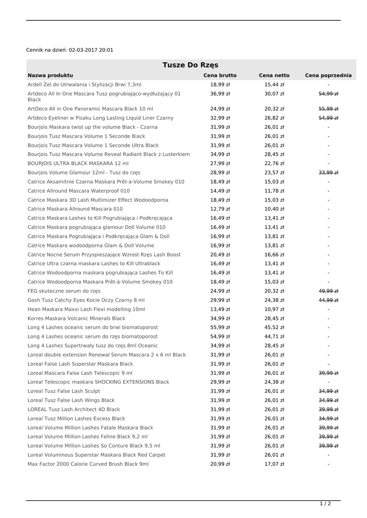 Cennik na dzień: 02-03-2017 20:01 Tusze Do Rzęs Nazwa produktu Cena brutto Cena netto Cena poprzednia Ardell Żel do Utrwalania i Stylizacji Brwi 7,3ml 18,99 zł 15,44 zł - Artdeco All In One Mascara Tusz pogrubiająco-wydłużający 01 Black 36,99 zł 30,07 zł 54,99 zł ArtDeco All in One Panoramic Mascara Black 10 ml 24,99 zł 20,32 zł 55,99 zł Artdeco Eyeliner w Pisaku Long Lasting Liquid Liner Czarny 32,99 zł 26,82 zł 54,99 zł Bourjois Maskara twist up the volume Black - Czarna 31,99 zł 26,01 zł - Bourjois Tusz Mascara Volume 1 Seconde Black 31,99 zł 26,01 zł - Bourjois Tusz Mascara Volume 1 Seconde Ultra Black 31,99 zł 26,01 zł - Bourjois Tusz Mascara Volume Reveal Radiant Black z Lusterkiem 34,99 zł 28,45 zł - BOURJOIS ULTRA BLACK MASKARA 12 ml 27,99 zł 22,76 zł - Bourjois Volume Glamour 12ml - Tusz do rzęs 28,99 zł 23,57 zł 33,99 zł Catrice Aksamitnie Czarna Maskara Prêt-à-Volume Smokey 010 18,49 zł 15,03 zł - Catrice Allround Mascara Waterproof 010 14,49 zł 11,78 zł - Catrice Maskara 3D Lash Multimizer Effect Wodoodporna 18,49 zł 15,03 zł - Catrice Maskara Allround Mascara 010 12,79 zł 10,40 zł - Catrice Maskara Lashes to Kill Pogrubiająca i Podkręcająca 16,49 zł 13,41 zł - Catrice Maskara pogrubiająca glamour Doll Volume 010 16,49 zł 13,41 zł - Catrice Maskara Pogrubiająca i Podkręcająca Glam & Doll 16,99 zł 13,81 zł - Catrice Maskara wodoodporna Glam & Doll Volume 16,99 zł 13,81 zł - Catrice Nocne Serum Przyspieszające Wzrost Rzęs Lash Boost 20,49 zł 16,66 zł - Catrice Ultra czarna maskara Lashes to Kill Ultrablack 16,49 zł 13,41 zł - Catrice Wodoodporna maskara pogrubiająca Lashes To Kill 16,49 zł 13,41 zł - Catrice Wodoodporna Maskara Prêt-à-Volume Smokey 010 18,49 zł 15,03 zł - FEG skuteczne serum do rzęs 24,99 zł 20,32 zł 49,99 zł Gosh Tusz Catchy Eyes Kocie Oczy Czarny 8 ml 29,99 zł 24,38 zł 44,99 zł Hean Maskara Maxxi Lash Flexi modelling 10ml 13,49 zł 10,97 zł - Korres Maskara Volcanic Minerals Black 34,99 zł 28,45 zł - Long 4 Lashes oceanic serum do brwi biomatoporost 55,99 zł 45,52 zł - Long 4 Lashes oceanic serum do rzęs biomatoporost 54,99 zł 44,71 zł - Long 4 Lashes Supertrwały tusz do rzęs 8ml Oceanic 34,99 zł 28,45 zł - Loreal double extension Renewal Serum Mascara 2 x 6 ml Black 31,99 zł 26,01 zł - Loreal False Lash Superstar Maskara Black 31,99 zł 26,01 zł - Loreal Mascara False Lash Telescopic 9 ml 31,99 zł 26,01 zł 39,99 zł Loreal Telescopic maskara SHOCKING EXTENSIONS Black 29,99 zł 24,38 zł - Loreal Tusz False Lash Sculpt 31,99 zł 26,01 zł 34,99 zł Loreal Tusz False Lash Wings Black 31,99 zł 26,01 zł 34,99 zł LOREAL Tusz Lash Architect 4D Black 31,99 zł 26,01 zł 39,99 zł Loreal Tusz Million Lashes Excess Black 31,99 zł 26,01 zł 34,99 zł Loreal Volume Million Lashes Fatale Maskara Black 31,99 zł 26,01 zł 39,99 zł Loreal Volume Million Lashes Feline Black 9,2 ml 31,99 zł 26,01 zł 39,99 zł Loreal Volume Million Lashes So Conture Black 9,5 ml 31,99 zł 26,01 zł 39,99 zł Loreal Voluminous Superstar Maskara Black Red Carpet 31,99 zł 26,01 zł - Max Factor 2000 Calorie Curved Brush Black 9ml 20,99 zł 17,07 zł - 1/2 Max Factor False Lash Effect Black 13,1 ml 29,99 zł 24,38 zł 34,99 zł Max Factor Maskara 2000 Calorie Black 9ml 19,99 zł 16,25 zł 24,99 zł Max Factor Maskara 2000 Calorie Black Wodoodporna 20,99 zł 17,07 zł - Max Factor Maskara Masterpiece Rich Black 26,99 zł 21,94 zł 31,99 zł Max Factor Maskara Masterpiece Wodoodporna Black 29,99 zł 24,38 zł 34,39 zł Maybelline maskara lash sensational extra black 9,5ml 18,99 zł 15,44 zł - Maybelline colossal go extreme leather black 9,5 ml 17,99 zł 14,63 zł - Maybelline colossal spider effect black 9,5 ml 17,99 zł 14,63 zł - Maybelline colossal volum express black 10,7ml 17,99 zł 14,63 zł - Maybelline Mascara Colossal Go Chaotic Black 9,5 ml 17,99 zł 14,63 zł - Paese Tusz do Rzęs Adore 3D Lash Mascara 26,99 zł 21,94 zł - Rimmel Mascara extra super lash podkręcajacy tusz black 11,99 zł 9,75 zł 14,99 zł 2/2 Powered by TCPDF (www.tcpdf.org)