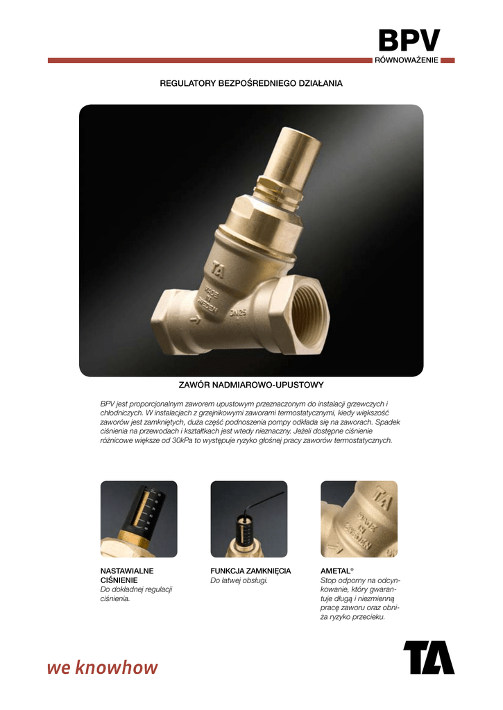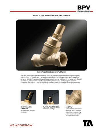 BPV RÓWNOWAŻENIE regulatory bezpośredniego działania Zawór nadmiarowo-upustowy BPV jest proporcjonalnym zaworem upustowym przeznaczonym do instalacji grzewczych i chłodniczych. W instalacjach z grzejnikowymi zaworami termostatycznymi, kiedy większość zaworów jest zamkniętych, duża część podnoszenia pompy odkłada się na zaworach. Spadek ciśnienia na przewodach i kształtkach jest wtedy nieznaczny. Jeżeli dostępne ciśnienie różnicowe większe od 30kPa to występuje ryzyko głośnej pracy zaworów termostatycznych. NASTAWIALNE CIŚNIENIE Do dokładnej regulacji ciśnienia. FUNKCJA Zamknięcia Do łatwej obsługi. AMETAL® Stop odporny na odcynkowanie, który gwarantuje długą i niezmienną pracę zaworu oraz obniża ryzyko przecieku. BPV RÓWNOWAŻENIE Dane techniczne Zastosowanie: Instalacje ogrzewania, chłodzenia i ciepłej wody użytkowej. FUNKCJE Proporcjonalny upust Nastawialna różnica ciśnienia (Dp) Odcięcie Wymiary: DN 15-32 KLASA CIŚNIENIA PN 20 Zakres nastawy: 10-60 kPa Temperatura: Max. temperatura pracy: 120°C Min. temperatura pracy: -20°C Zastosowane materiały: Korpus zaworu, dławnica, trzpień: AMETAL®. Śrubunek, końcówki i pokrywa: Mosiądz. Uszczelnienia: Grafit. Sprężyna: Stal nierdzewna. Uszczelki typu O-ring: Guma EPDM. Uszczelnienie grzyba: Teflon. AMETAL® jest stopem odpornym na odcynkowanie firmy TA. Oznaczenie: Typ zaworu, DN i rozmiar w calach. 2 BPV RÓWNOWAŻENIE Prosty 10-60 kPa Nr kat. DN D L H 52 198-315 52 198-320 52 198-325 52 198-332 15 20 25 32 G1/2 G3/4 G1 G1 1/4 70 85 98 112 93 93 103 105 Nr kat. DN d D Da L H 52 198-020 52 198-025 20 25 R3/4 R1 G3/4 G1 M34x1,5 M40x2,0 70 83 122 138 Kątowy 10-60 kPa BPV DN 15 i DN 20 mogą być podłączone do rur cienkościennych poprzez złączki zaciskowe KOMBI. Więcej inofmacji w katalogu złączek KOMBI. 3 BPV RÓWNOWAŻENIE MONTAŻ Zawór BPV instaluje się w systemie za zaworem regulacyjnym pomiędzy zasilaniem i powrotem. Zawór BPV jest bezstopniowo regulowany i otwiera się dopiero od nastawionej wartości. W ten sposób możliwe jest utrzymanie stałej wartości zarówno ciśnienia różnicowego, jak i przepływu w sieci rozdzielczej. Przez to, temperatura w przewodach jest utrzymywana i zabezpieczony jest minimalny przepływ na pompie. Przykład zastosowania: NASTAWIANIE Za pomocą klucza imbusowego ustawia się w zaworze BPV wymagane ciśnienie różnicowe. 4 BPV RÓWNOWAŻENIE Wykresy BPV Charakterystyki zaworu BPV Ustawienie zaworu BPV do wymaganego ciśnienia róźnicowego (10-60 kPa). Charekterystyki zaworu przedstawione są poniżej *) Nastawa ciśnienia różnicowego 6-15-5 BPV 2008.05 5 IMI INTERNATIONAL Sp. z o.o. Olewin 50A,32-300 Olkusz, tel. (032) 75 88 200, fax (032) 75 88 201, e-mail: [email protected] www.imi-international.pl IMI INTERNATIONAL Sp. z o.o. zastrzega sobie prawo do dokonywania zmian w produktach i ich specyfikacjach bez uprzedniego powiadamiania.