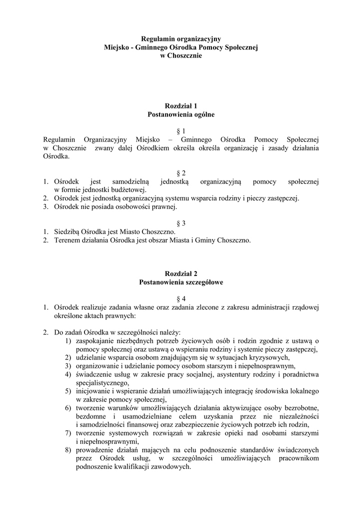 Regulamin organizacyjny Miejsko - Gminnego Ośrodka Pomocy Społecznej w Choszcznie Rozdział 1 Postanowienia ogólne §1 Regulamin Organizacyjny Miejsko – Gminnego Ośrodka Pomocy Społecznej w Choszcznie zwany dalej Ośrodkiem określa określa organizację i zasady działania Ośrodka. §2 1. Ośrodek jest samodzielną jednostką organizacyjną pomocy społecznej w formie jednostki budżetowej. 2. Ośrodek jest jednostką organizacyjną systemu wsparcia rodziny i pieczy zastępczej. 3. Ośrodek nie posiada osobowości prawnej. §3 1. Siedzibą Ośrodka jest Miasto Choszczno. 2. Terenem działania Ośrodka jest obszar Miasta i Gminy Choszczno. Rozdział 2 Postanowienia szczegółowe §4 1. Ośrodek realizuje zadania własne oraz zadania zlecone z zakresu administracji rządowej określone aktach prawnych: 2. Do zadań Ośrodka w szczególności należy: 1) zaspokajanie niezbędnych potrzeb życiowych osób i rodzin zgodnie z ustawą o pomocy społecznej oraz ustawą o wspieraniu rodziny i systemie pieczy zastępczej, 2) udzielanie wsparcia osobom znajdującym się w sytuacjach kryzysowych, 3) organizowanie i udzielanie pomocy osobom starszym i niepełnosprawnym, 4) świadczenie usług w zakresie pracy socjalnej, asystentury rodziny i poradnictwa specjalistycznego, 5) inicjowanie i wspieranie działań umożliwiających integrację środowiska lokalnego w zakresie pomocy społecznej, 6) tworzenie warunków umożliwiających działania aktywizujące osoby bezrobotne, bezdomne i usamodzielniane celem uzyskania przez nie niezależności i samodzielności finansowej oraz zabezpieczenie życiowych potrzeb ich rodzin, 7) tworzenie systemowych rozwiązań w zakresie opieki nad osobami starszymi i niepełnosprawnymi, 8) prowadzenie działań mających na celu podnoszenie standardów świadczonych przez Ośrodek usług, w szczególności umożliwiających pracownikom podnoszenie kwalifikacji zawodowych. §5 1. Nadzór nad działalnością Ośrodka sprawuje Burmistrz. 2. Burmistrz będąc zwierzchnikiem służbowym w stosunku do kierownika nawiązuje i rozwiązuje z nim stosunek pracy. Rozdział 3 Zasady kierowania Ośrodkiem 1. 2. 3. 4. §6 Pracą Ośrodka kieruje Kierownik i reprezentuje go na zewnątrz. Kierownik działa na podstawie pełnomocnictwa udzielonego przez Burmistrza i ponosi odpowiedzialność za całokształt funkcjonowania Ośrodka. Kierownik Ośrodka jest uprawniony do nawiązywania stosunku pracy i dokonywania czynności pracodawcy w stosunku do osób zatrudnionych w Ośrodku. Kierownik kieruje Ośrodkiem przy pomocy Zastępcy Kierownika, Głównego Księgowego. Rozdział 4 Struktura organizacyjna Ośrodka §7 1. W Ośrodku funkcjonują następujące działy, komórki organizacyjne i stanowiska: 1) Kierownik 2) Z-ca kierownika 3) Administrator bezpieczeństwa informacji 4) Starszy administrator 5) Księgowość: a) główna księgowa, b) księgowe, c) kasjerka, 6) Dział pracowników socjalnych 7) Stanowisko ds. dodatków mieszkaniowych 8) Stanowisko ds. obsługi sekretariatu 9) Stanowisko ds. informatyki 10) Stanowisko ds. funduszy unijnych 11) Dział pomocy specjalistycznej: a) opiekunka specjalistyczna 12) Opieka środowiskowa: a) opiekunka środowiskowa, 13) Dział świadczeń rodzinnych, a) zasiłki rodzinne b) fundusz alimentacyjny 14) Punkt interwencji kryzysowej (prawnik, psycholog, doradca rodzinny, terapeuta ds. uzależnień) 15) Asystent rodziny 16) Zespół Interdyscyplinarny, 17) Świetlice środowiskowe 18) Dział gospodarczy: a) kierowca b) sprzątaczka 2. Szczegółową strukturę organizacyjną Ośrodka przedstawia schemat organizacyjny stanowiący załącznik nr 1 do regulaminu. §8 1. Do zakresu działań Kierownika MGOPS należy: a) kierowanie pracą podległych mu pracowników, b) dbanie o należyty dobór pracowników Ośrodka i podnoszenie ich kwalifikacji, c) dokonywanie podziału zadań, uprawnień i odpowiedzialności między podległych pracowników, koordynowanie ich pracę. d) czuwanie nad planowym i terminowym wykonywaniem zadań MGOPS e) reprezentowanie MGOPS w Choszcznie na zewnątrz, składanie w jego imieniu oświadczeń z zachowaniem obowiązujących przepisów, f) ochrona powierzonego mienia komunalnego, g) czuwanie nad przestrzeganiem przepisów o tajemnicy służbowej i ochronie danych osobowych. h) analizowanie stosownych form i metod działania w zakresie opieki oraz ocena ich skuteczności, i) wydawanie zarządzeń oraz poleceń służbowych pracownikom. 2. Do zakresu działań zastępcy kierownika Ośrodka należy w szczególności: a) zastępowanie Kierownika i prowadzenie wszystkich prac w przypadku jego nieobecności, b) sprawowanie bezpośredniego nadzoru oraz organizowanie pracy działu świadczeń rodzinnych, c) sprawowanie bezpośredniego nadzoru oraz organizowanie pracy działu opieki specjalistycznej, d) sporządzanie sprawozdań z udzielanych przez Ośrodek świadczeń, e) sporządzanie deklaracji rozliczeniowych dotyczących ubezpieczeń (emerytalnych, rentowych i zdrowotnych) zasiłkobiorców Ośrodka. 3. Do zakresu działań administratora bezpieczeństwa informacji należy: a) egzekwowanie zgodnego z prawem przetwarzania danych osobowych. b) udzielanie upoważnień do przetwarzania danych osobowych określając ich zakres oraz termin ważności, c) prowadzenie ewidencji osób upoważnionych do przetwarzania danych osobowych. d) ewidencjonowanie oświadczeń osób upoważnionych do przetwarzania danych osobowych o zaznajomieniu się z zasadami zachowania ich bezpieczeństwa, e) identyfikowanie potrzeb w zakresie adekwatności stosowanych w Ośrodku zabezpieczeń, wnioskowanie o ich zatwierdzenie i nadzorowanie prawidłowości ich wdrożenia oraz przestrzegania. f) udzielanie wyjaśnień i interpretowanie zgodności stosowanych rozwiązań w zakresie ochrony danych osobowych z przepisami prawa. g) obsługiwanie kontroli oraz współpraca z podmiotami zewnętrznymi uprawnionymi do dostępu do danych osobowych przetwarzanych