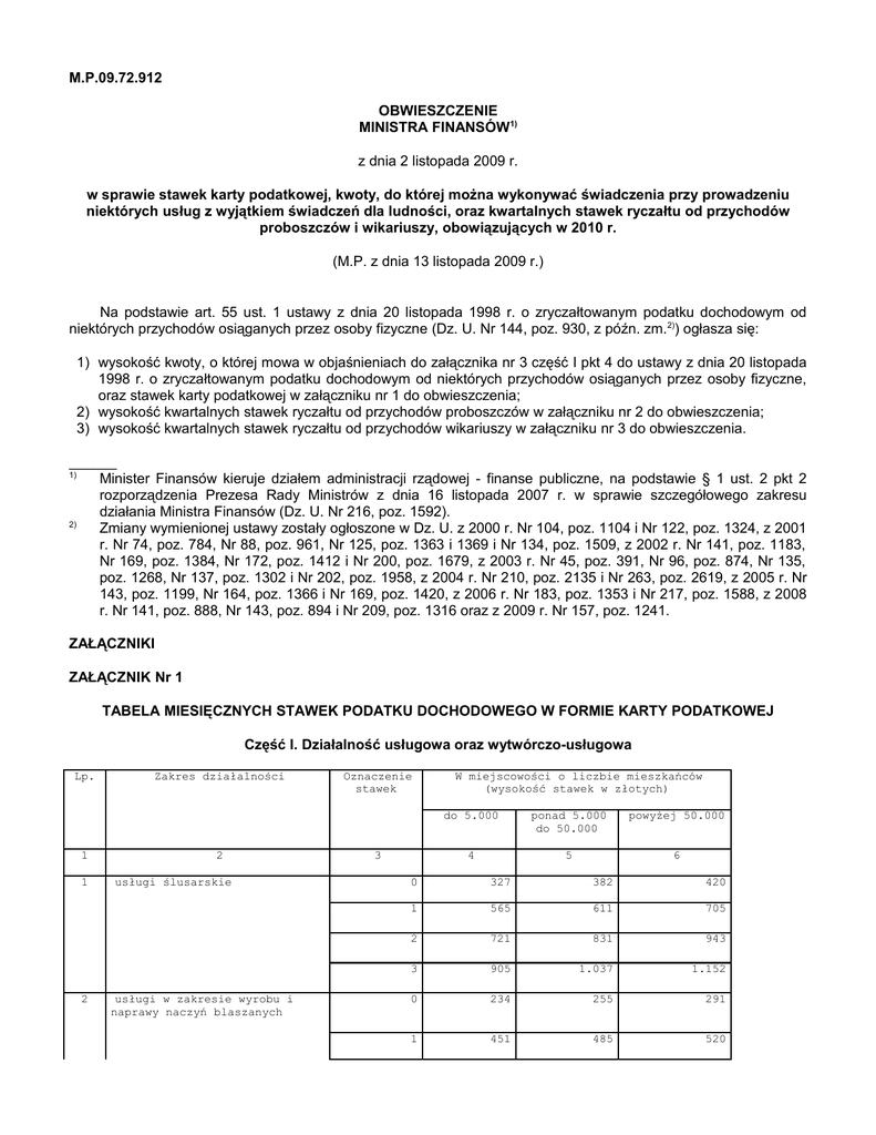 M.P.09.72.912 OBWIESZCZENIE MINISTRA FINANSÓW1) z dnia 2 listopada 2009 r. w sprawie stawek karty podatkowej, kwoty, do której można wykonywać świadczenia przy prowadzeniu niektórych usług z wyjątkiem świadczeń dla ludności, oraz kwartalnych stawek ryczałtu od przychodów proboszczów i wikariuszy, obowiązujących w 2010 r. (M.P. z dnia 13 listopada 2009 r.) Na podstawie art. 55 ust. 1 ustawy z dnia 20 listopada 1998 r. o zryczałtowanym podatku dochodowym od niektórych przychodów osiąganych przez osoby fizyczne (Dz. U. Nr 144, poz. 930, z późn. zm.2)) ogłasza się: 1) wysokość kwoty, o której mowa w objaśnieniach do załącznika nr 3 część I pkt 4 do ustawy z dnia 20 listopada 1998 r. o zryczałtowanym podatku dochodowym od niektórych przychodów osiąganych przez osoby fizyczne, oraz stawek karty podatkowej w załączniku nr 1 do obwieszczenia; 2) wysokość kwartalnych stawek ryczałtu od przychodów proboszczów w załączniku nr 2 do obwieszczenia; 3) wysokość kwartalnych stawek ryczałtu od przychodów wikariuszy w załączniku nr 3 do obwieszczenia. ______ 1) Minister Finansów kieruje działem administracji rządowej - finanse publiczne, na podstawie § 1 ust. 2 pkt 2 rozporządzenia Prezesa Rady Ministrów z dnia 16 listopada 2007 r. w sprawie szczegółowego zakresu działania Ministra Finansów (Dz. U. Nr 216, poz. 1592). 2) Zmiany wymienionej ustawy zostały ogłoszone w Dz. U. z 2000 r. Nr 104, poz. 1104 i Nr 122, poz. 1324, z 2001 r. Nr 74, poz. 784, Nr 88, poz. 961, Nr 125, poz. 1363 i 1369 i Nr 134, poz. 1509, z 2002 r. Nr 141, poz. 1183, Nr 169, poz. 1384, Nr 172, poz. 1412 i Nr 200, poz. 1679, z 2003 r. Nr 45, poz. 391, Nr 96, poz. 874, Nr 135, poz. 1268, Nr 137, poz. 1302 i Nr 202, poz. 1958, z 2004 r. Nr 210, poz. 2135 i Nr 263, poz. 2619, z 2005 r. Nr 143, poz. 1199, Nr 164, poz. 1366 i Nr 169, poz. 1420, z 2006 r. Nr 183, poz. 1353 i Nr 217, poz. 1588, z 2008 r. Nr 141, poz. 888, Nr 143, poz. 894 i Nr 209, poz. 1316 oraz z 2009 r. Nr 157, poz. 1241. ZAŁĄCZNIKI ZAŁĄCZNIK Nr 1 TABELA MIESIĘCZNYCH STAWEK PODATKU DOCHODOWEGO W FORMIE KARTY PODATKOWEJ Część I. Działalność usługowa oraz wytwórczo-usługowa Lp. 1 1 2 Zakres działalności 2 usługi ślusarskie usługi w zakresie wyrobu i naprawy naczyń blaszanych Oznaczenie stawek 3 W miejscowości o liczbie mieszkańców (wysokość stawek w złotych) do 5.000 ponad 5.000 do 50.000 powyżej 50.000 4 5 6 0 327 382 420 1 565 611 705 2 721 831 943 3 905 1.037 1.152 0 234 255 291 1 451 485 520 3 4 5 6 7 8 9 10 11 12 13 usługi rusznikarskie usługi w zakresie złotnictwa jubilerstwa - dla ludności usługi grawerskie usługi w zakresie wyrobu pieczątek usługi pobielania kotłów i naczyń usługi kowalskie usługi w zakresie elektromechaniki chłodniczej usługi w zakresie kotlarstwa usługi w zakresie mechaniki maszyn usługi w zakresie mechaniki maszyn i urządzeń rolniczych usługi w zakresie elektromechaniki sprzętu medycznego i laboratoryjnego 2 556 611 686 0 163 185 198 1 307 362 402 0 382 420 420 1 651 746 746 2 977 1.089 1.089 0 342 382 436 1 632 721 816 0 307 362 402 1 578 632 721 0 686 686 686 1 1.343 1.343 1.343 0 163 185 198 1 327 382 420 2 451 485 520 3 497 543 589 0 342 402 436 1 632 721 816 2 962 1.098 1.205 3 1.205 1.331 1.446 0 307 362 402 1 556 611 686 0 273 307 342 1 497 534 578 2 632 721 816 3 761 870 977 4 926 1.054 1.167 0 163 198 219 1 342 382 436 2 462 508 543 3 534 578 632 4 589 669 761 0 198 234 255 14 15 16 17 18 19 20 21 usługi w zakresie mechaniki precyzyjnej usługi w zakresie mechaniki maszyn biurowych usługi w zakresie wyrobu i naprawy wag usługi zegarmistrzowskie usługi w zakresie antykorozyjnego zabezpieczania pojazdów usługi w zakresie mycia oraz smarowania samochodów i motocykli oraz inne usługi niezwiązane z ich naprawą usługi w zakresie elektromechaniki, z wyjątkiem dźwigowej, chłodniczej i pojazdowej naprawa i konserwacja urządzeń elektronicznych 1 451 497 534 2 578 632 721 3 705 797 905 0 219 234 273 1 451 485 520 2 556 611 686 3 651 746 831 0 219 234 273 1 462 508 543 0 273 307 342 1 520 565 611 0 163 198 219 1 362 402 451 2 474 520 556 3 543 603 669 0 485 520 565 1 943 1.074 1.178 2 1.355 1.490 1.638 3 1.737 1.989 2.240 0 291 327 362 1 556 611 686 2 746 853 962 3 977 1.126 1.221 4 1.126 1.247 1.355 5 1.313 1.446 1.585 0 362 402 451 1 651 761 853 2 962 1.110 1.205 3 1.152 1.261 1.384 0 234 273 307 22 23 24 25 26 27 28 29 usługi w zakresie tele- i radiomechaniki usługi w zakresie bieżnikowania opon usługi wulkanizatorskie, z wyjątkiem bieżnikowania opon szklarstwo* witrażownictwo* usługi stolarskie, z wyjątkiem wyrobu trumien kołodziejstwo* usługi w zakresie pozłotnictwa 1 485 520 565 2 603 686 780 0 234 255 291 1 462 508 543 2 578 632 721 3 761 870 977 4 926 1.054 1.167 0 474 474 474 1 816 816 816 2 1.089 1.089 1.089 3 1.235 1.235 1.235 0 327 382 420 1 578 632 721 2 816 943 1.054 3 1.017 1.141 1.247 0 291 291 291 1 565 565 565 2 721 721 721 3 870 870 870 0 219 234 273 1 451 497 534 2 556 611 686 3 565 721 816 0 291 327 362 1 520 565 611 2 686 780 888 3 870 977 1.110 0 219 219 219 1 436 436 436 2 534 534 534 0 185 219 234 1 382 436 474 2 485 520 565 3 534 578 632 30 31 32 33 34 35 36 37 38 39 40 usługi tapicerskie bednarstwo* koszykarstwo* wytwarzanie mioteł, wyrobów z gałęzi i słomy* gręplarstwo* kilimiarstwo* koronkarstwo, z wyjątkiem maszynowego* usługi hafciarskie dziewiarstwo na drutach i szydełkach* repasacja pończoch usługi w zakresie bieliźniarstwa 0 198 234 255 1 451 497 534 2 565 611 705 3 651 761 853 0 145 145 145 1 307 307 307 2 420 420 420 0 362 362 420 1 831 831 831 2 1.178 1.178 1.178 0 198 198 198 1 436 436 436 0 109 126 145 1 291 327 362 2 382 436 474 0 255 255 255 1 520 520 520 2 651 651 651 0 126 126 126 1 291 291 291 0 185 198 198 1 362 402 402 2 485 520 520 3 556 603 603 4 603 669 669 0 72 72 72 1 198 198 198 2 273 273 273 0 72 72 72 1 198 198 198 0 126 145 163 1 307 342 382 2 42