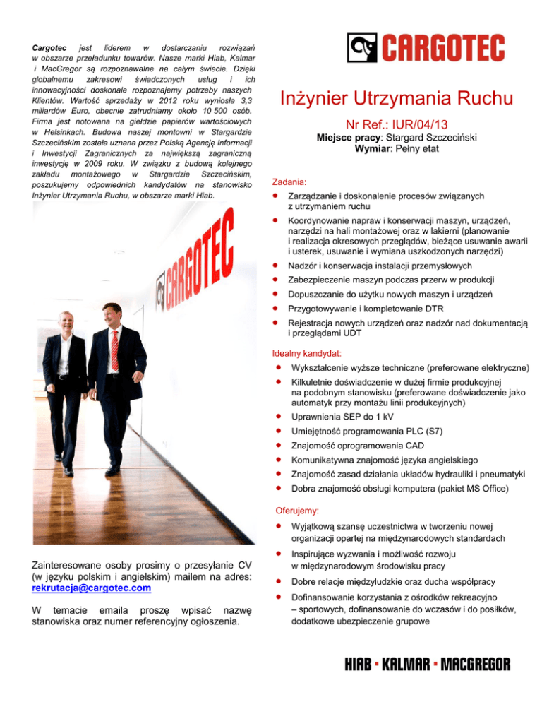 Cargotec jest liderem w dostarczaniu rozwiązań w obszarze przeładunku towarów. Nasze marki Hiab, Kalmar i MacGregor są rozpoznawalne na całym świecie. Dzięki globalnemu zakresowi świadczonych usług i ich innowacyjności doskonale rozpoznajemy potrzeby naszych Klientów. Wartość sprzedaży w 2012 roku wyniosła 3,3 miliardów Euro, obecnie zatrudniamy około 10 500 osób. Firma jest notowana na giełdzie papierów wartościowych w Helsinkach. Budowa naszej montowni w Stargardzie Szczecińskim została uznana przez Polską Agencję Informacji i Inwestycji Zagranicznych za największą zagraniczną inwestycję w 2009 roku. W związku z budową kolejnego zakładu montażowego w Stargardzie Szczecińskim, poszukujemy odpowiednich kandydatów na stanowisko Inżynier Utrzymania Ruchu, w obszarze marki Hiab. Inżynier Utrzymania Ruchu Nr Ref.: IUR/04/13 Miejsce pracy: Stargard Szczeciński Wymiar: Pełny etat Zadania: Zarządzanie i doskonalenie procesów związanych z utrzymaniem ruchu Koordynowanie napraw i konserwacji maszyn, urządzeń, narzędzi na hali montażowej oraz w lakierni (planowanie i realizacja okresowych przeglądów, bieżące usuwanie awarii i usterek, usuwanie i wymiana uszkodzonych narzędzi) Nadzór i konserwacja instalacji przemysłowych Zabezpieczenie maszyn podczas przerw w produkcji Dopuszczanie do użytku nowych maszyn i urządzeń Przygotowywanie i kompletowanie DTR Rejestracja nowych urządzeń oraz nadzór nad dokumentacją i przeglądami UDT Idealny kandydat: Wykształcenie wyższe techniczne (preferowane elektryczne) Kilkuletnie doświadczenie w dużej firmie produkcyjnej na podobnym stanowisku (preferowane doświadczenie jako automatyk przy montażu linii produkcyjnych) Uprawnienia SEP do 1 kV Umiejętność programowania PLC (S7) Znajomość oprogramowania CAD Komunikatywna znajomość języka angielskiego Znajomość zasad działania układów hydrauliki i pneumatyki Dobra znajomość obsługi komputera (pakiet MS Office) Oferujemy: Zainteresowane osoby prosimy o przesyłanie CV (w języku polskim i angielskim) mailem na adres: [email protected] W temacie emaila proszę wpisać nazwę stanowiska oraz numer referencyjny ogłoszenia. Wyjątkową szansę uczestnictwa w tworzeniu nowej organizacji opartej na międzynarodowych standardach Inspirujące wyzwania i możliwość rozwoju w międzynarodowym środowisku pracy Dobre relacje międzyludzkie oraz ducha współpracy Dofinansowanie korzystania z ośrodków rekreacyjno – sportowych, dofinansowanie do wczasów i do posiłków, dodatkowe ubezpieczenie grupowe Cargotec improves the efficiency of cargo flows on land and at sea – wherever cargo is on the move. Cargotec’s daughter brands Hiab, Kalmar and MacGregor are recognised leaders in cargo and load handling solutions around the world. Cargotec’s global network is positioned close to customers and offers extensive services that ensure the continuous, reliable and sustainable performance of equipment. Cargotec’s sales totalled EUR 3,3 billion in 2012 and it employs more than 10 500 people. Cargotec’s class B shares are quoted on the NASDAQ OMX Helsinki. Our investment in Stargard Szczeciński was shortlisted by Polish foreign investments and information agency as the biggest foreign greenfield investment in 2009. Currently we build new assembly plant and search for suitable candidates for Maintenance Engineer position, responsible for Hiab area. Maintenance Engineer ID. no. IUR/04/2013 Place of work: Stargard Szczeciński Working time: full-time Responsibilities: Managing and improving maintenance processes Coordinate repairs and maintain machinery, equipment, tools in assembly plant and paint shop (planning and implementing periodic inspections, corrective maintenance, removal and replacement damaged tools) Monitoring and maintenance industrial installations Protecting machinery during production downtime Organize permissions for use new machines and equipment Preparing and completing technical and maintenance documentation Registering new equipment and monitoring documentation and inspections conducted by Office of Technical Inspection (UDT) Ideal candidate: If you are interested in, please send your application documents in English and Polish on e-mail address: [email protected] Technical degree (preferred electrical) Several years of experience on similar position in a big manufacturing company (preferred experience in assembly production line as a automation engineer) Polish Electricians Association Certificate (up to 1kV) PLC (S7) programming skills CAD software knowledge Communicative English Knowledge of hydraulic and pneumatic systems operating principles Computer literate (MS Office) We offer: Please put the reference number in e-mail`s subject. Unique opportunity to participate in the setup of organization based on international standards Challenging tasks and growth opportunities in an international work environment Good interpersonal relations and spirit | of cooperation Sports and culture subsidies, lunch and holiday subsidies, additional group insurance