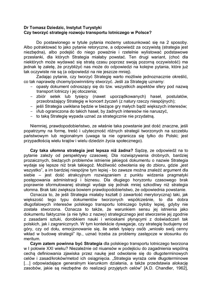 Dr Tomasz Dziedzic, Instytut Turystyki Czy tworzyć strategię rozwoju transportu lotniczego w Polsce? Do postawionego w tytule pytania możemy ustosunkować się na 2 sposoby. Albo potraktować to jako pytanie retoryczne, a odpowiedź za oczywistą (strategia jest niezbędna), albo podejść do niego poważnie i rzetelnie wylistować podstawowe przesłanki, dla których Strategia miałaby powstać. Ten drugi wariant, (choć dla niektórych może wydawać się stratą czasu poprzez swoją pozorną oczywistość) ma jednak tę zaletę, że przybliżyć nas może do odpowiedzi na kolejne pytania, które już tak oczywiste nie są (a odpowiedzi na nie jeszcze mniej). Zadając pytanie, czy tworzyć Strategię warto możliwie jednoznacznie określić, co tak naprawdę chcemy/powinniśmy stworzyć. Jeśli za Strategię uznamy: - opasły dokument odnoszący się do tzw. wszystkich aspektów sfery pod nazwą transport lotniczy i jej otoczenia; - zbiór setek lub tysięcy (nawet uporządkowanych) haseł, postulatów, przeobrażający Strategię w koncert życzeń (z natury rzeczy niespójnych); - jeśli Strategia uwikłana będzie w bieżące gry małych bądź większych interesów; - i/lub ograniczona do takich haseł, by żadnych interesów nie naruszyć, - to taką Strategię wypada uznać za strategicznie nie przydatną. Niemniej, prawdopodobieństwo, ze właśnie taka powstanie jest dość znaczne, jeśli popatrzymy na formę, treść i użyteczność różnych strategii tworzonych na szczeblu państwowym lub regionalnym (uwaga ta nie ogranicza się tylko do Polski; jest przypadłością wielu krajów i wielu dziedzin życia społecznego). Czy taka ułomna strategia jest lepsza niż żadna? Sądzę, ze odpowiedź na to pytanie zależy od perspektywy czasowej. Dla rozwiązywania drobnych, bardziej prozaicznych, bieżących problemów istnienie jakiegoś dokumentu o nazwie Strategia wydaje się lepsze niż brak takiegoż. Możliwość odwołania się do zbioru, gdzie „jest wszystko”, a im bardziej niespójne tym lepiej - bo zawsze można znaleźć argument dla siebie – jest dość atrakcyjnym rozwiązaniem z punktu widzenia pragmatyki postępowania administracji i biznesu. Dla długiego horyzontu czasowego brak poprawnie sformułowanej strategii wydaje się jednak mniej szkodliwy niż strategia ułomna. Brak taki zwiększa bowiem prawdopodobieństwo, że odpowiednia powstanie. Oznacza to, że jeśli Strategia miałaby kształt (i zawartość merytoryczną) taki, jak większość tego typu dokumentów tworzonych współcześnie, to dla dobra długofalowych interesów polskiego transportu lotniczego byłoby lepiej, gdyby nie została stworzona. Oznacza to także, że warunkiem sensu jej istnienia jako dokumentu faktycznie (a nie tylko z nazwy) strategicznego jest stworzenie jej zgodnie z zasadami sztuki, dorobkiem nauki i wnioskami płynącymi z doświadczeń tak polskich, jak i zagranicznych. W tym kontekście dywagacje, czy strategię budujemy od góry, czy od dołu, emocjonowanie się, ile setek tysięcy osób „wniosło swój cenny wkład w budowę strategii” itp., uznać trzeba za problemy zastępcze w stosunku do meritum. Czym zatem powinna być Strategia dla polskiego transportu lotniczego tworzona w I połowie XXI wieku? Niezależnie od niuansów w podejściu do zagadnienia wspólną cechą definiowania zjawiska przez naukę jest odwołanie się do długoterminowych celów i zasad/kroków/metod ich osiągnięcia. „Strategia wyraża cele długoterminowe […] odpowiadające generalnym kierunkom działania, a także przedstawia alokację zasobów, jakie są niezbędne do realizacji przyjętych celów” [A.D. Chandler, 1962], „Strategia dotyczy długofalowych celów i sposobów ich osiągania wpływających na system jako całość” [R. L. Ackoff, 1971] „Strategia jest nadrzędnym i integratywnym planem…” [W. F. Gluck, 1980], „Strategia odnosi się do planowanych wyników […] w związku z misja i celami…” [P. Wright, Ch. Pringle, M. Kroll, 1992], [strategia to ]”…szeroki program wytyczania i osiągania celów organizacji, reakcja organizacji w czasie na oddziaływanie otoczenia.” [J. Stoner, R. Freeman, D. Gilbert. 1997]. Wspólnym mianownikiem jest niezbędność wyznaczenia strategicznego (dalekosiężnego) celu zgodnego z misją i wizją podmiotu (celu wynikającego z owej misji i wizji). Czy to, że w przypadku tej Strategii podmiotem jest państwo, a nie korporacja/przedsiębiorstwo stanowi istotną różnicę? I tak i nie. Z jednej strony współczesne państwa w coraz większym stopniu nabierają cech i zwyczajów korporacji, z postrzeganiem obywateli, jako udziałowców i ze skłonnością do realizacji celów (przynajmniej w krótkim i średnim horyzoncie czasowym) przez tak rozumianych udziałowców artykułowanych. Z drugiej strony w dalszym ciągu państwo jako specyficzny organizm pełni wyjątkowe role i spełnia unikalne zadania, do których zostało stworzone. Posiada też instrumenty do ich wypełniania i realizacji z reguły niedostępne dla innych organizacji. Oznaczać to powinno, że państwo i tylko państwo ma właściwe kompetencje do tworzenia i realizacji strategii w skali państwa, a tak powinniśmy postrzegać strategię rozwoju transportu lotniczego w Polsce. Z państwowym charakterem Strategii wiąże się też kontekst międzynarodowy i pytanie: na ile podmioty (państwa) w takim koncepcie oznaczone zostaną jako byty konkurencyjne, na ile jako byty kooperujące? Odpowiedź na to pytanie i przyjęcie takiej lub innej filozofii postrzegania świata zewnętrznego ma i będzie mieć absolutnie kluczowe znaczenie dla koncepcji strategii. Wiąże się bowiem z tak fundamentalną kwestią, jak rozstrzygnięcie, czy budując i realizując Strategię wchodzimy do gry o sumie zerowej (nasza wygrana jest równa przegranej innych graczy i odwrotnie), czy o sumie niezerowej (nasza wygrana może tez być wygraną innych). Rozstrzygnięc