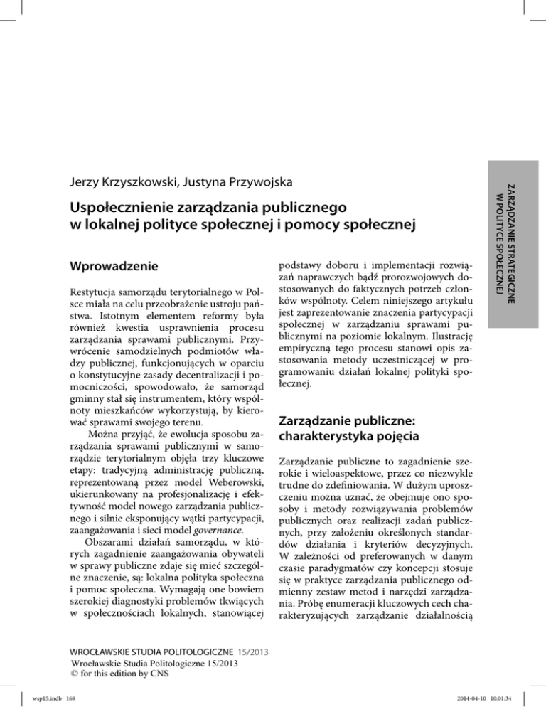 Uspołecznienie zarządzania publicznego w lokalnej polityce społecznej i pomocy społecznej Wprowadzenie Restytucja samorządu terytorialnego w Polsce miała na celu przeobrażenie ustroju państwa. Istotnym elementem reformy była również kwestia usprawnienia procesu zarządzania sprawami publicznymi. Przywrócenie samodzielnych podmiotów władzy publicznej, funkcjonujących w oparciu o konstytucyjne zasady decentralizacji i pomocniczości, spowodowało, że samorząd gminny stał się instrumentem, który wspólnoty mieszkańców wykorzystują, by kierować sprawami swojego terenu. Można przyjąć, że ewolucja sposobu zarządzania sprawami publicznymi w samorządzie terytorialnym objęła trzy kluczowe etapy: tradycyjną administrację publiczną, reprezentowaną przez model Weberowski, ukierunkowany na profesjonalizację i efektywność model nowego zarządzania publicznego i silnie eksponujący wątki partycypacji, zaangażowania i sieci model governance. Obszarami działań samorządu, w których zagadnienie zaangażowania obywateli w sprawy publiczne zdaje się mieć szczególne znaczenie, są: lokalna polityka społeczna i pomoc społeczna. Wymagają one bowiem szerokiej diagnostyki problemów tkwiących w społecznościach lokalnych, stanowiącej podstawy doboru i implementacji rozwiązań naprawczych bądź prorozwojowych dostosowanych do faktycznych potrzeb członków wspólnoty. Celem niniejszego artykułu jest zaprezentowanie znaczenia partycypacji społecznej w zarządzaniu sprawami publicznymi na poziomie lokalnym. Ilustrację empiryczną tego procesu stanowi opis zastosowania metody uczestniczącej w programowaniu działań lokalnej polityki społecznej. ZARZĄDZANIE STRATEGICZNE W POLITYCE SPOŁECZNEJ Jerzy Krzyszkowski, Justyna Przywojska Zarządzanie publiczne: charakterystyka pojęcia Zarządzanie publiczne to zagadnienie szerokie i wieloaspektowe, przez co niezwykle trudne do zdefiniowania. W dużym uproszczeniu można uznać, że obejmuje ono sposoby i metody rozwiązywania problemów publicznych oraz realizacji zadań publicznych, przy założeniu określonych standardów działania i kryteriów decyzyjnych. W zależności od preferowanych w danym czasie paradygmatów czy koncepcji stosuje się w praktyce zarządzania publicznego odmienny zestaw metod i narzędzi zarządzania. Próbę enumeracji kluczowych cech charakteryzujących zarządzanie działalnością WROCŁAWSKIE STUDIA POLITOLOGICZNE 15/2013 Wrocławskie Studia Politologiczne 15/2013 © for this edition by CNS wsp15.indb 169 2014-04-10 10:01:34 ZARZĄDZANIE STRATEGICZNE W POLITYCE SPOŁECZNEJ 170 sektora publicznego podjęła Aldona Frączkiewicz-Wronka, wskazując na: • istnienie wielu interesariuszy, często o konfliktowych interesach i poglądach; • dużą siłę oddziaływania interesariuszy mających znaczącą władzę; • decyzje podejmowane rzadko w sposób racjonalny, rzeczowo i metodologicznie wskutek działania w silnie upolitycznionym otoczeniu; • brak zysku jako miary efektywności przy równoczesnym ocenianiu z punktu widzenia preferencji obywatelskich, interesów politycznych oraz wyborów legislacyjnych; • mniejszą podatność uczestników na bodźce monetarne; • konieczność przełamywania barier instytucjonalnych1. Jak słusznie zauważa cytowana autorka, zarządzanie publiczne cechują silne więzi ze sferą praktyczną, co powoduje, iż rozpatruje się je często w ujęciu dynamicznym. Jest ono w tym wypadku rozumiane jako poszukiwanie efektywnej organizacji procesu realizacji projektów, programów czy szerzej — polityk publicznych, postrzeganych jako działania zaspokajające istotne potrzeby społeczne. Sam termin „zarządzanie publiczne” może być rozumiany jako zarządzanie w sektorze publicznym (podejście przedmiotowe) lub jako zarządzanie sprawami publicznymi (podejście podmiotowe). W odniesieniu do podejścia przedmiotowego należy rozumieć powyższe stwierdzenie jako koncentrowanie się na naturze działalności charakterystycznej dla sektora publicznego. Rodzaj aktywności sugeruje dobór metod i narzędzi zarządzania. Z kolei podejście podmiotowe do zarządzania publicznego wywodzi się z natury problemów stawianych do rozwiązania, będących rezultatem złożoności instytucjonalnej i niepewności decyzyjnej sektora publicznego, wynikającej przede wszystkim z: • hierarchicznej struktury instytucji sektora publicznego i odmienności interesów i preferencji jej składowych; 1 • przekształceń oraz zmienności otoczenia, które wyzwalają nowe potrzeby społeczne, a w efekcie nowe standardy usług publicznych; • braku spójności celów stawianych w ramach sektora, często w efekcie jego nadmiernego upolitycznienia2. Warto również przytoczyć ujęcie Barbary Kożuch, w którym zarządzanie publiczne rozumiane jest jako dyscyplina naukowa zajmująca się badaniem sposobów i zakresu harmonizowania działań, które zapewniają prawidłowe wyznaczanie celów organizacji tworzących sferę publiczną oraz optymalne wykorzystanie możliwości zorganizowanego działania ludzi, nakierowanego na kreowanie publicznych wartości oraz na realizację interesu publicznego3. Z kolei Eugeniusz Wojciechowski4 w rozważaniach na temat zarządzania publicznego tak wyjaśnia istotę tego procesu rozpatrywanego w skali lokalnej: zarządzanie oznacza zespół działań podejmowanych w celu wywołania pożądanego przebiegu procesów i zjawisk w obrębie samorządu terytorialnego. Służy ono także kształtowaniu zachowań osób i innych podmiotów, a charakteryzuje się następującymi właściwościami: • jest typowym procesem informacyjnym; • ma charakter pracy kierowniczej i zespołowej; • stanowi system działań regulowanych zgodnie z przyjętymi celami, jest procesem koordynacyjnym, harmonizującym działania różnych osób, instytucji i podmiotów gospodarczych. Cytowany autor podkreśla również, że przyjęty przez niego sposób defi