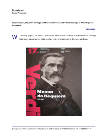 Aktualności Z życia Ambasady Nadzwyczajne „Requiem” Verdiego pod kierownictwem Maestro Pendereckiego w Wielki Piątek w Warszawie 29/03/2013 W ostatny piątek, 29 marca, prestiżowy Wielkanocny Festiwal Beethovenowski, którego tegoroczna edycja jest już siedemnastą z kolei, zwieńczy muzyka Giuseppe Verdiego. Biuro prasowe, Ambasada Włoch w Warszawie, Pl. Dąbrowskiego 6, 00-055 Warszawa, Tel. +48 22 826 34 71 W roku poświęconym uroczystym obchodom 200. rocznicy urodzin włoskiego kompozytora, warszawski Festiwal Beethovenowski, jeden z najważniejszych festiwali muzycznych w Europie, zakończył – również dzięki Ambasadzie Włoch w Polsce – nadzwyczajnym i niepowtarzalnym wykonaniem „Requiem” Verdiego, które poprowadzi jeden z największych współczesnych kompozytorów i dyrygentów, Krzysztof Penderecki. W partiach solistów wystąpią takie sławy jak Maria Luigia Borsi (sopran), Tea Demurishivili (mezzosopran), Francesco Demuro (tenor) i Nikolay Didenko (bas), towarzyszyć im była Orkiestra Symfoniczna i Chór Filharmonii Narodowej w Warszawie. Koncert, który z racji swojej wyjątkowości był transmitowany na żywo przez Polskie Radio, został objęty wyłącznym patronatem Ambasadora Włoch w Polsce, J.E. Riccardo Guariglia. Ufficio Stampa, Ambasciata d’Italia a Varsavia, Pl. Dąbrowskiego 6, 00-055 Warszawa, Tel. +48 22 826 34 71 Ufficio Stampa, Ambasciata d’Italia a Varsavia, Pl. Dąbrowskiego 6, 00-055 Warszawa, Tel. +48 22 826 34 71 Ufficio Stampa, Ambasciata d’Italia a Varsavia, Pl. Dąbrowskiego 6, 00-055 Warszawa, Tel. +48 22 826 34 71
