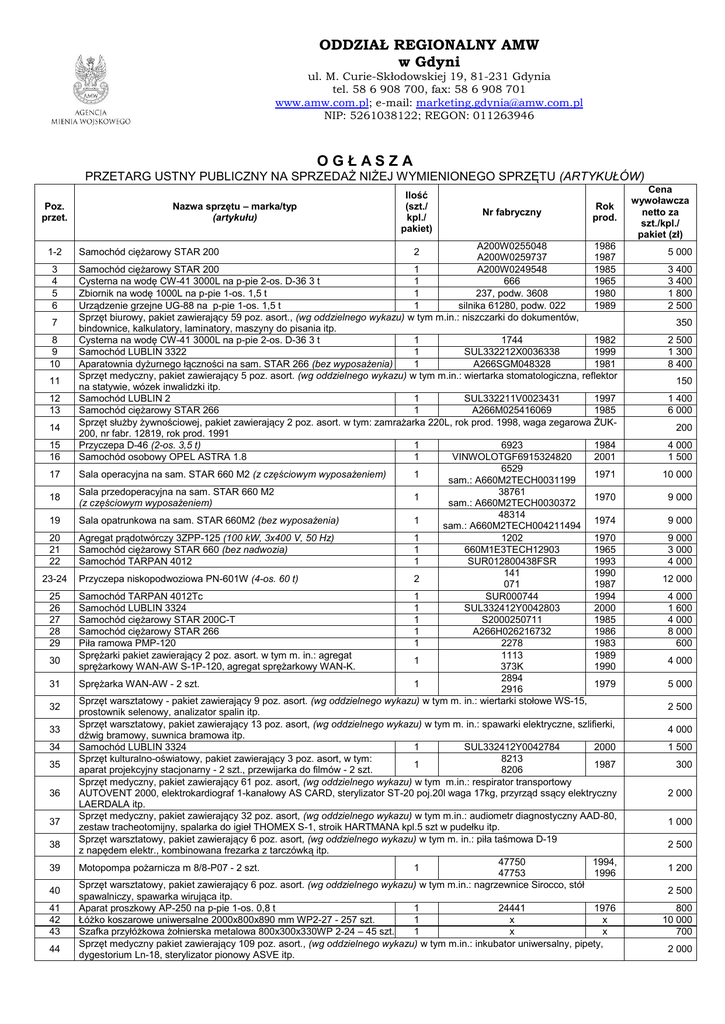 ODDZIAŁ REGIONALNY AMW w Gdyni ul. M. Curie-Skłodowskiej 19, 81-231 Gdynia tel. 58 6 908 700, fax: 58 6 908 701 www.amw.com.pl; e-mail: [email protected] NIP: 5261038122; REGON: 011263946 OGŁASZA PRZETARG USTNY PUBLICZNY NA SPRZEDAŻ NIŻEJ WYMIENIONEGO SPRZĘTU (ARTYKUŁÓW) Poz. przet. 1-2 3 4 5 6 7 8 9 10 11 12 13 14 15 16 17 18 19 20 21 22 23-24 25 26 27 28 29 30 31 32 33 34 35 36 37 38 39 40 41 42 43 44 Nazwa sprzętu – marka/typ (artykułu) Ilość (szt./ kpl./ pakiet) Nr fabryczny Rok prod. A200W0255048 1986 A200W0259737 1987 Samochód ciężarowy STAR 200 1 A200W0249548 1985 Cysterna na wodę CW-41 3000L na p-pie 2-os. D-36 3 t 1 666 1965 Zbiornik na wodę 1000L na p-pie 1-os. 1,5 t 1 237, podw. 3608 1980 Urządzenie grzejne UG-88 na p-pie 1-os. 1,5 t 1 silnika 61280, podw. 022 1989 Sprzęt biurowy, pakiet zawierający 59 poz. asort., (wg oddzielnego wykazu) w tym m.in.: niszczarki do dokumentów, bindownice, kalkulatory, laminatory, maszyny do pisania itp. Cysterna na wodę CW-41 3000L na p-pie 2-os. D-36 3 t 1 1744 1982 Samochód LUBLIN 3322 1 SUL332212X0036338 1999 Aparatownia dyżurnego łączności na sam. STAR 266 (bez wyposażenia) 1 A266SGM048328 1981 Sprzęt medyczny, pakiet zawierający 5 poz. asort. (wg oddzielnego wykazu) w tym m.in.: wiertarka stomatologiczna, reflektor na statywie, wózek inwalidzki itp. Samochód LUBLIN 2 1 SUL332211V0023431 1997 Samochód ciężarowy STAR 266 1 A266M025416069 1985 Sprzęt służby żywnościowej, pakiet zawierający 2 poz. asort. w tym: zamrażarka 220L, rok prod. 1998, waga zegarowa ŻUK200, nr fabr. 12819, rok prod. 1991 Przyczepa D-46 (2-os. 3,5 t) 1 6923 1984 Samochód osobowy OPEL ASTRA 1.8 1 VINWOLOTGF6915324820 2001 6529 Sala operacyjna na sam. STAR 660 M2 (z częściowym wyposażeniem) 1 1971 sam.: A660M2TECH0031199 Sala przedoperacyjna na sam. STAR 660 M2 38761 1 1970 (z częściowym wyposażeniem) sam.: A660M2TECH0030372 48314 Sala opatrunkowa na sam. STAR 660M2 (bez wyposażenia) 1 1974 sam.: A660M2TECH004211494 Agregat prądotwórczy 3ZPP-125 (100 kW, 3x400 V, 50 Hz) 1 1202 1970 Samochód ciężarowy STAR 660 (bez nadwozia) 1 660M1E3TECH12903 1965 Samochód TARPAN 4012 1 SUR012800438FSR 1993 141 1990 Przyczepa niskopodwoziowa PN-601W (4-os. 60 t) 2 071 1987 Samochód TARPAN 4012Tc 1 SUR000744 1994 Samochód LUBLIN 3324 1 SUL332412Y0042803 2000 Samochód ciężarowy STAR 200C-T 1 S2000250711 1985 Samochód ciężarowy STAR 266 1 A266H026216732 1986 Piła ramowa PMP-120 1 2278 1983 Sprężarki pakiet zawierający 2 poz. asort. w tym m. in.: agregat 1113 1989 1 sprężarkowy WAN-AW S-1P-120, agregat sprężarkowy WAN-K. 373K 1990 2894 Sprężarka WAN-AW - 2 szt. 1 1979 2916 Sprzęt warsztatowy - pakiet zawierający 9 poz. asort. (wg oddzielnego wykazu) w tym m. in.: wiertarki stołowe WS-15, prostownik selenowy, analizator spalin itp. Sprzęt warsztatowy, pakiet zawierający 13 poz. asort, (wg oddzielnego wykazu) w tym m. in.: spawarki elektryczne, szlifierki, dźwig bramowy, suwnica bramowa itp. Samochód LUBLIN 3324 1 SUL332412Y0042784 2000 Sprzęt kulturalno-oświatowy, pakiet zawierający 3 poz. asort, w tym: 8213 1 1987 aparat projekcyjny stacjonarny - 2 szt., przewijarka do filmów - 2 szt. 8206 Sprzęt medyczny, pakiet zawierający 61 poz. asort, (wg oddzielnego wykazu) w tym m.in.: respirator transportowy AUTOVENT 2000, elektrokardiograf 1-kanałowy AS CARD, sterylizator ST-20 poj.20l waga 17kg, przyrząd ssący elektryczny LAERDALA itp. Sprzęt medyczny, pakiet zawierający 32 poz. asort, (wg oddzielnego wykazu) w tym m.in.: audiometr diagnostyczny AAD-80, zestaw tracheotomijny, spalarka do igieł THOMEX S-1, stroik HARTMANA kpl.5 szt w pudełku itp. Sprzęt warsztatowy, pakiet zawierający 6 poz. asort, (wg oddzielnego wykazu) w tym m. in.: piła taśmowa D-19 z napędem elektr., kombinowana frezarka z tarczówką itp. 47750 1994, Motopompa pożarnicza m 8/8-P07 - 2 szt. 1 47753 1996 Sprzęt warsztatowy, pakiet zawierający 6 poz. asort. (wg oddzielnego wykazu) w tym m.in.: nagrzewnice Sirocco, stół spawalniczy, spawarka wirująca itp. Aparat proszkowy AP-250 na p-pie 1-os. 0,8 t 1 24441 1976 Łóżko koszarowe uniwersalne 2000x800x890 mm WP2-27 - 257 szt. 1 x x Szafka przyłóżkowa żołnierska metalowa 800x300x330WP 2-24 – 45 szt. 1 x x Sprzęt medyczny pakiet zawierający 109 poz. asort., (wg oddzielnego wykazu) w tym m.in.: inkubator uniwersalny, pipety, dygestorium Ln-18, sterylizator pionowy ASVE itp. Samochód ciężarowy STAR 200 2 Cena wywoławcza netto za szt./kpl./ pakiet (zł) 5 000 3 400 3 400 1 800 2 500 350 2 500 1 300 8 400 150 1 400 6 000 200 4 000 1 500 10 000 9 000 9 000 9 000 3 000 4 000 12 000 4 000 1 600 4 000 8 000 600 4 000 5 000 2 500 4 000 1 500 300 2 000 1 000 2 500 1 200 2 500 800 10 000 700 2 000 1. Przetarg odbędzie się w dniu 13.05.2016 r. o godz. 11.00 w siedzibie OR AMW w Gdyni, ul. Marii Curie-Skłodowskiej 19. 2. Mienie wystawione na przetarg dostępne jest do obejrzenia w dniach 9-10.05.2016 r. w godz. 9.00-13:00 w następujących miejscach: poz. 1-3 w JW 3775 Władysławowo, p. Kucharczyk - tel. 261 256 352/; poz. 4-6 w JW 4651 Gdynia-Babie Doły, ul. Zielona 1, poz. 4-5 p. Hinca - tel. 600 599 880, poz. 6 Pani Gil - tel. 261 268 108/; poz. 7-14 w 18 WOG Wejherowo, ul. Sobieskiego 277, poz. 7 p. Stochaj - tel. 261 251 708, poz. 8 p. Flisik - tel. 502 872 409, poz. 9 p. Różański 261 251 693, poz. 10 p. Budysz - tel. 261 251 760, poz. 11 Pani Szulc 261 251 974, poz. 12-14 p. Belak - tel. 261 251 937/; poz. 15-16 w JW Rozewie, poz. 15 p. Bałtowski - tel. 261 256 405, poz. 16 p. Nowak - tel. 261 256 475/; poz. 17-20 w JW 4653 Siemirowice, poz. 17-19 p. Kruk - tel. 261 252 462, poz. 20 p. Balcerak lub p. Janowicz 261 252 248/; poz. 21-24 w JW 4220 GZ Czarne, ul. 27-go Lutego p. Adamiec - tel. 261 467 650/; poz. 25-32 w JW 4220 GZ Lębork, ul. Obrońców Wybrzeża 1 p. Nastały - tel. 261 468 783/; poz. 33 w JW 4220 GZ Słupsk, ul. Kozietulskiego 1 p. Lemieszko - te